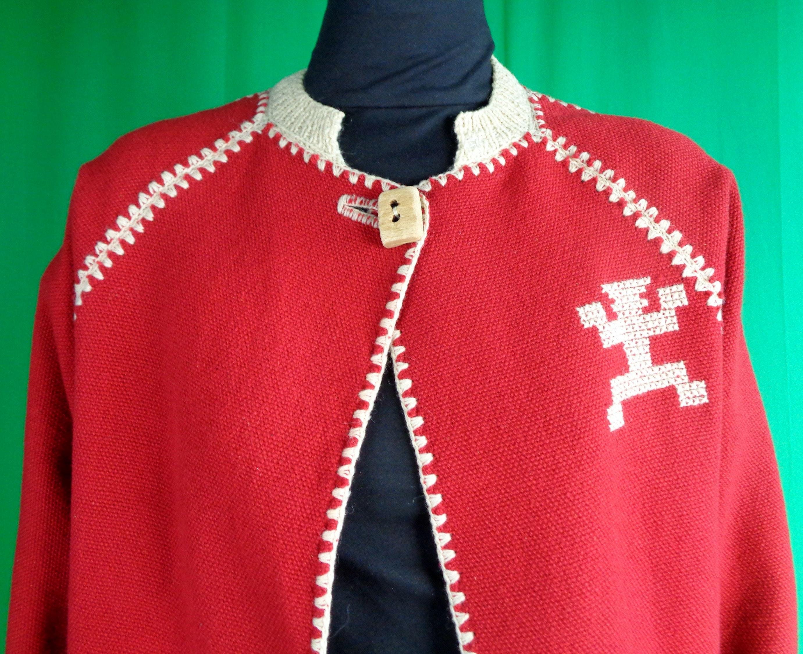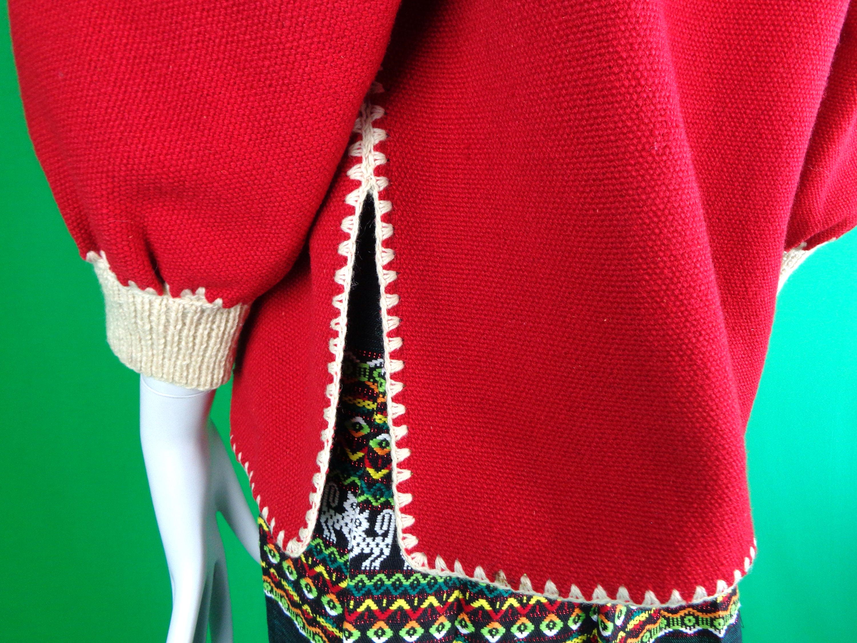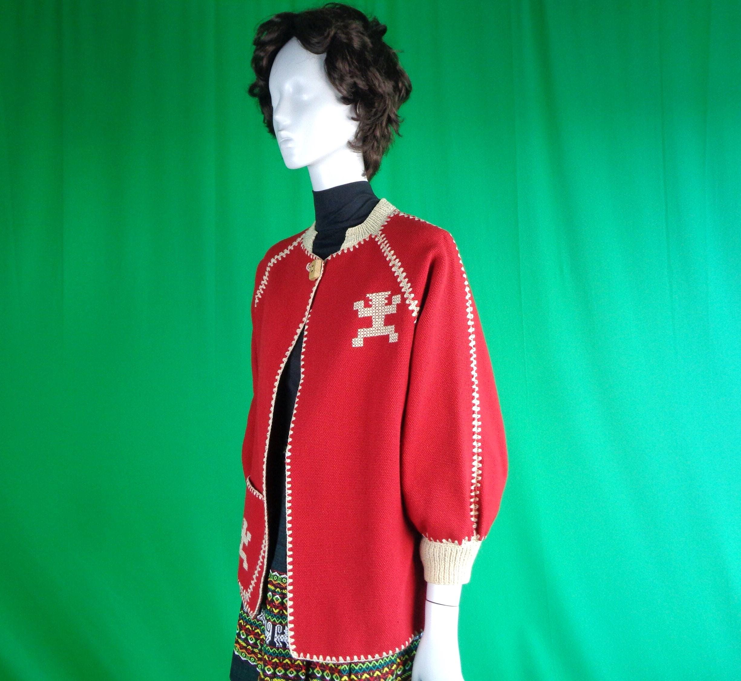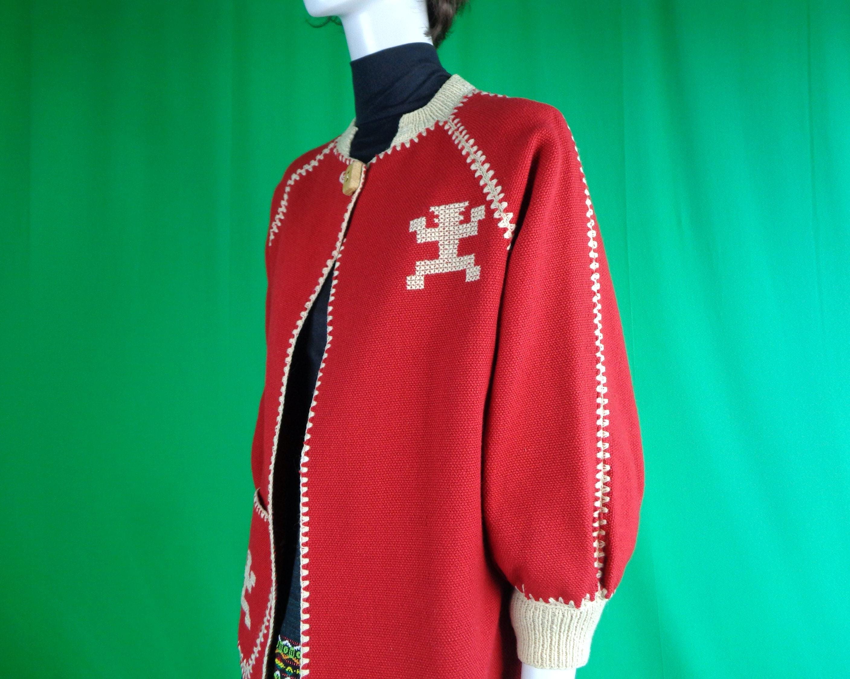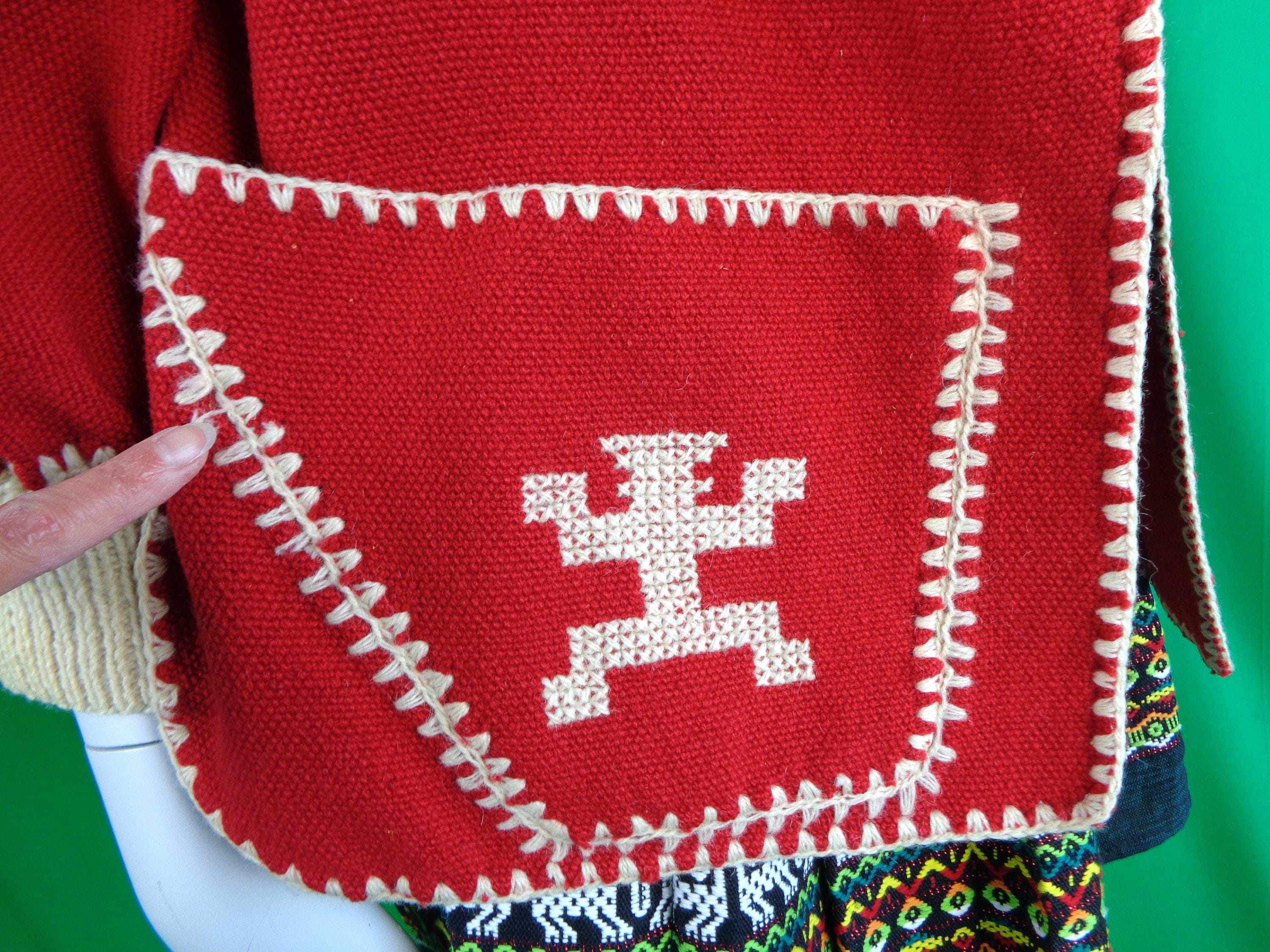 Features two different knitting pattern, designs, on the cuffs and collar and body, with 1 large square wooden top secure fly button, 1 deep side pocket, puff bishop sleeves, a tribal knit theme throughout! Great compliment piece!