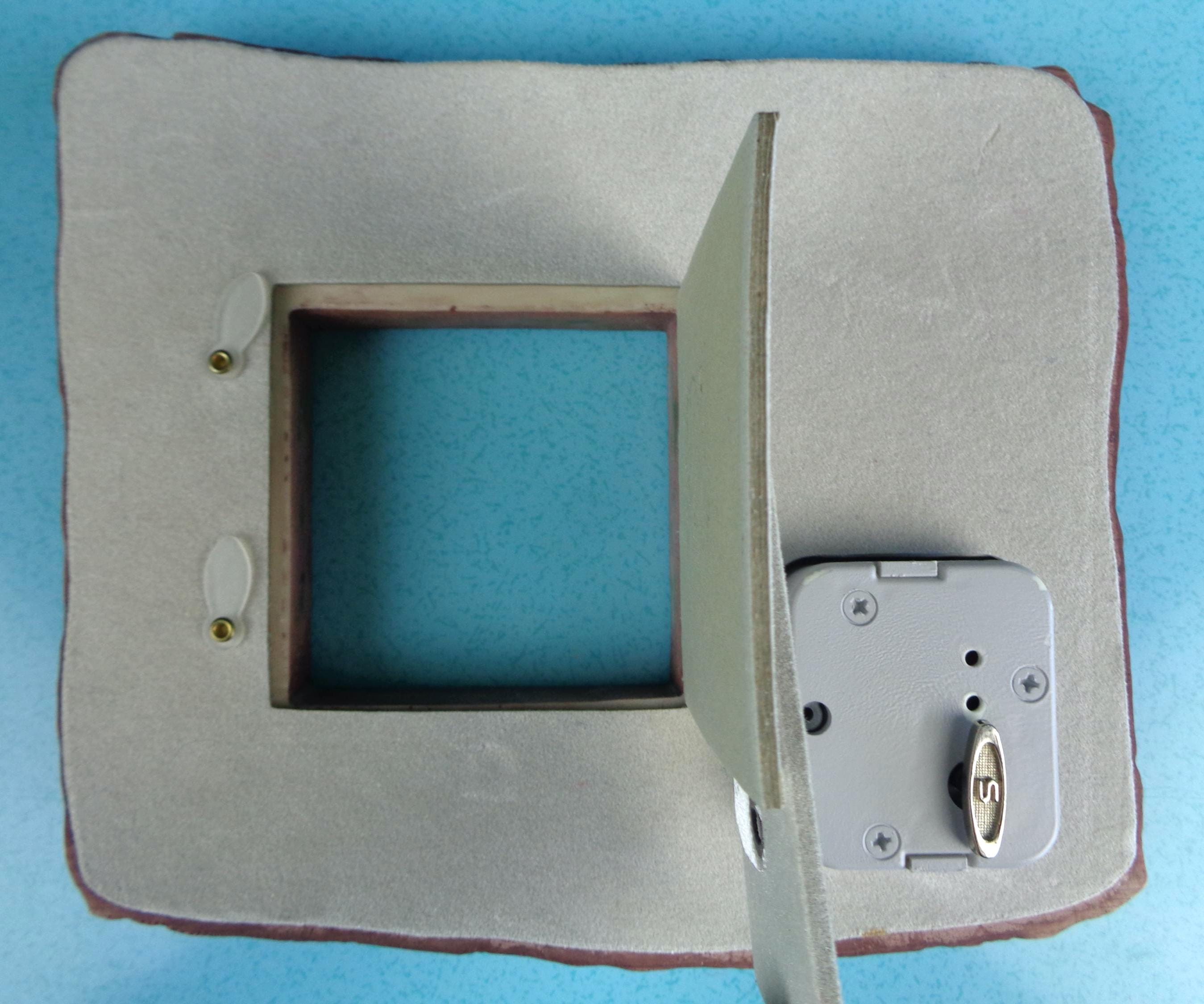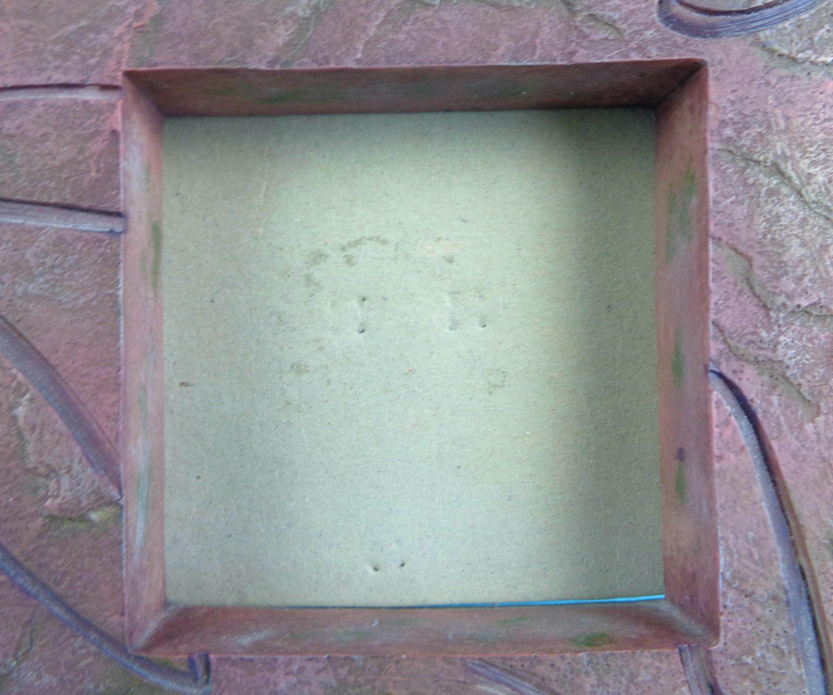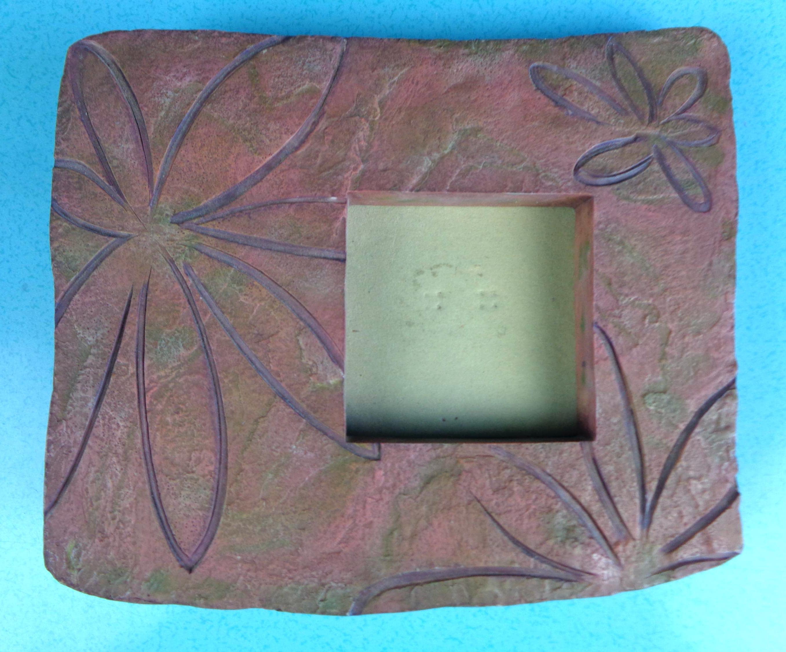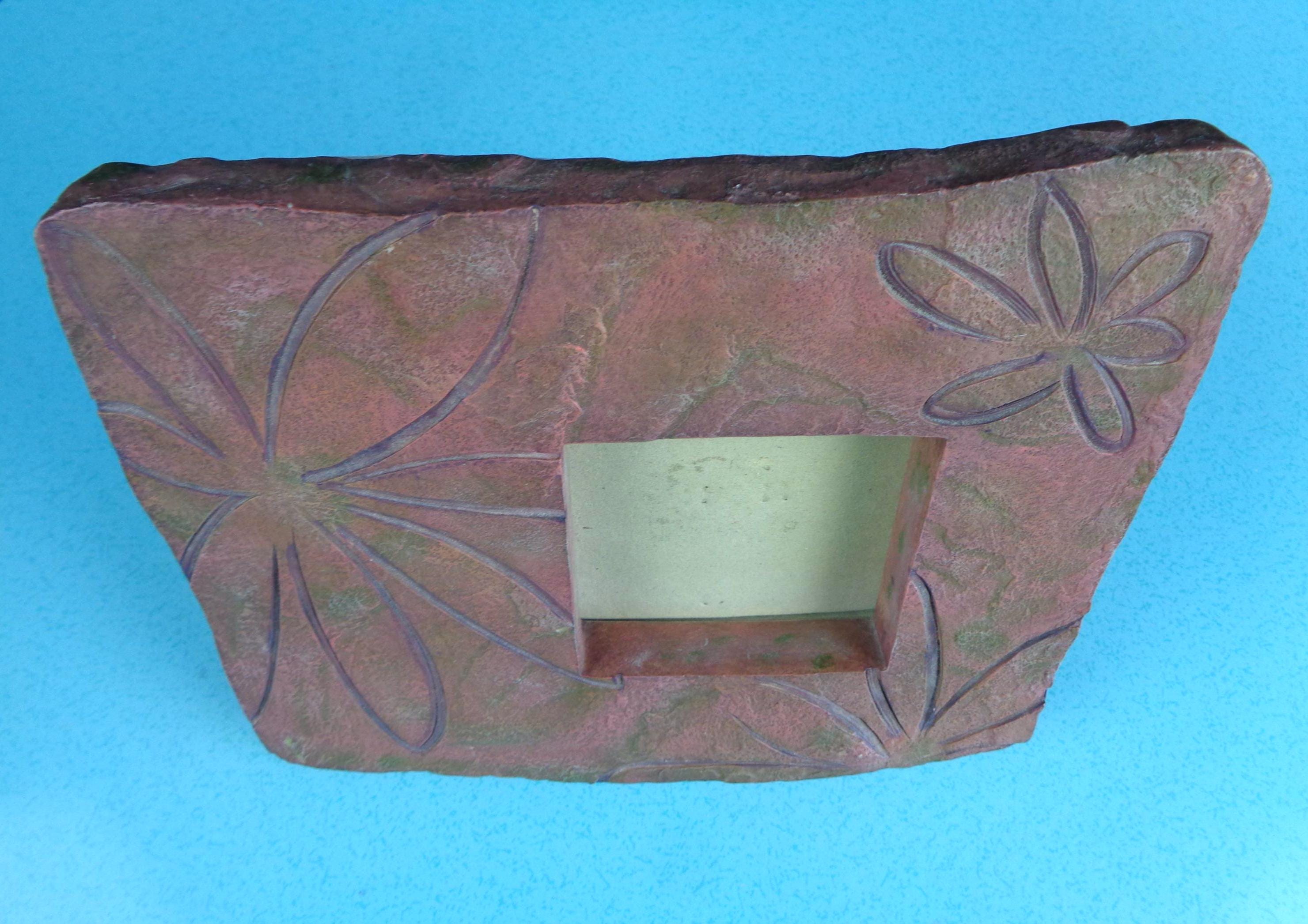 This lovely unique picture frame & music box combination: Features a 3x3 picture size, with a back music box that winds up, with a floral carving of thick rock like material! Great piece!