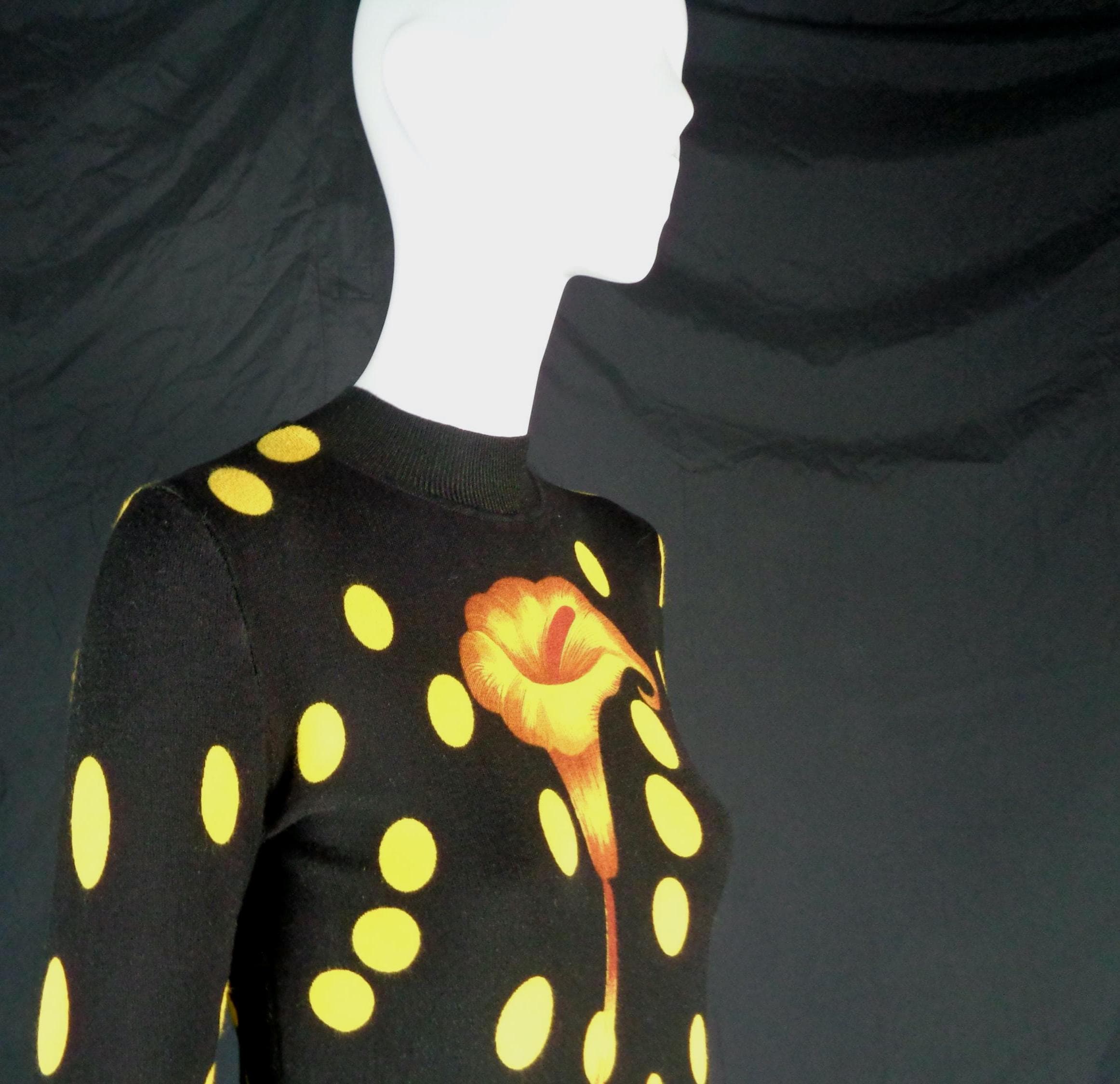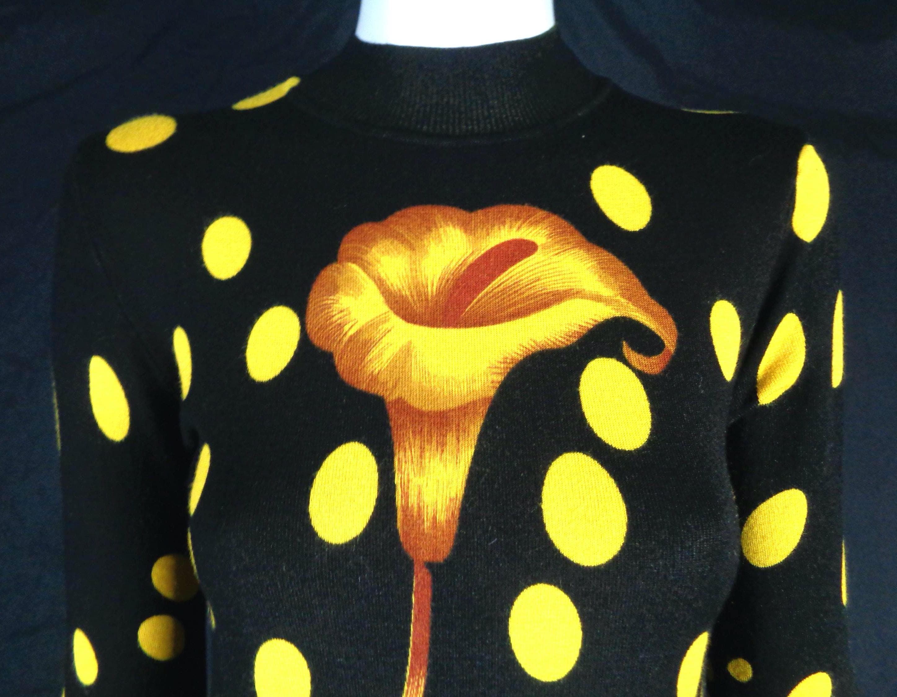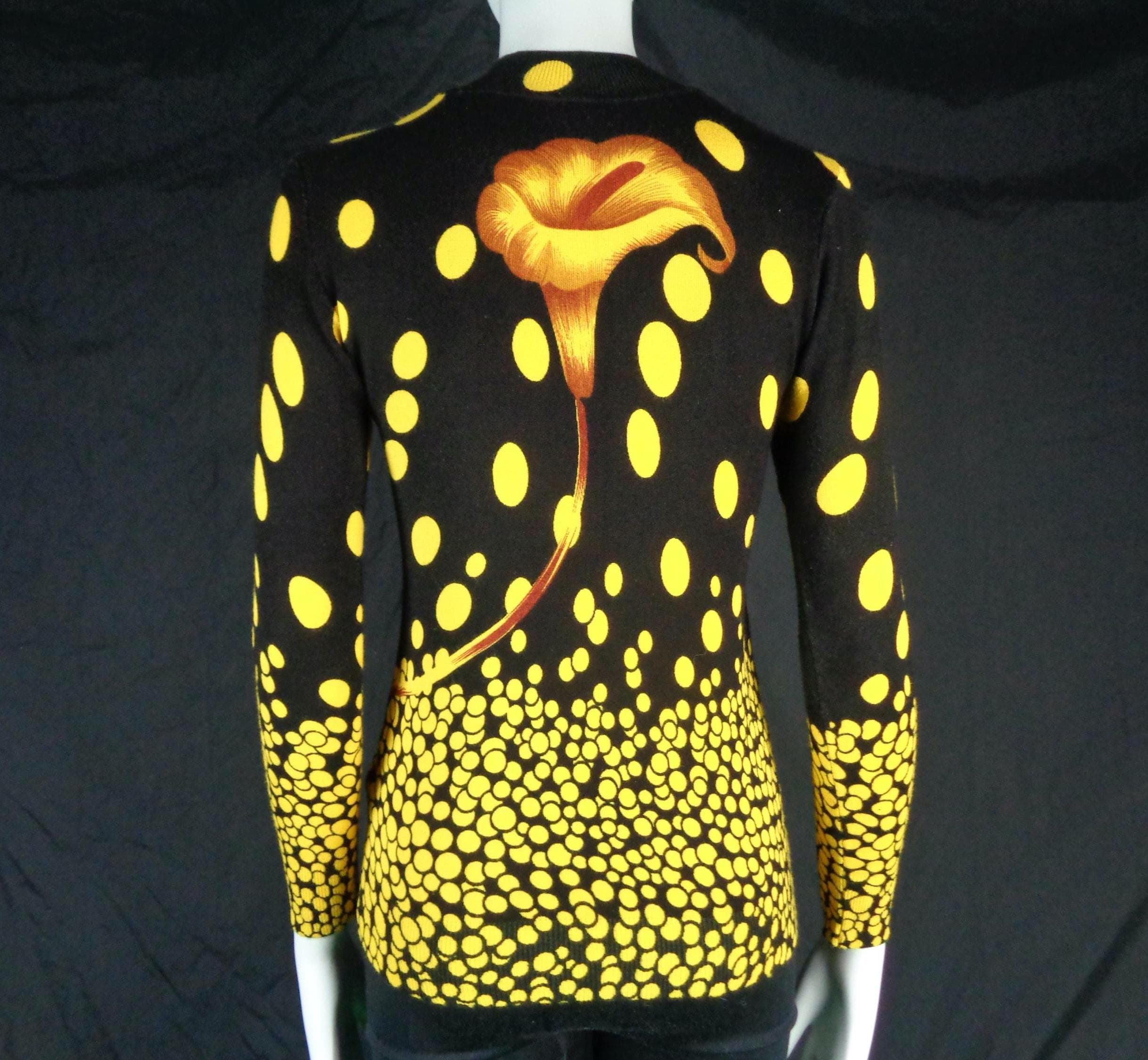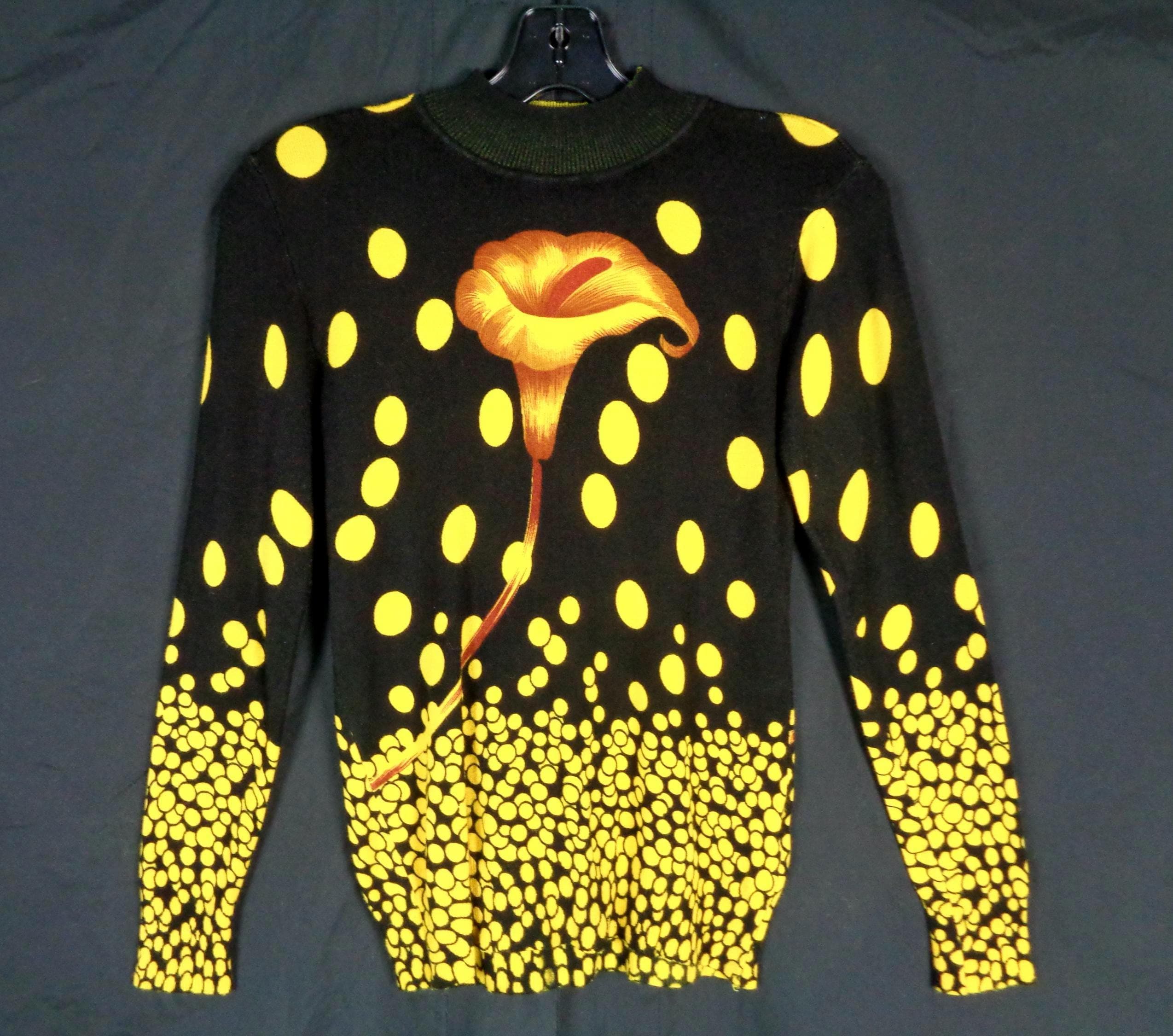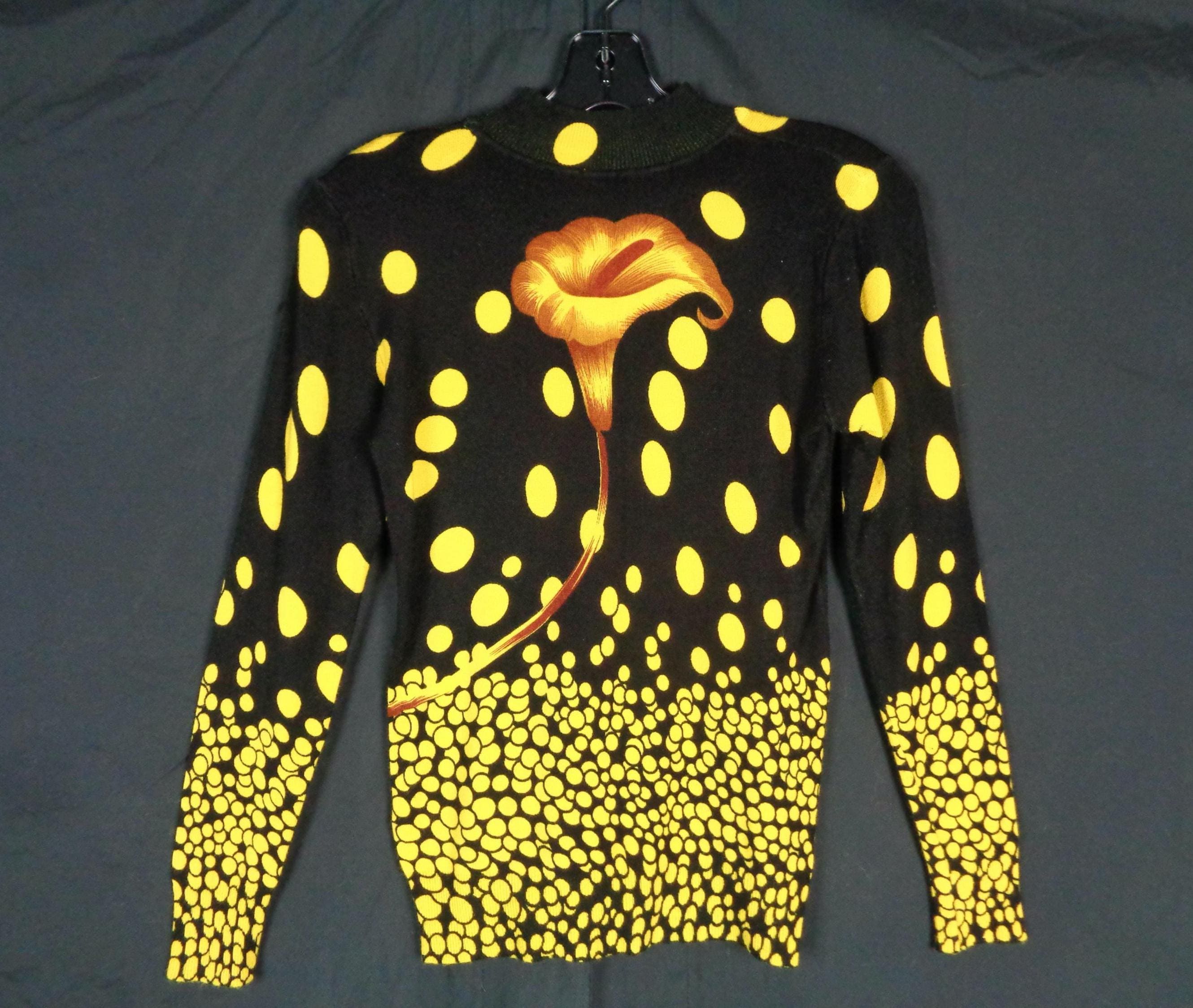 Features a large flower front center with scattered polka dots cascading allover print, a high fine ribbed collar and cuffs with soft fabric, material throughout! Great compliment piece!