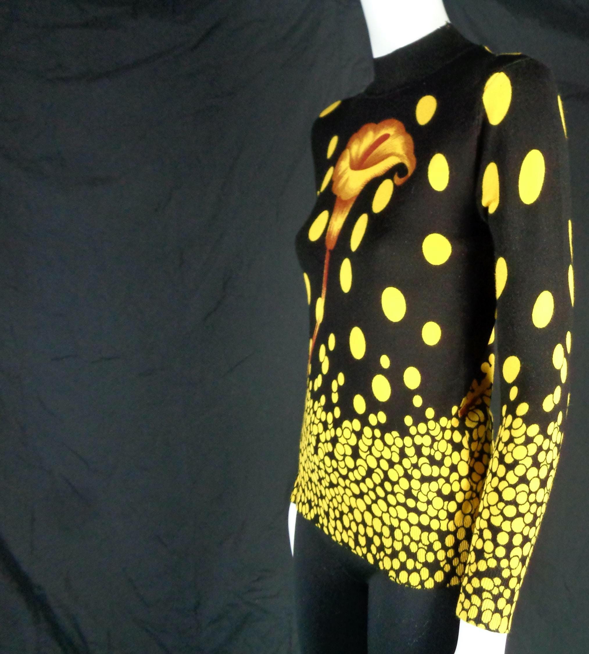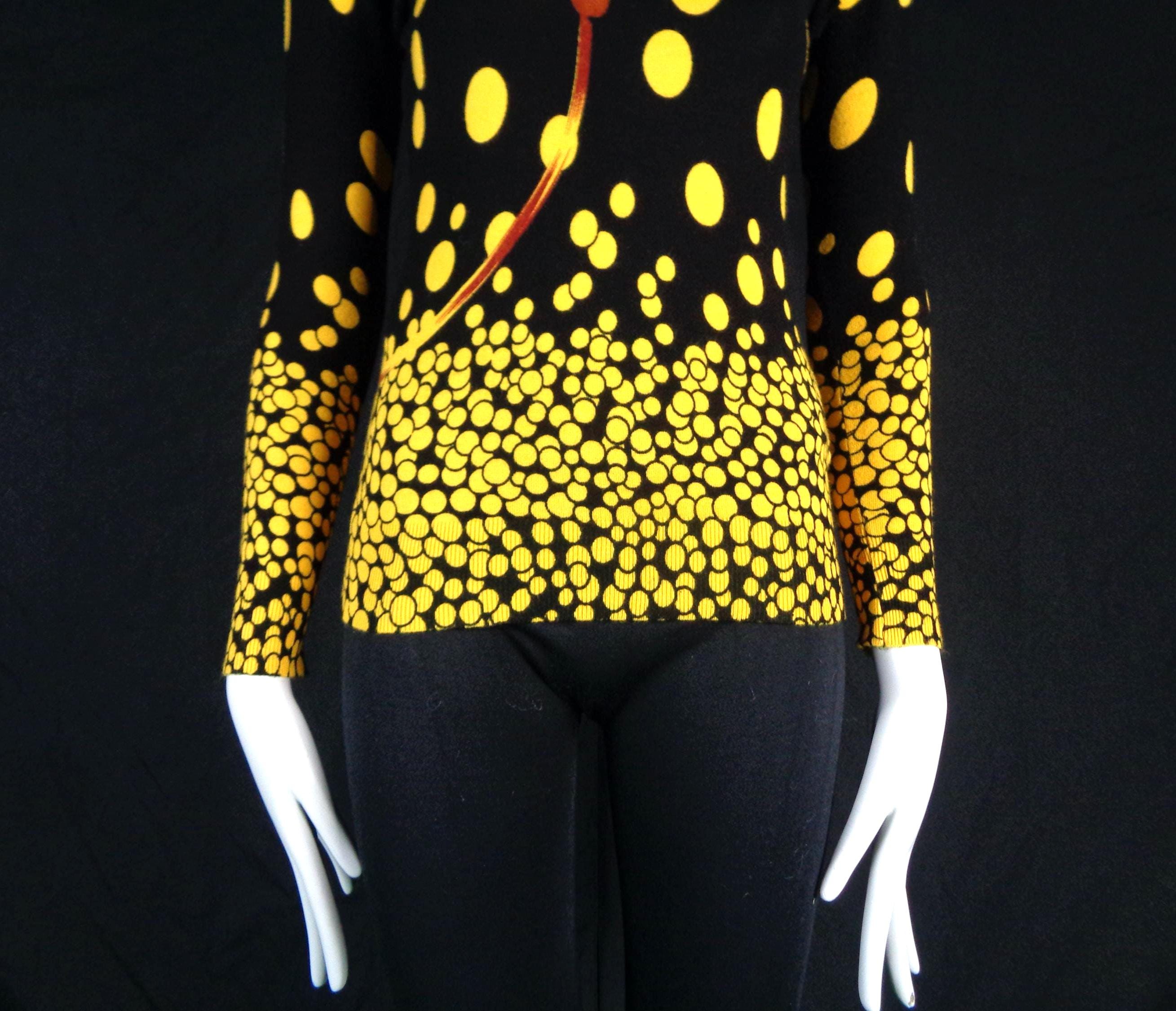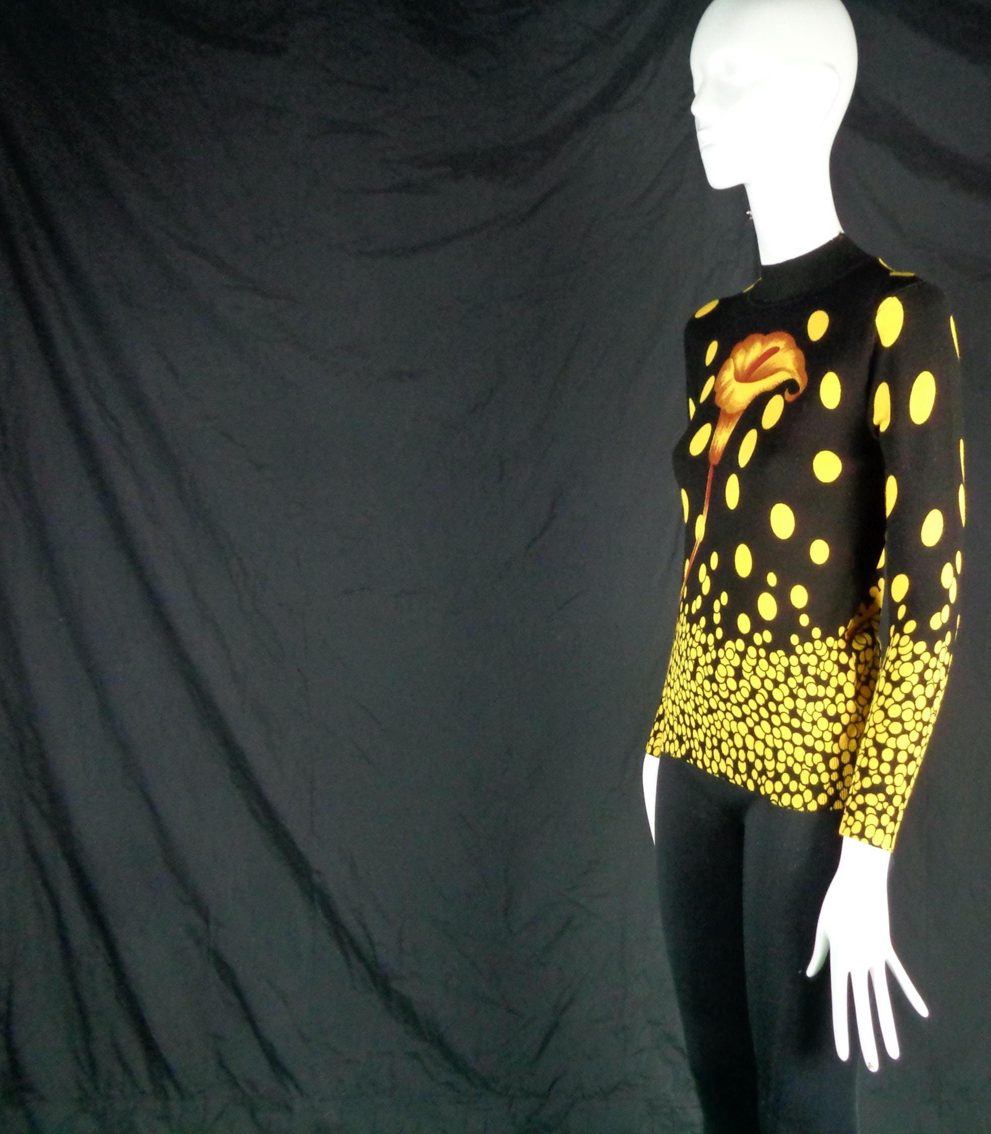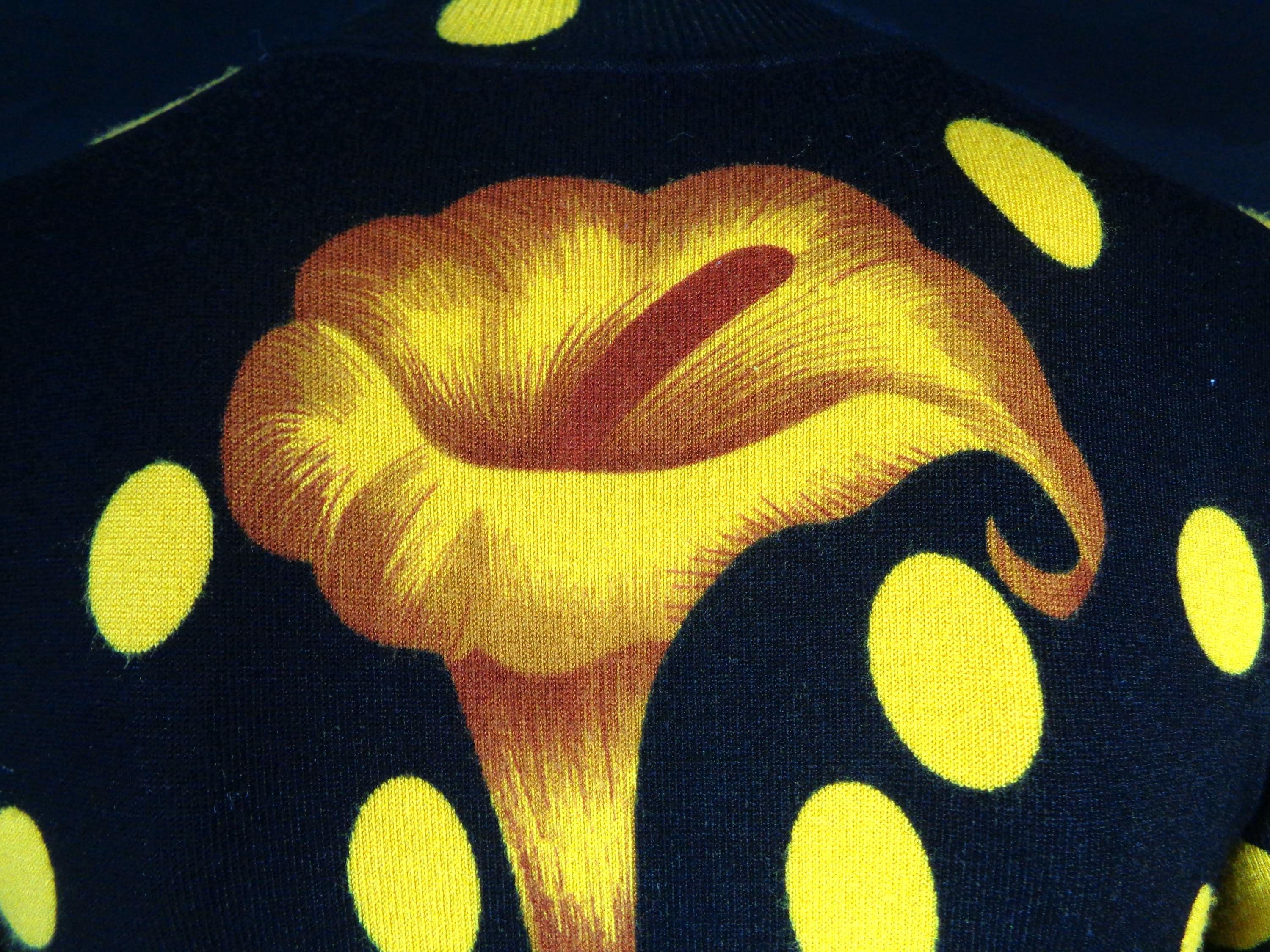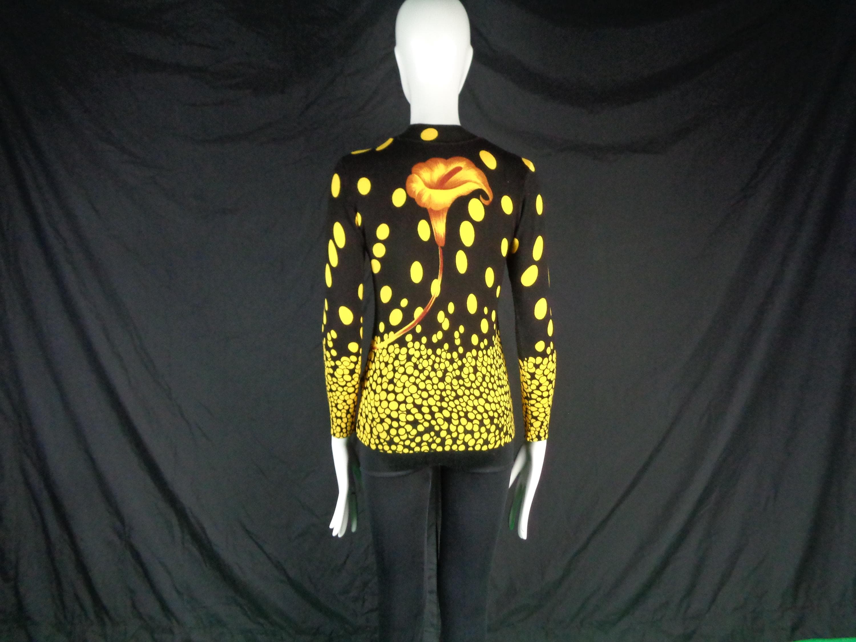 Features a large flower front center with scattered polka dots cascading allover print, a high fine ribbed collar and cuffs with soft fabric, material throughout! Great compliment piece!