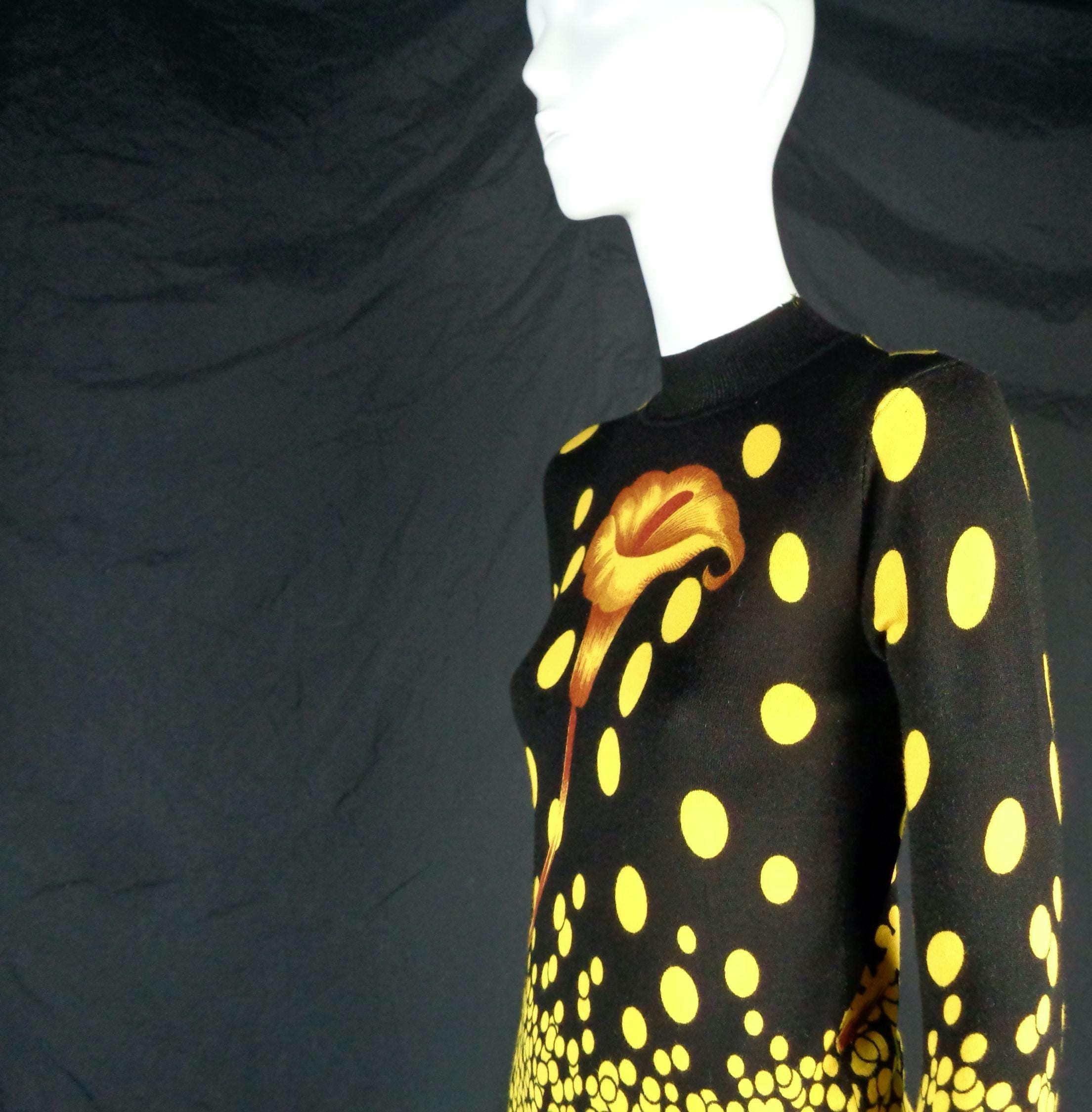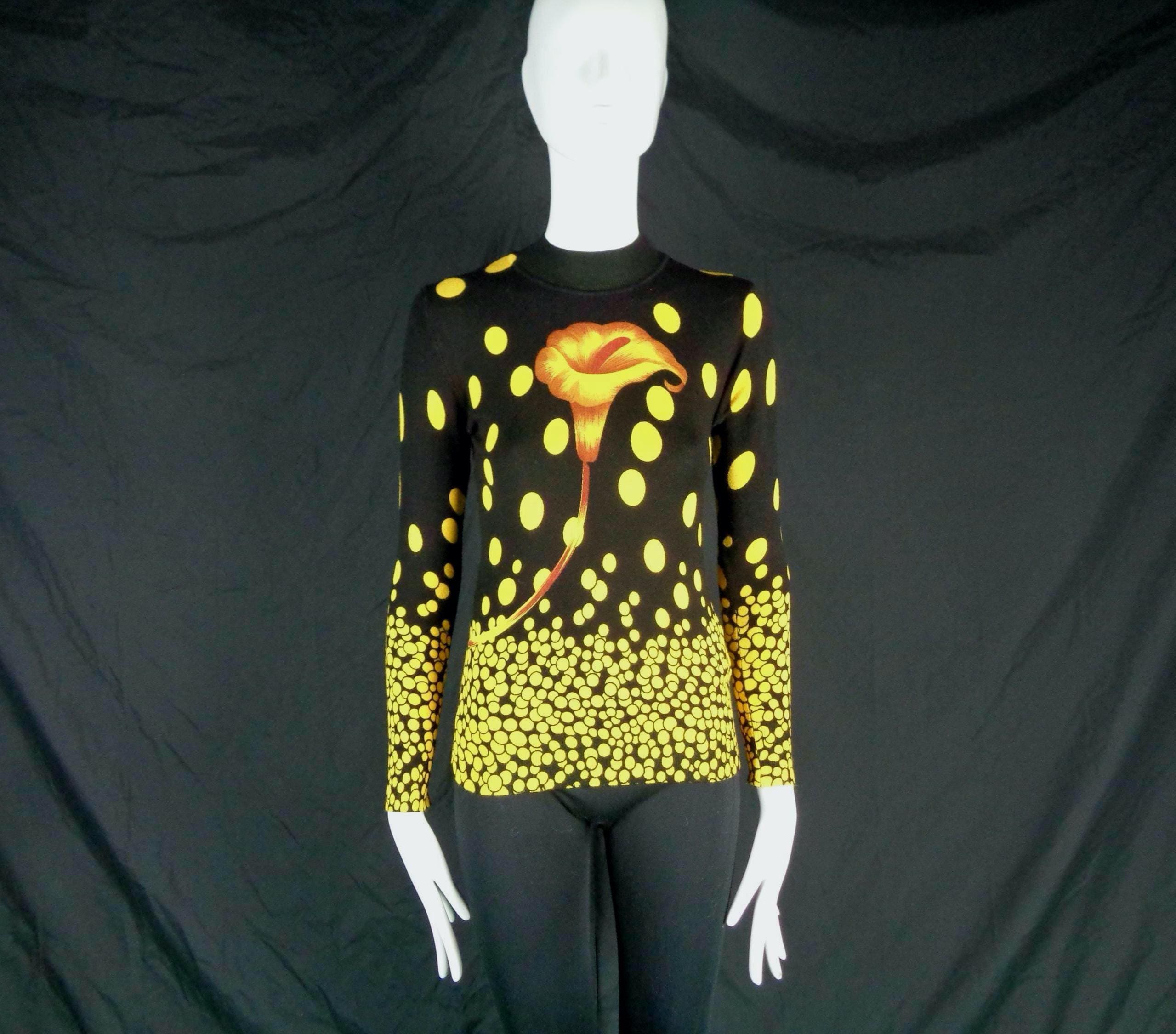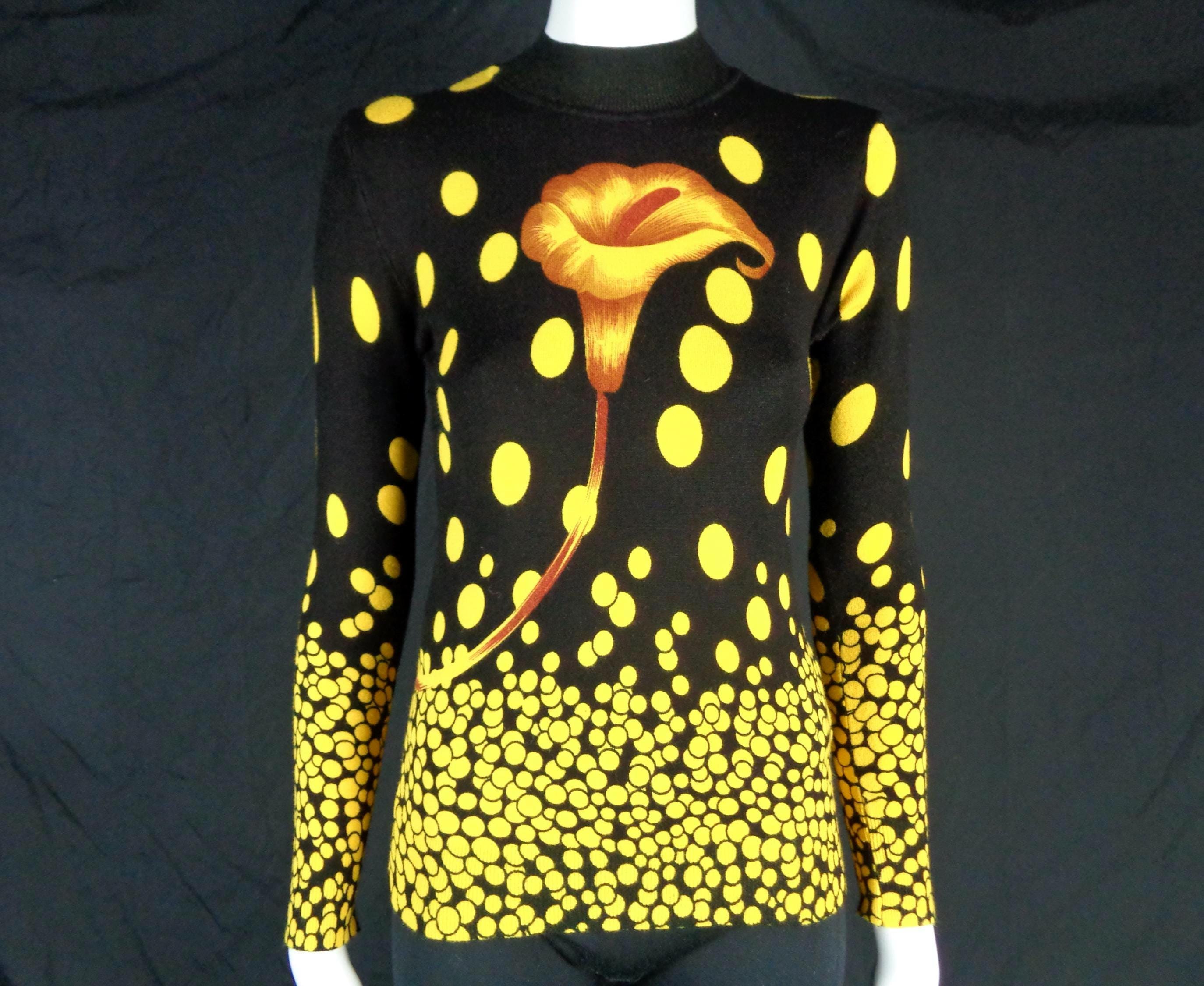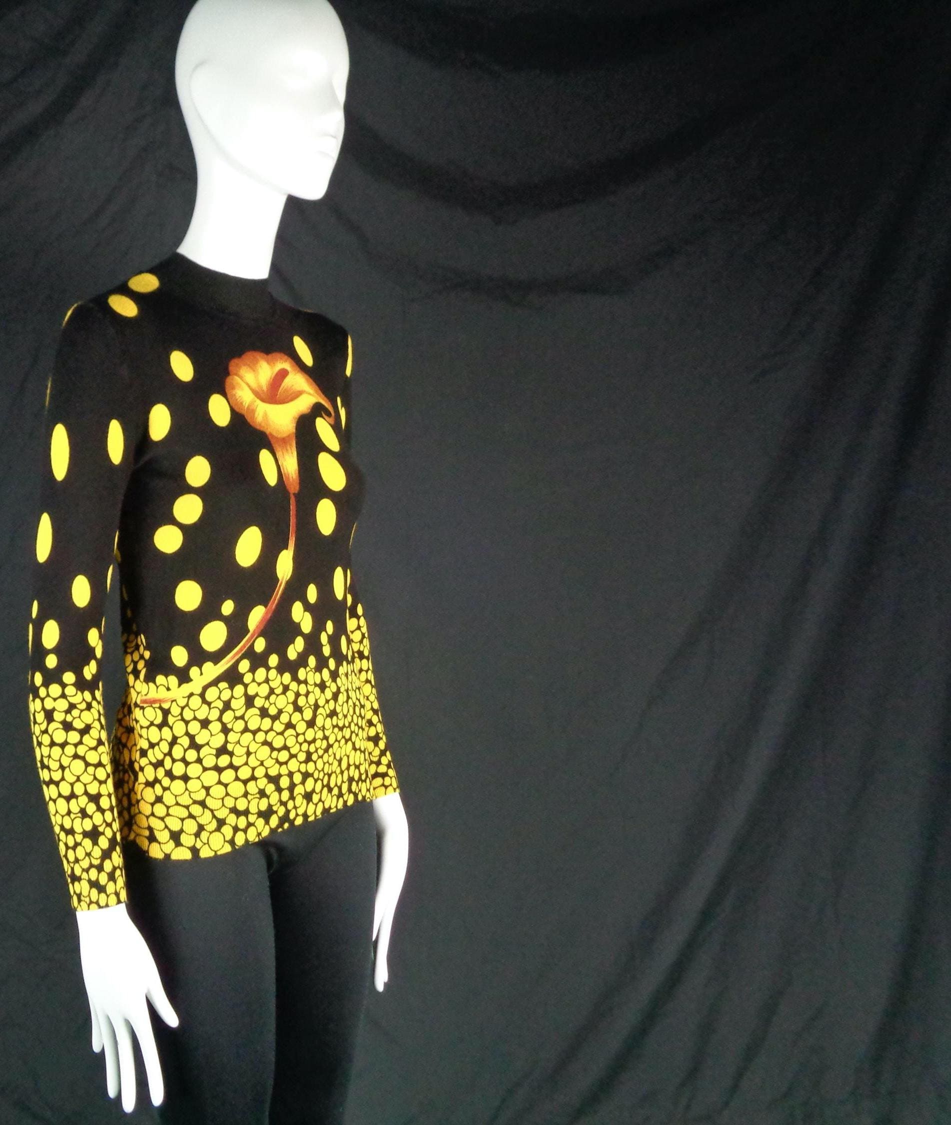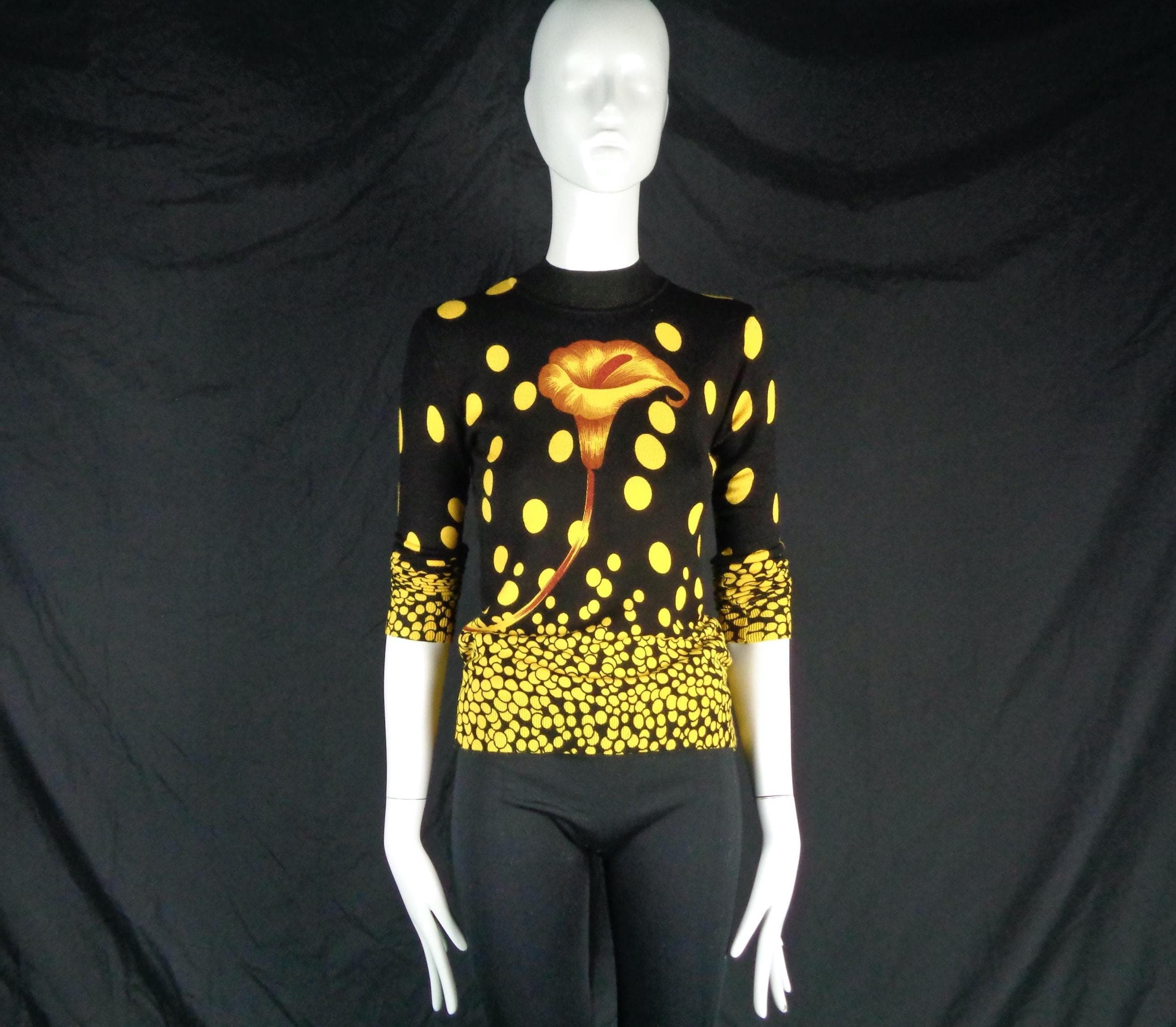 Features a large flower front center with scattered polka dots cascading allover print, a high fine ribbed collar and cuffs with soft fabric, material throughout! Great compliment piece!