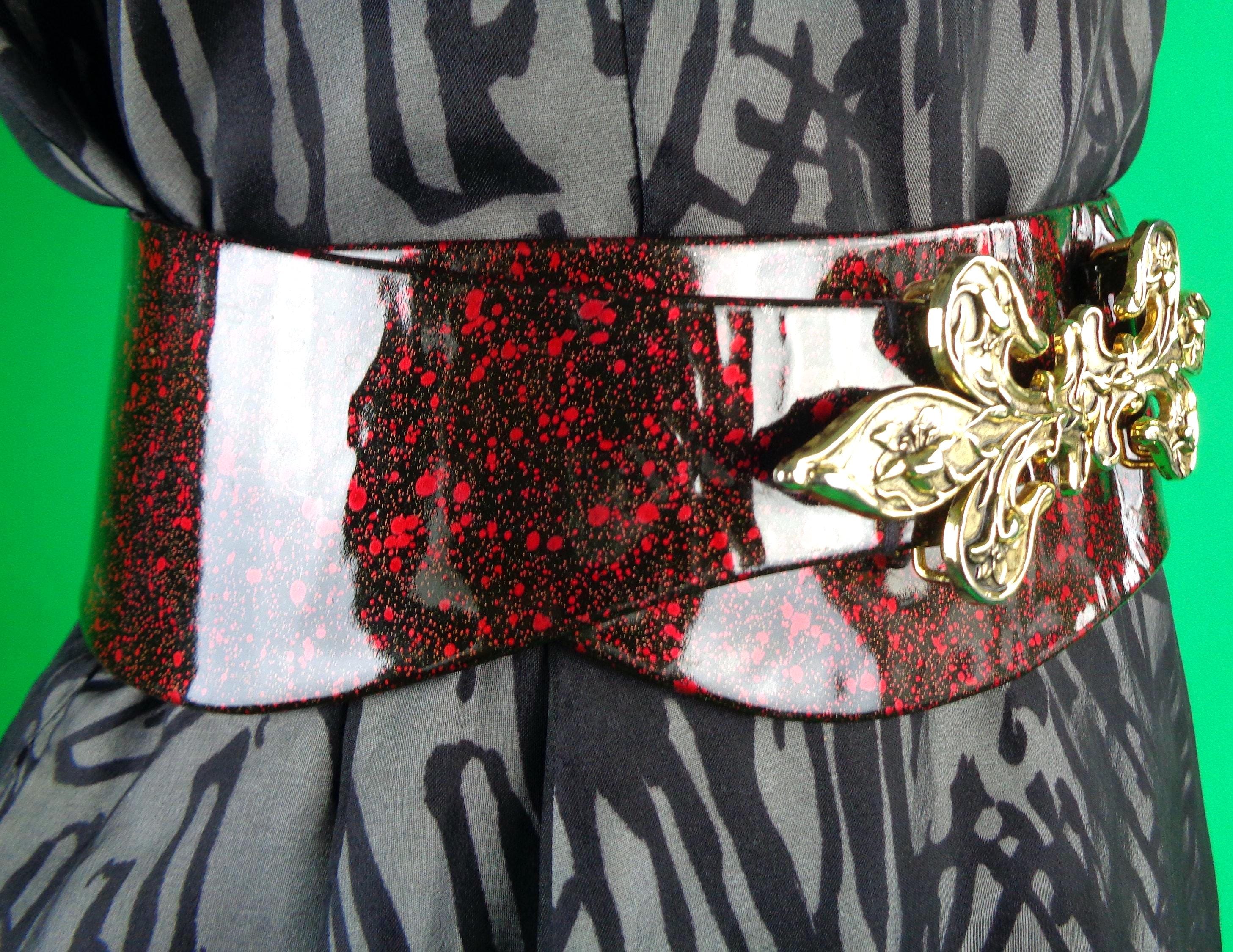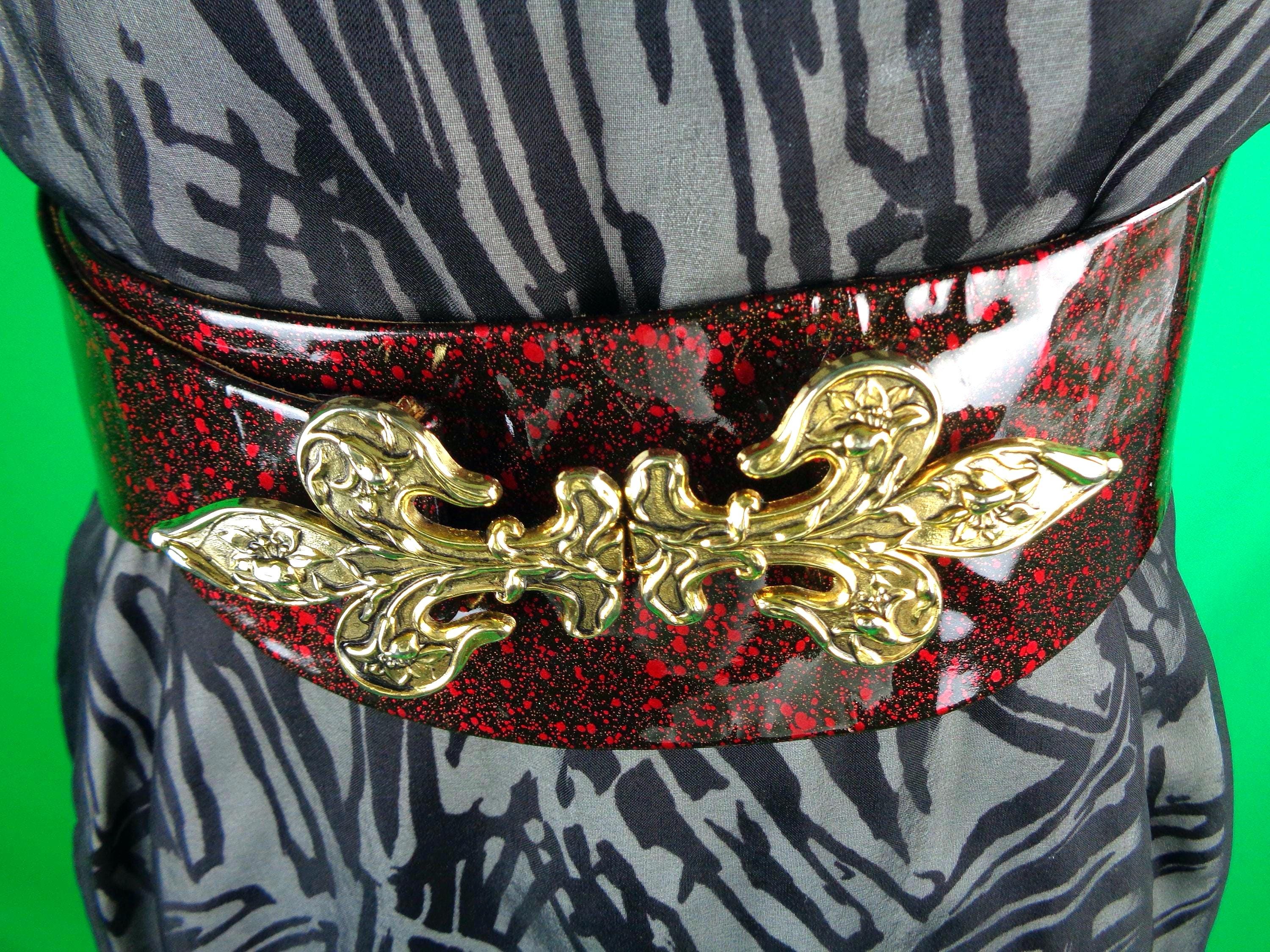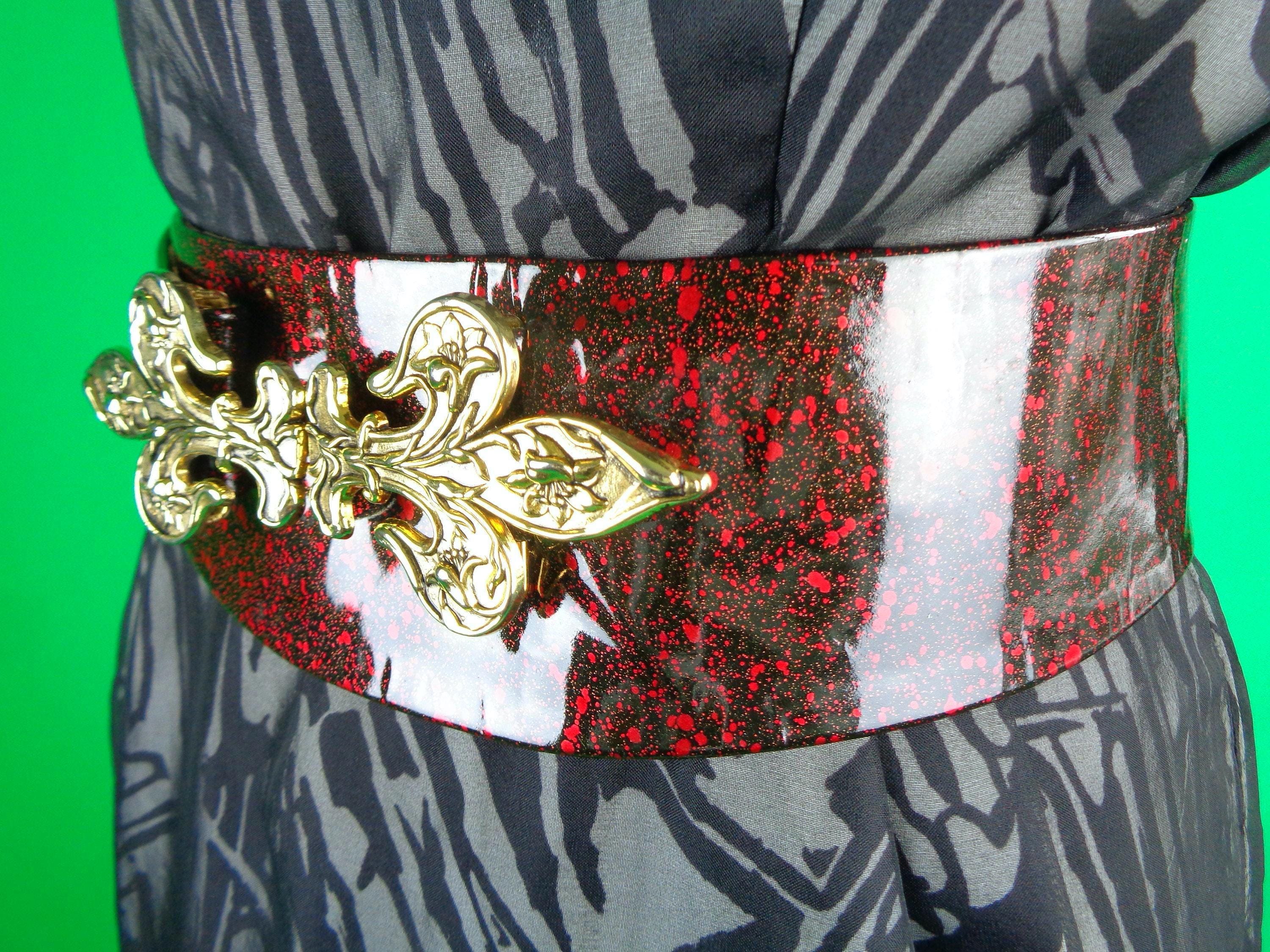 Features a decorative fleur de lis decal buckle, with clip hook front closure, thick to narrow strap, dotted, spatter pattern, design, with a high glossy finish front side! Great compliment piece!