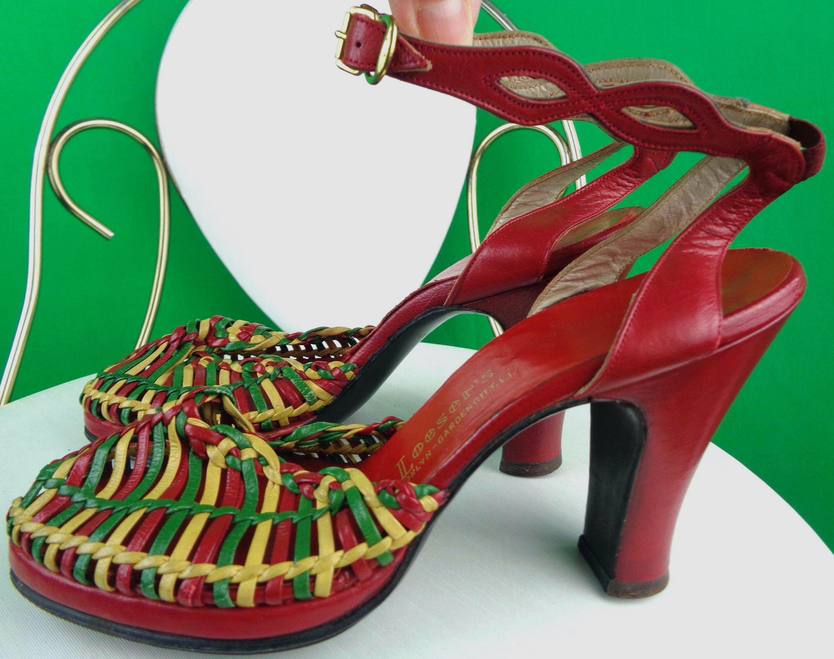 Red yellow green pumps, heels, shoes have the same type of features with a different woven crossover pattern, design on the vamp, a stencil wave pattern on the adjustable straps, with smooth back heels! These will need professional stretching and leather conditioner. Great compliment pieces!