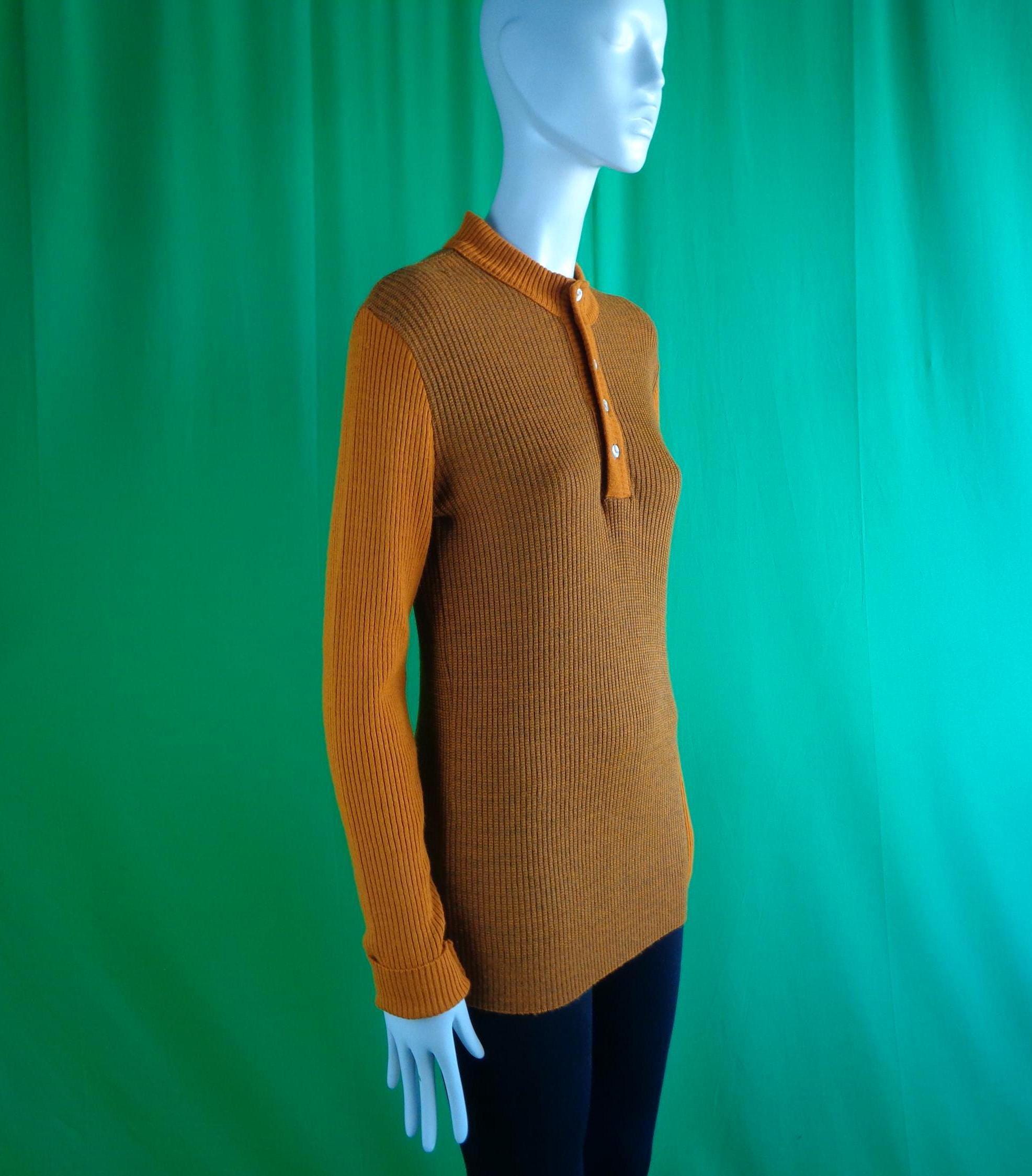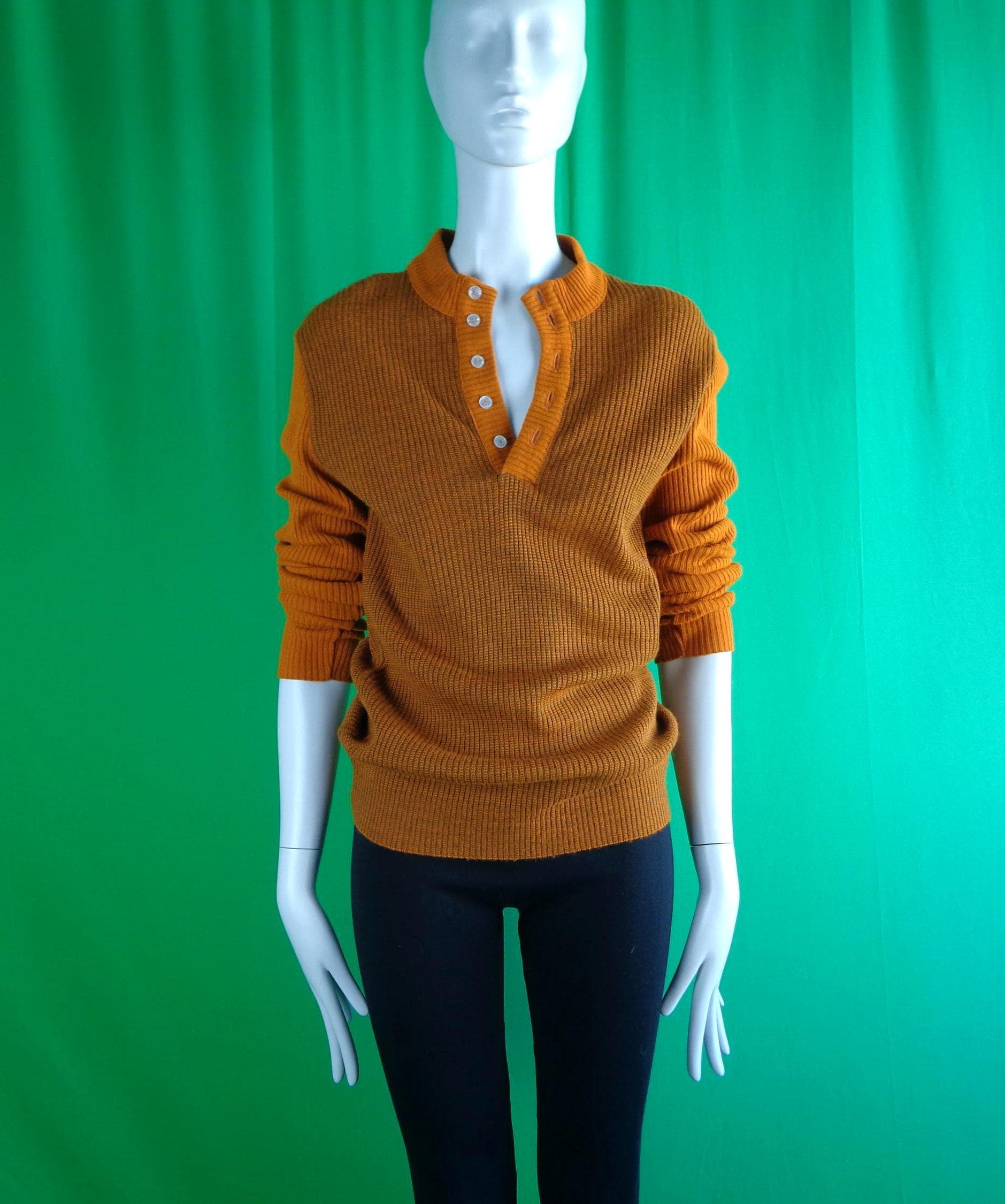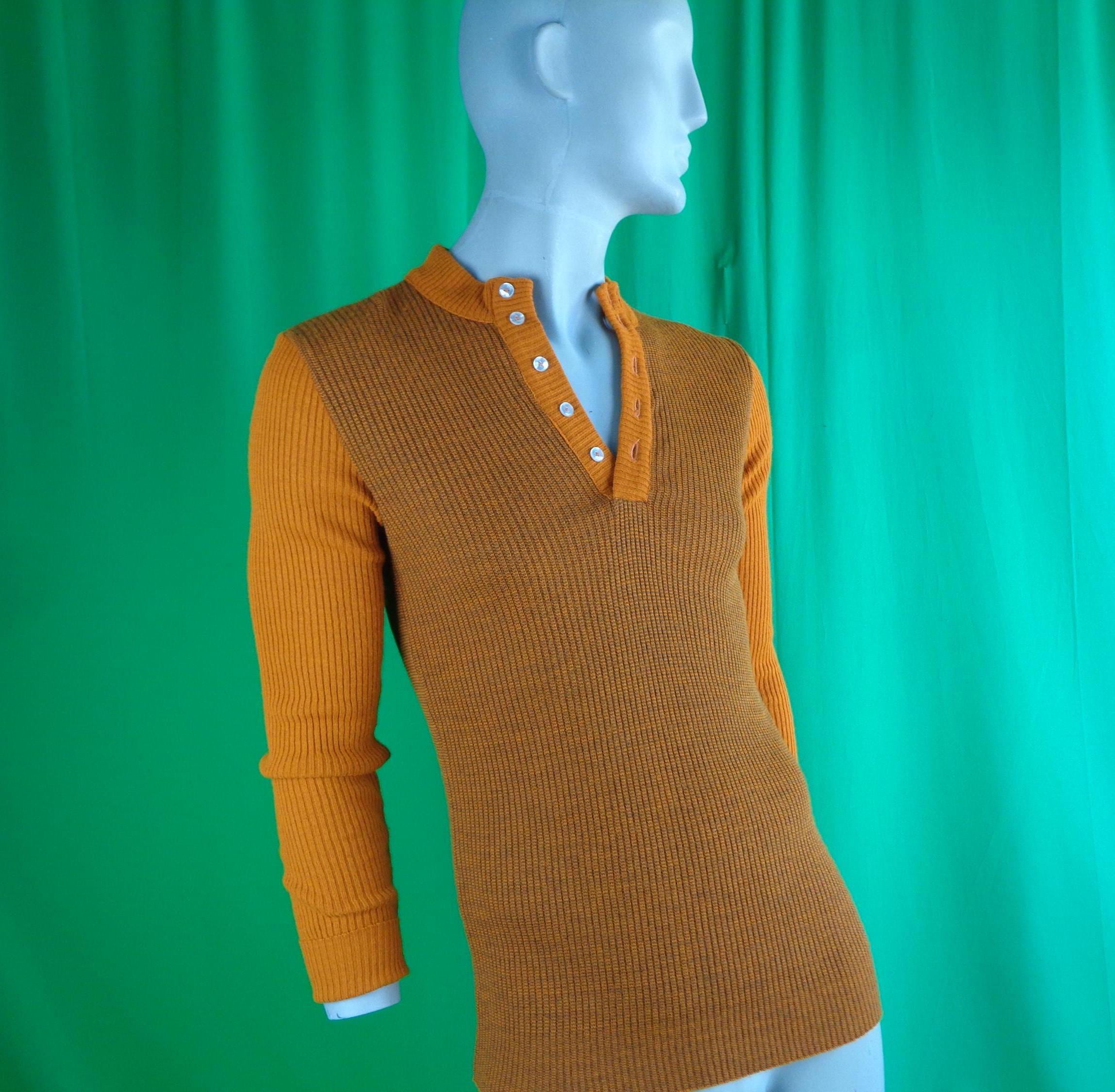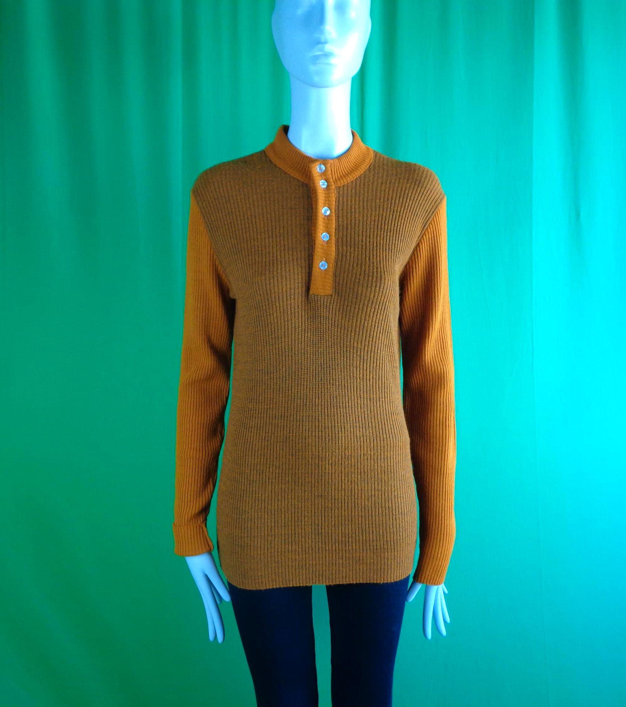 This lovely stylish 1960s 70s pullover sweater top shirt. Features 5 front pearl buttons, top henley collar, with a abstract two tone inverted knit pattern, design throughout! Great compliment piece!