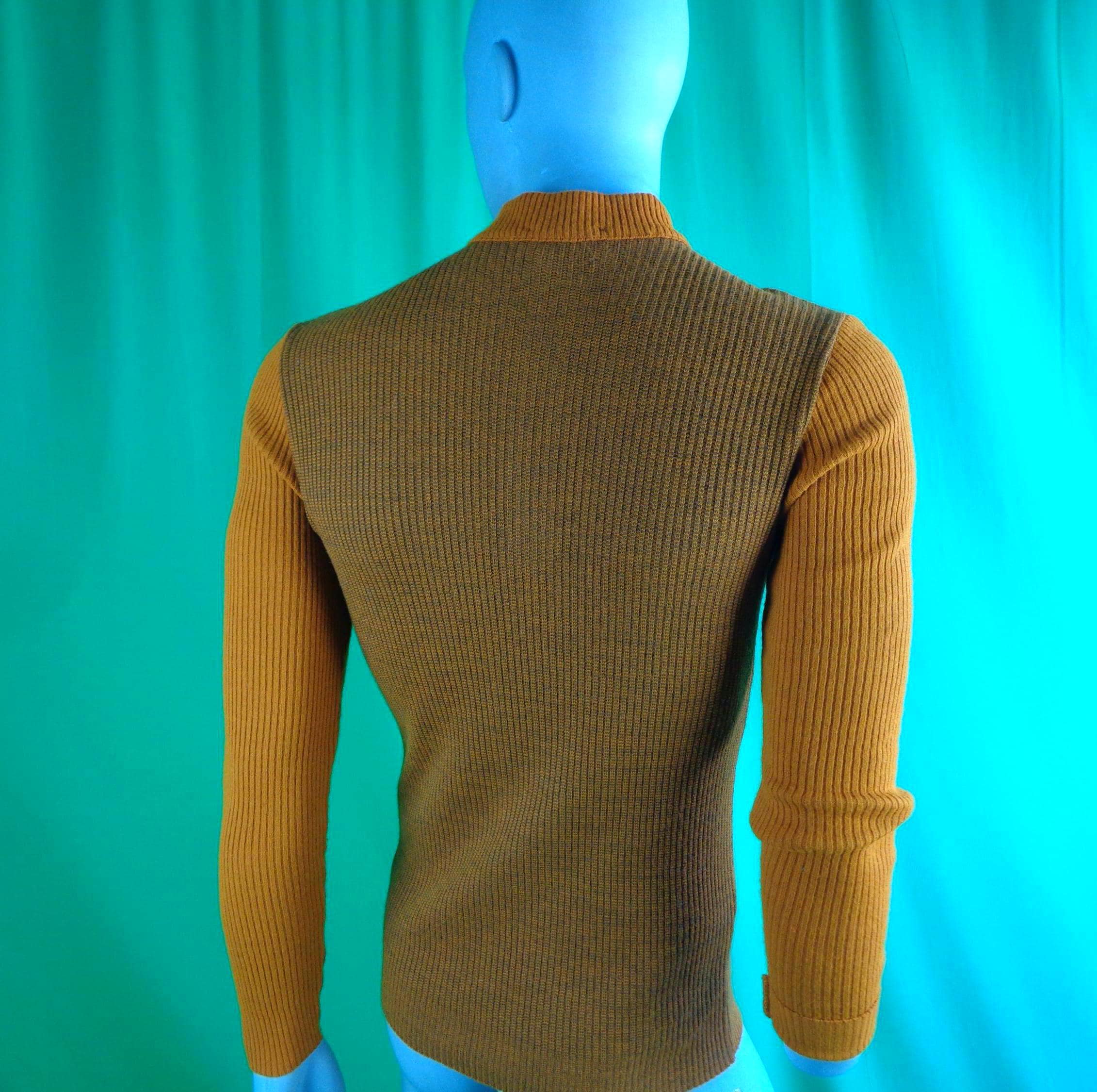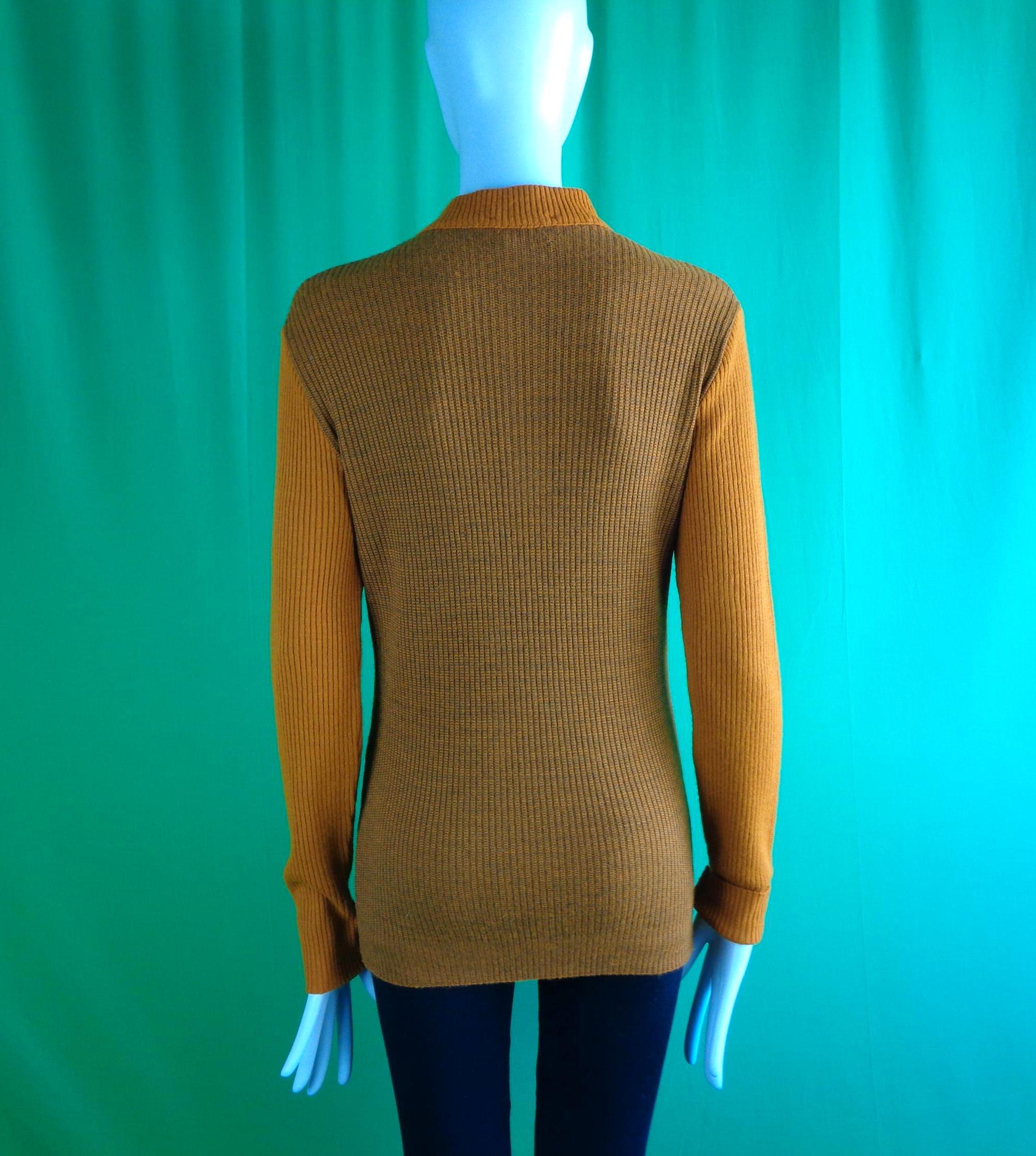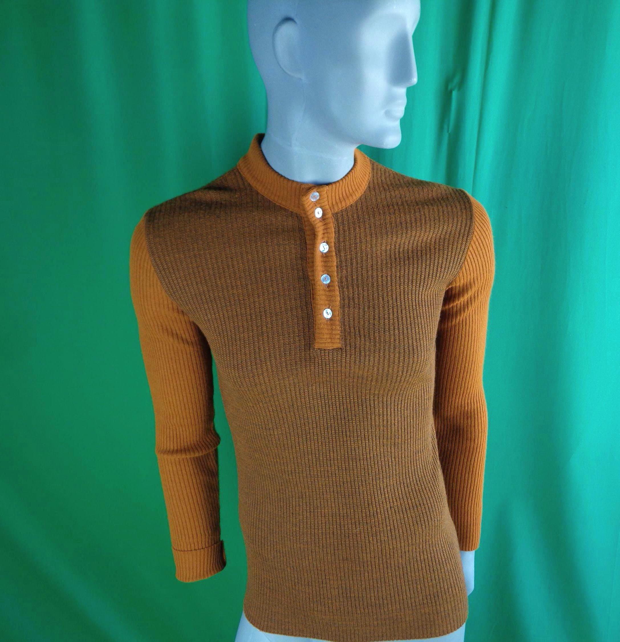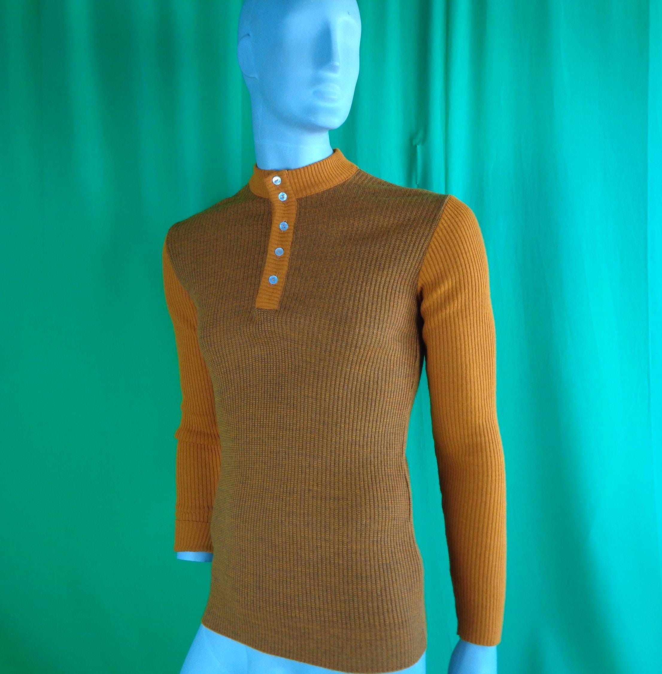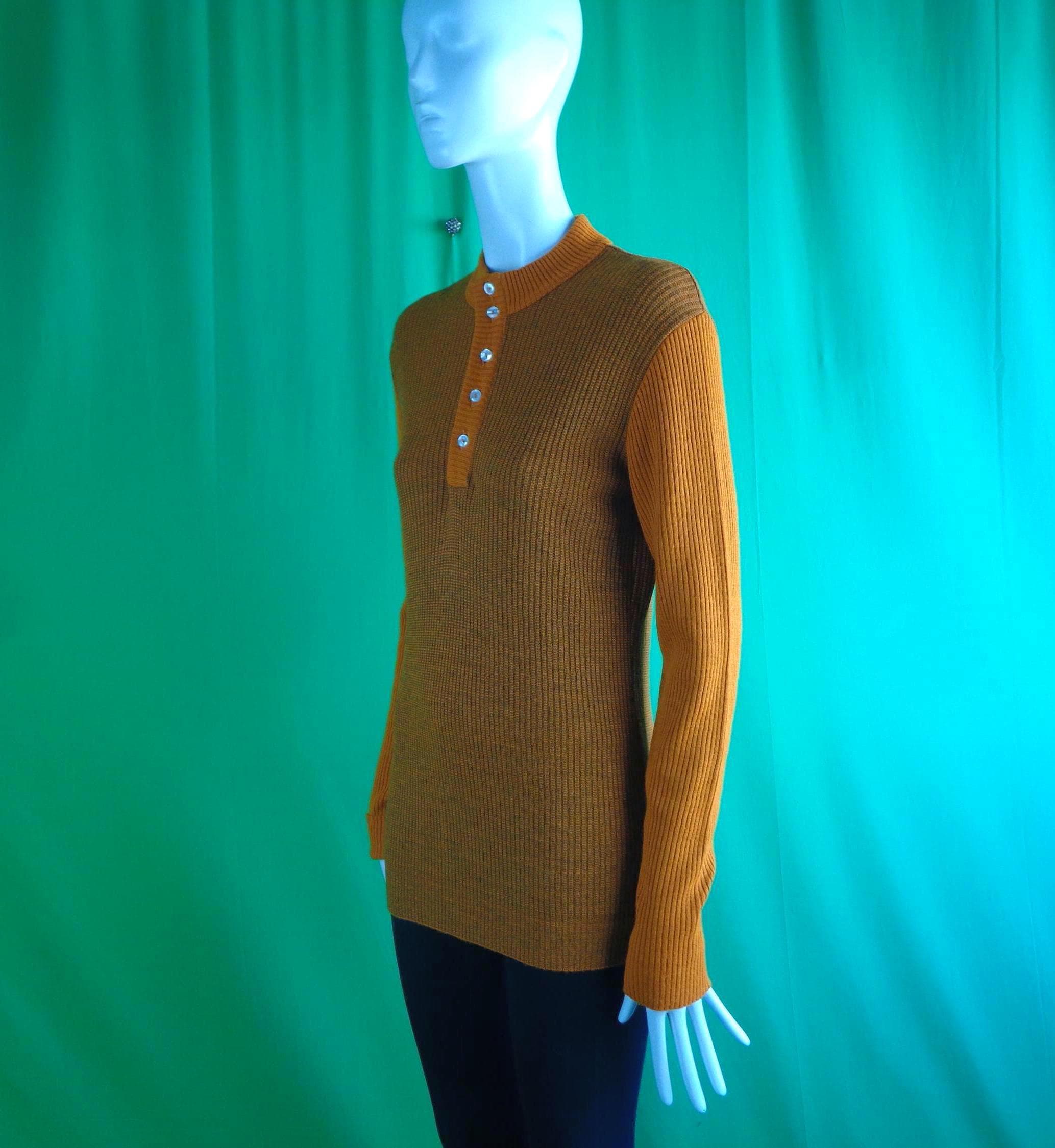 This lovely stylish 1960s 70s pullover sweater top shirt. Features 5 front pearl buttons, top henley collar, with a abstract two tone inverted knit pattern, design throughout! Great compliment piece!