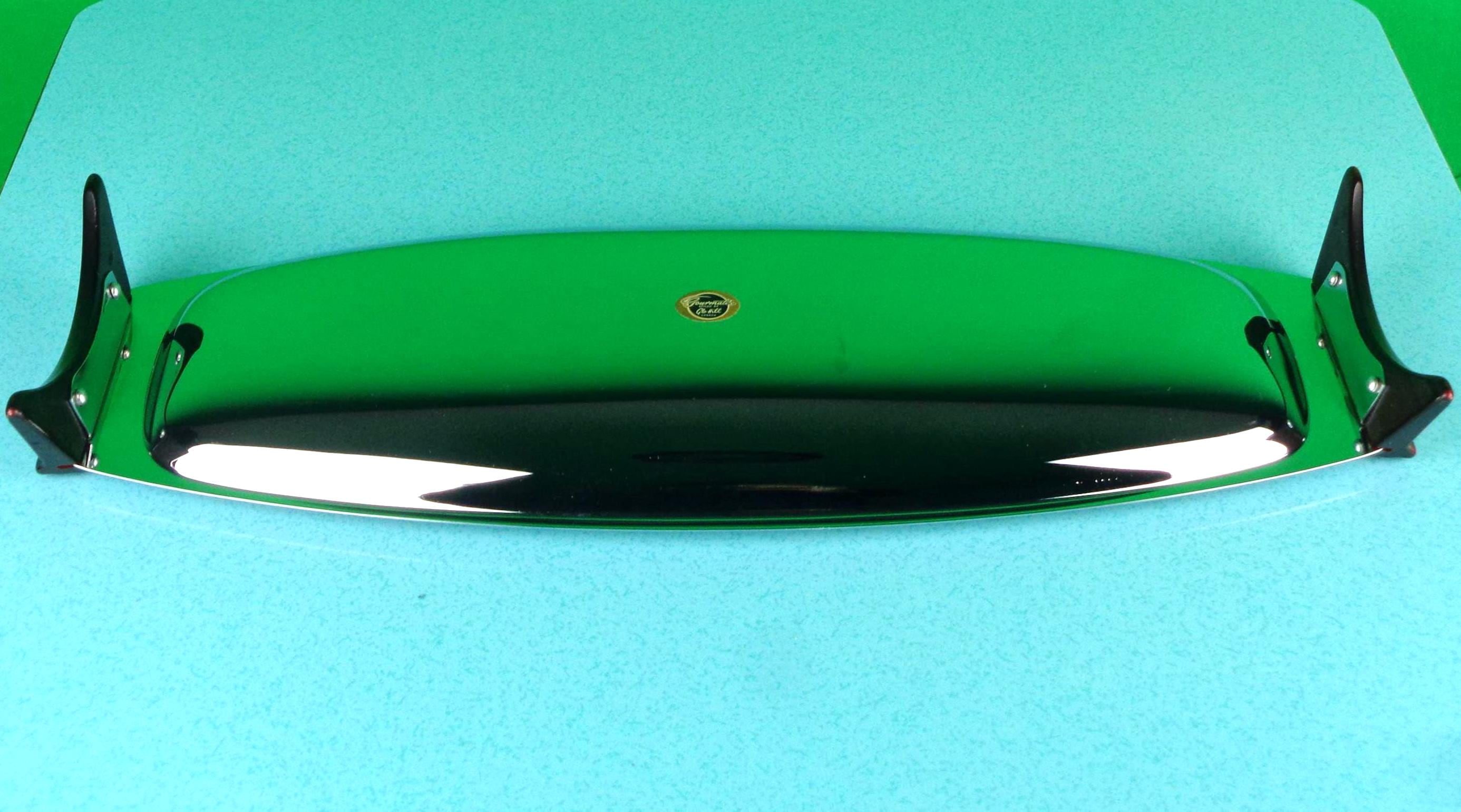 This lovely sturdy 1950s 60s retro transfer serving tray, platter. Features 2 side teak style bakelite handles, with a rectangular, oblong shape and high, chrome mirror finish throughout! Great piece!
