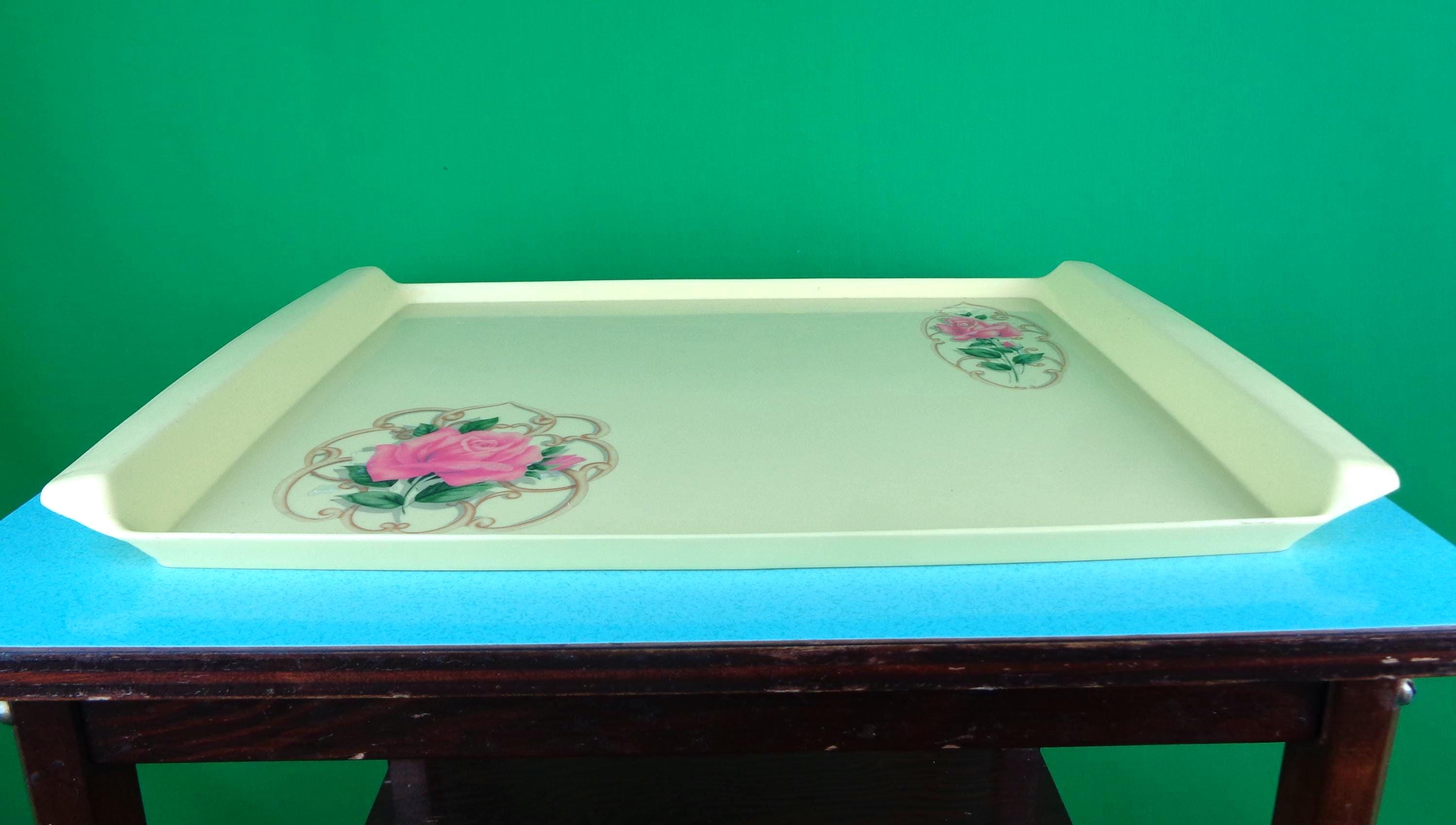 This lovely elegant 1950s 60s retro tray, platter features 2 decorative roses, 2 panels inlay handles with a smooth finish throughout! Great piece!