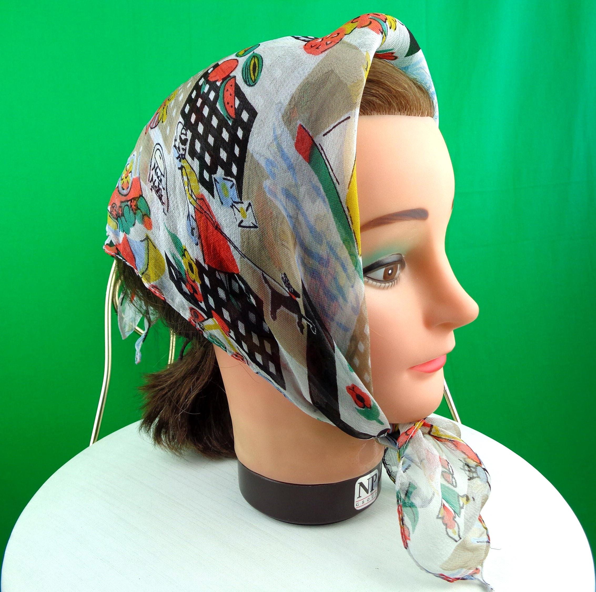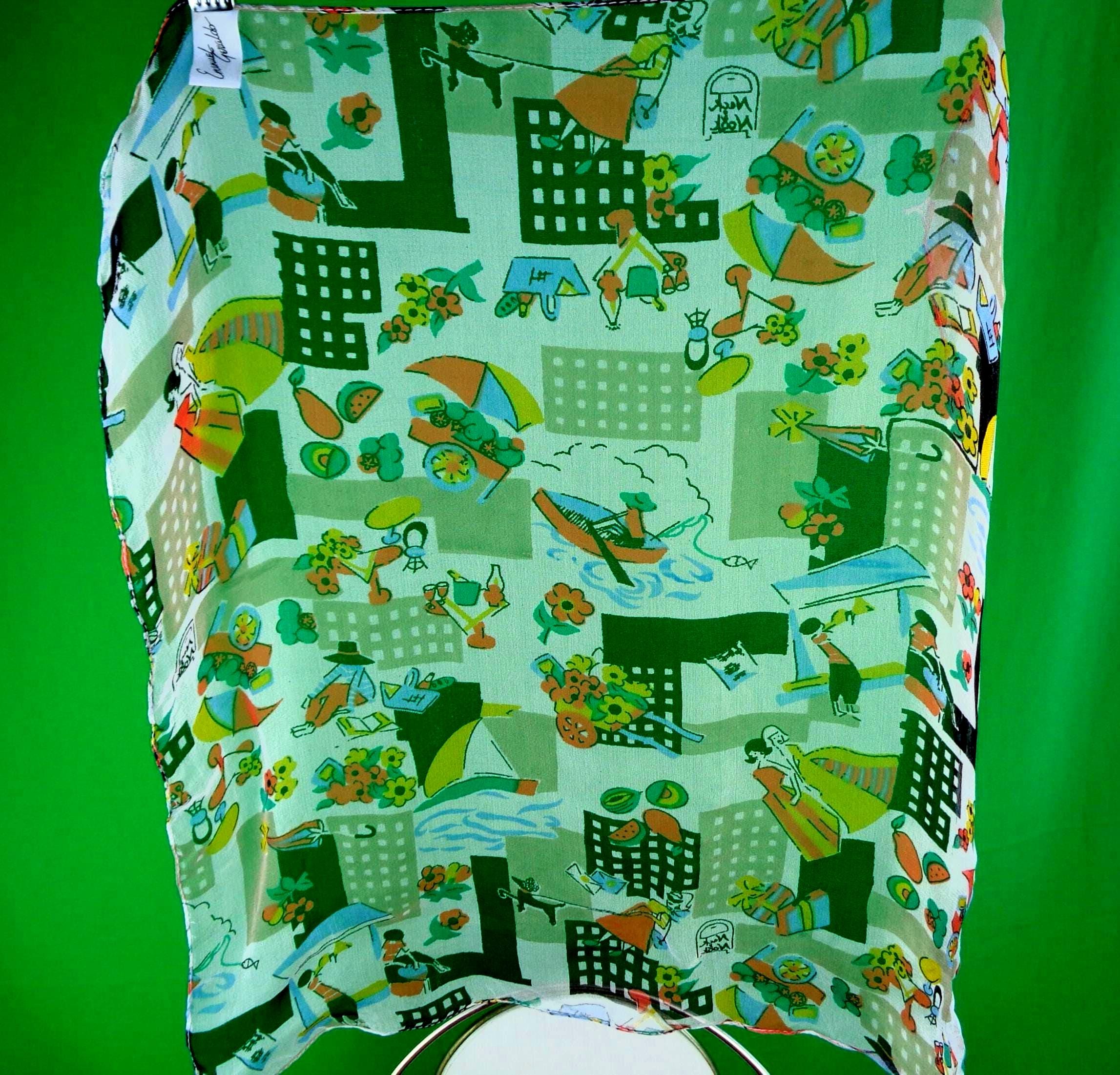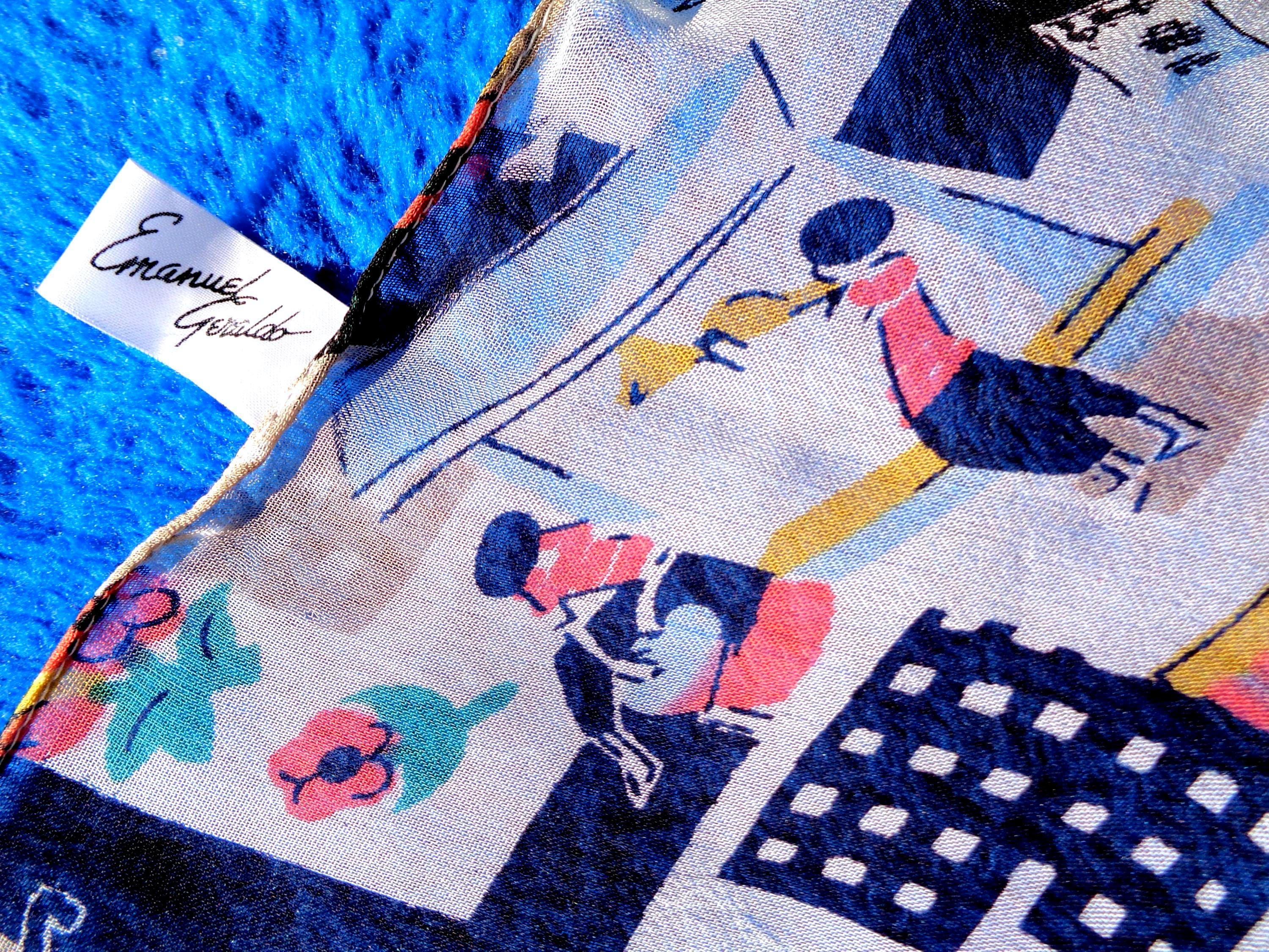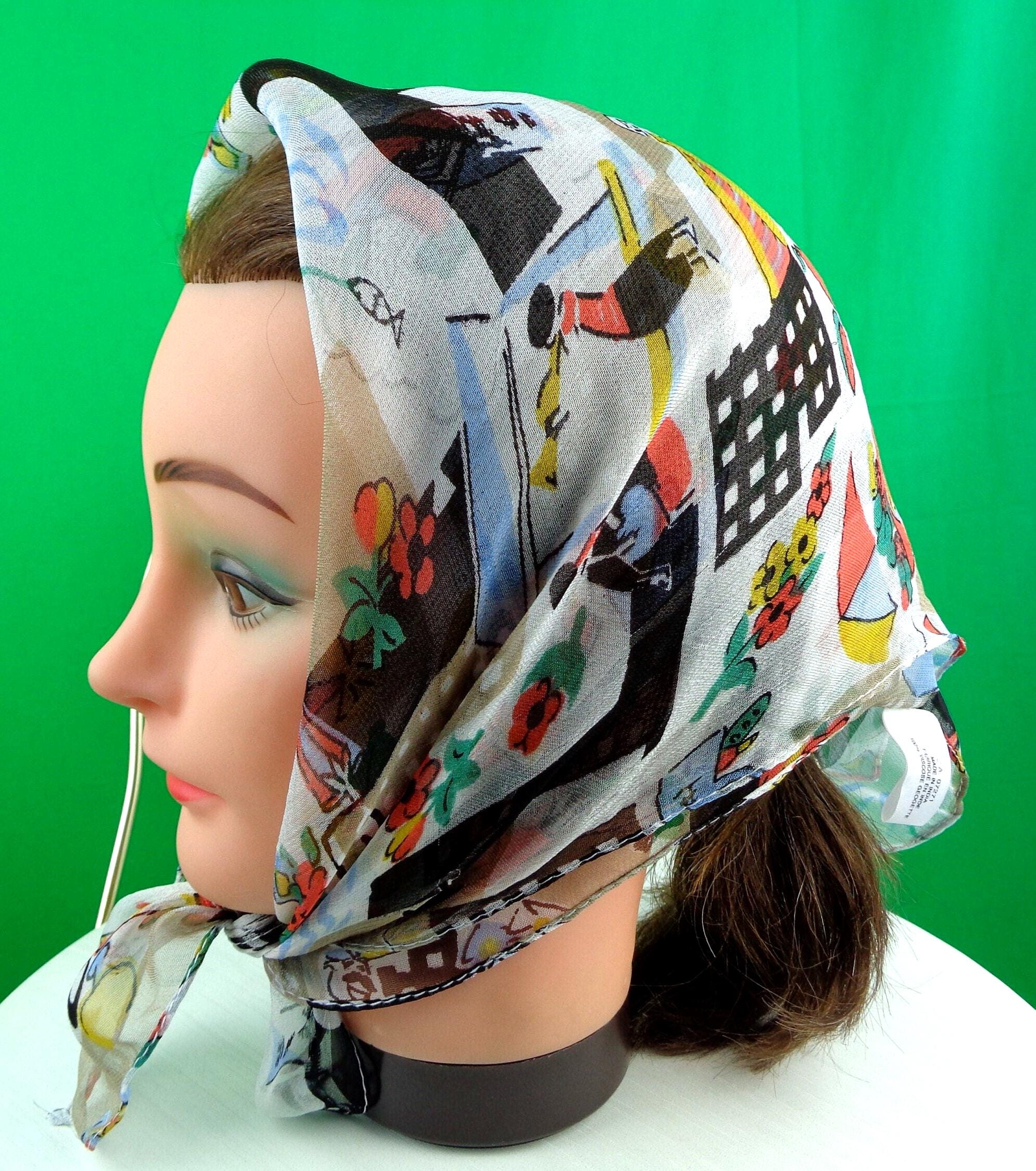 This lovely stylish vibrant scarf, tie wrap. Features a French Paris market theme, city skyline, lady and her poodle, models in a cafe, with depiction of fashion, wrapped gifts, boat fishing, with soft material, fabric throughout! Great compliment piece!