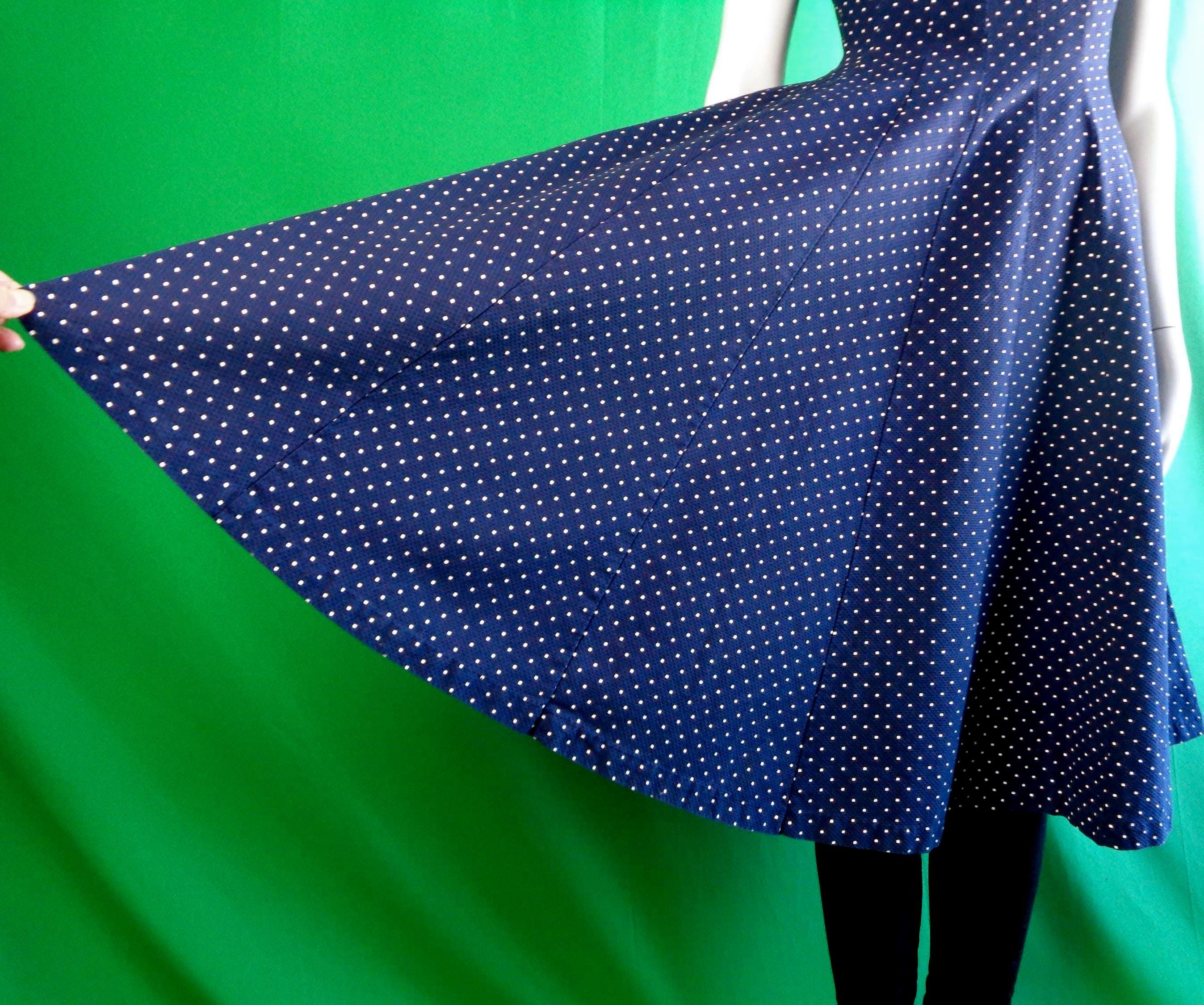Features a trumpet, figure skater, circle skirt, with a cinch, darted waist, piping along the neckline, arm cuffs, with a back metal zipper, all over dotted pattern, design, with crisp sturdy fabric, material throughout! Great compliment piece!