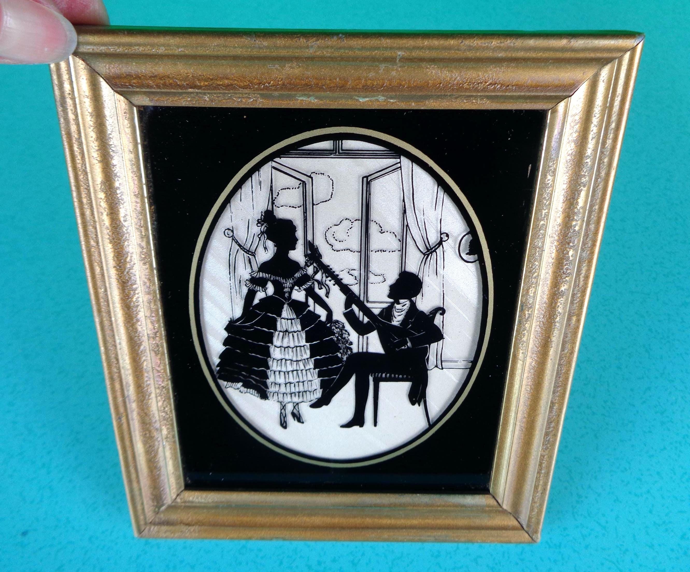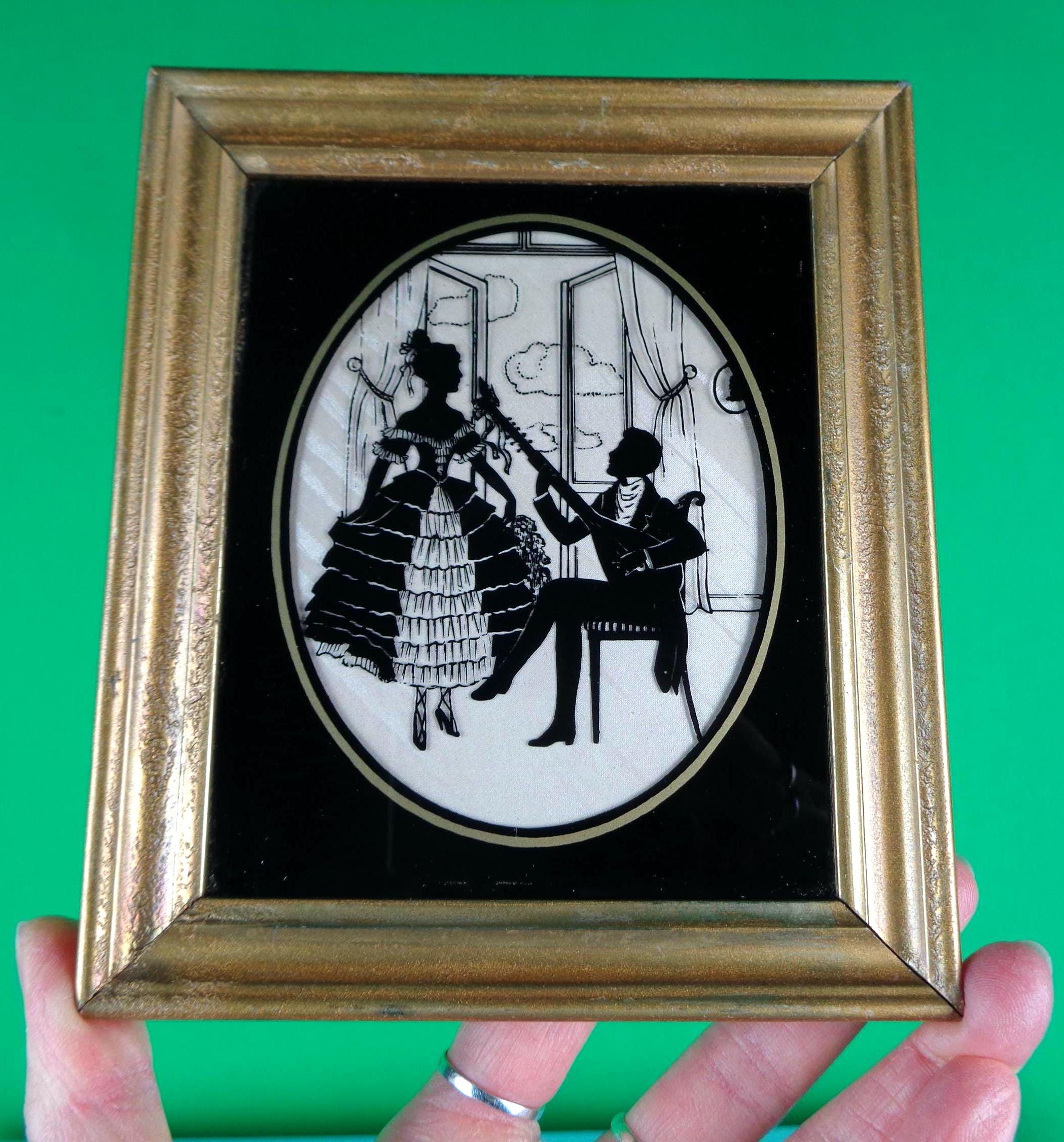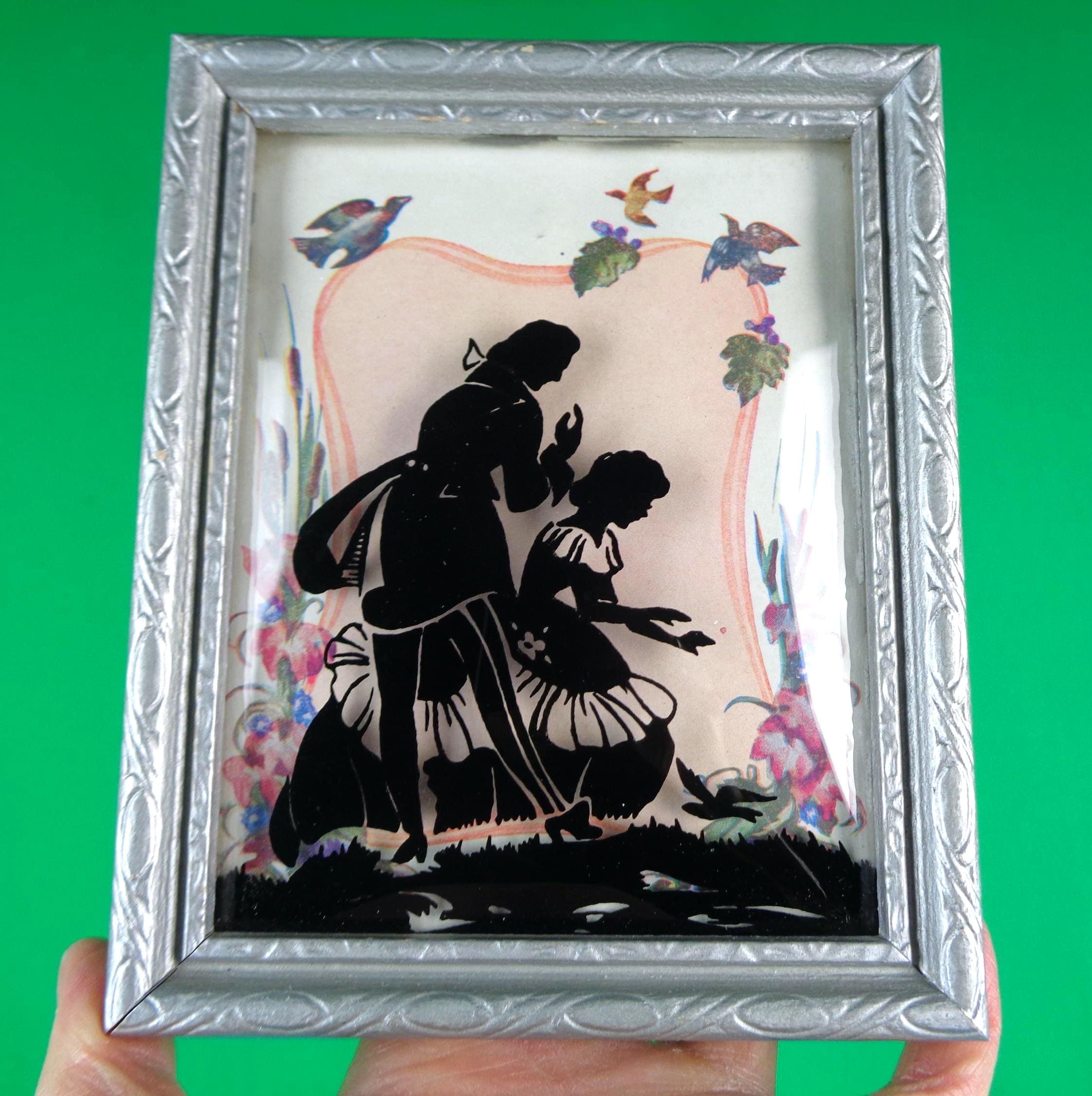 These lovely elegant 1930s 40s art picture features a romantic loving couple enjoy their company in a meadow with a souring swallows with a decorative background and frame! Great pieces!