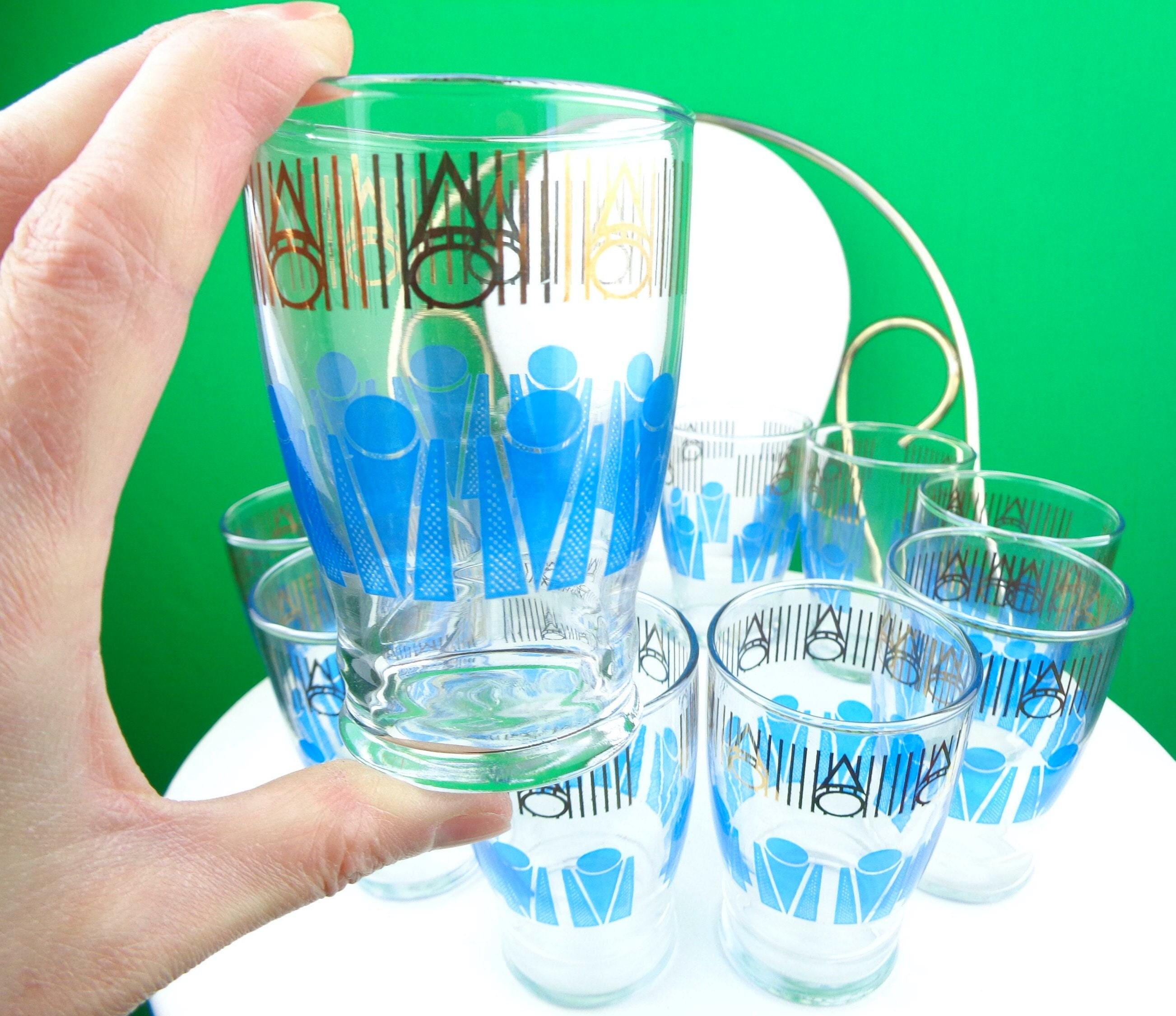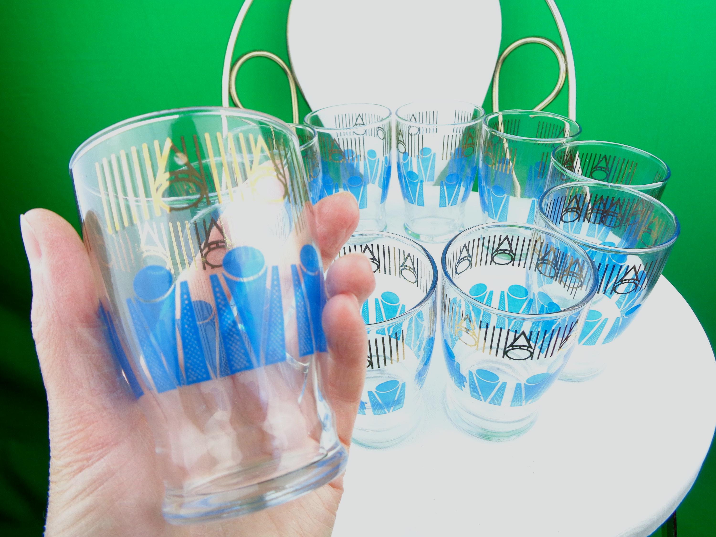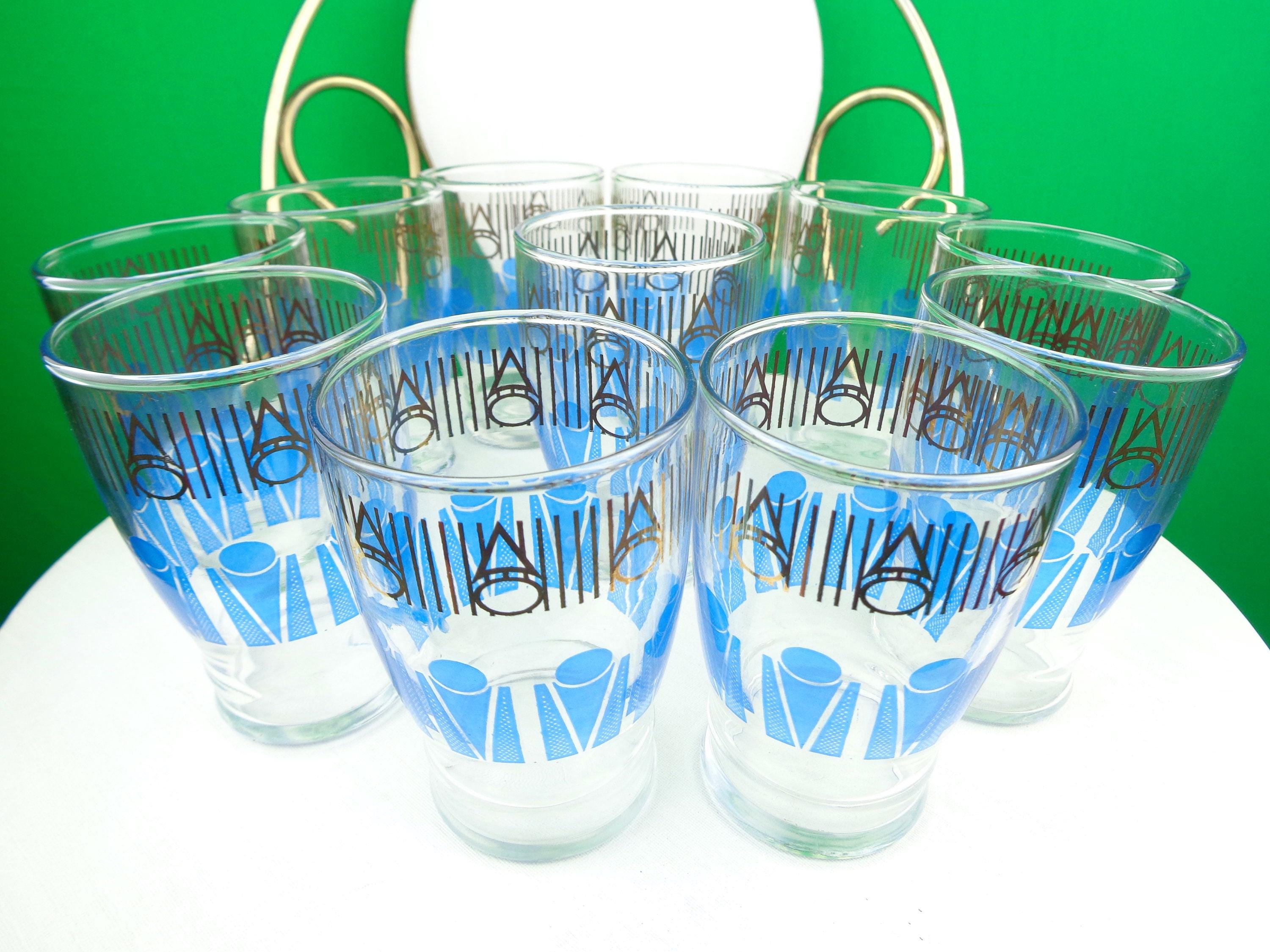These lovely vibrant 1950s 60s MCM drinking glasses. Features 11 uniquely shaped top bubble rim, with a whimsical design, pattern throughout! Great pieces!