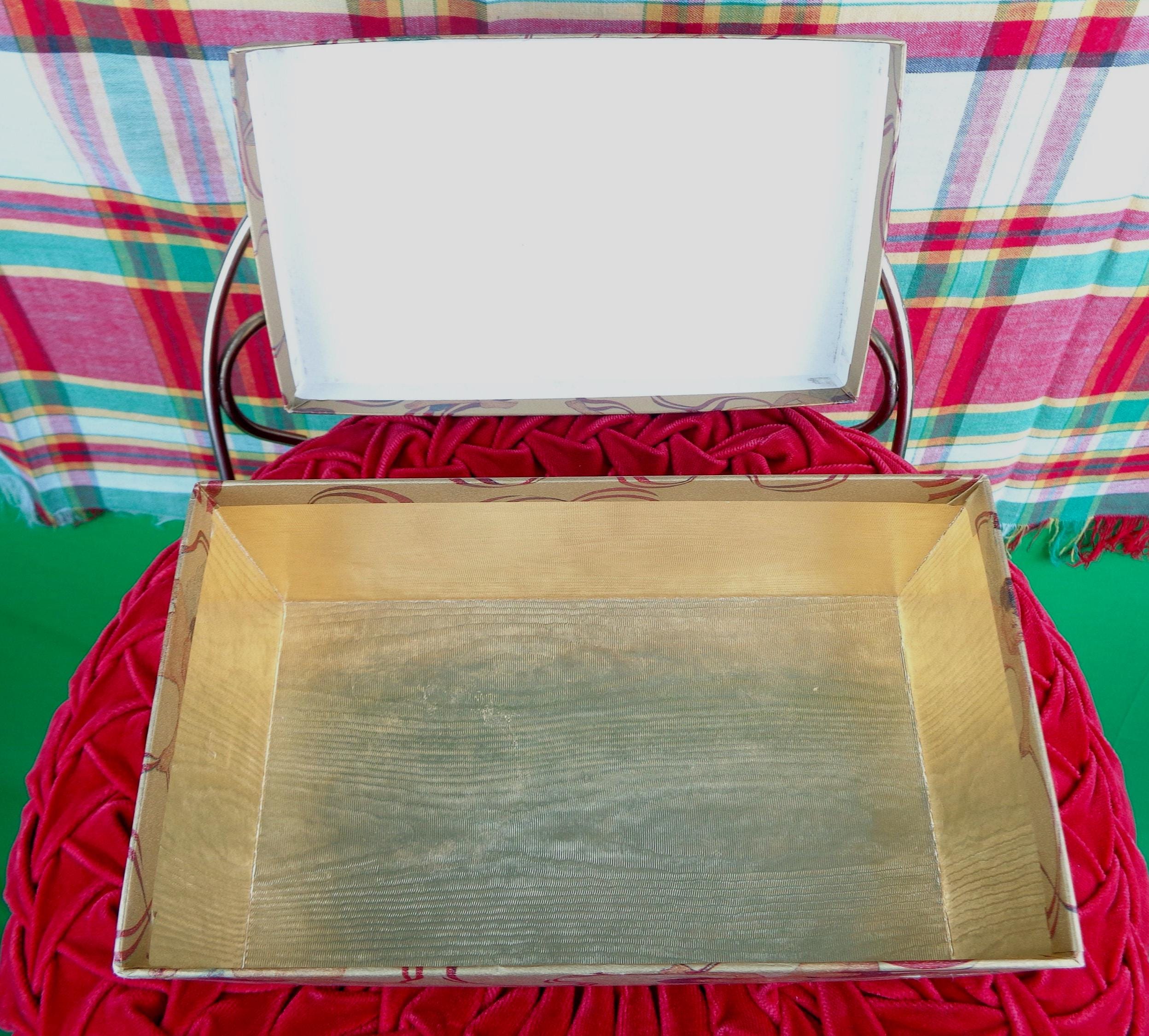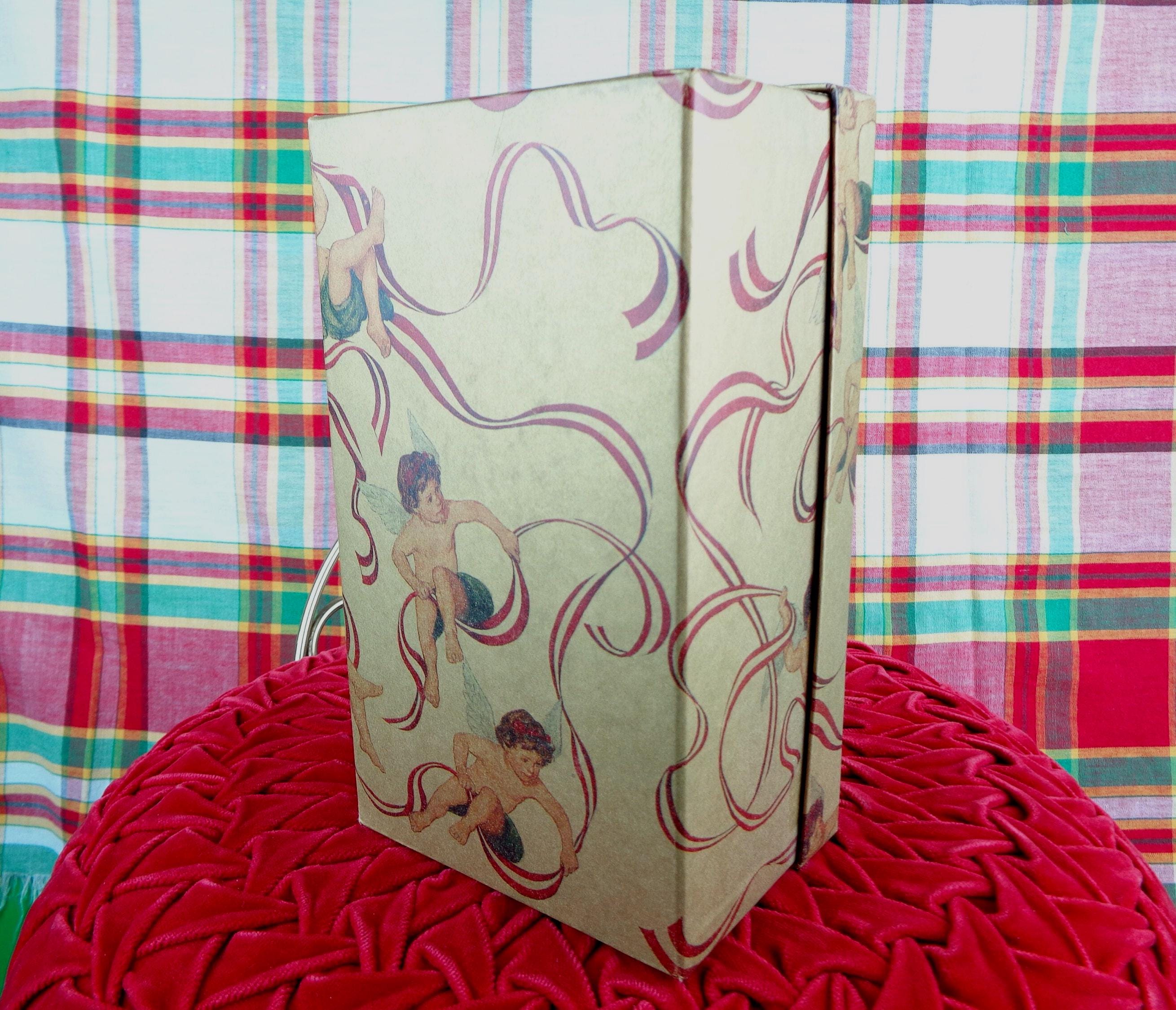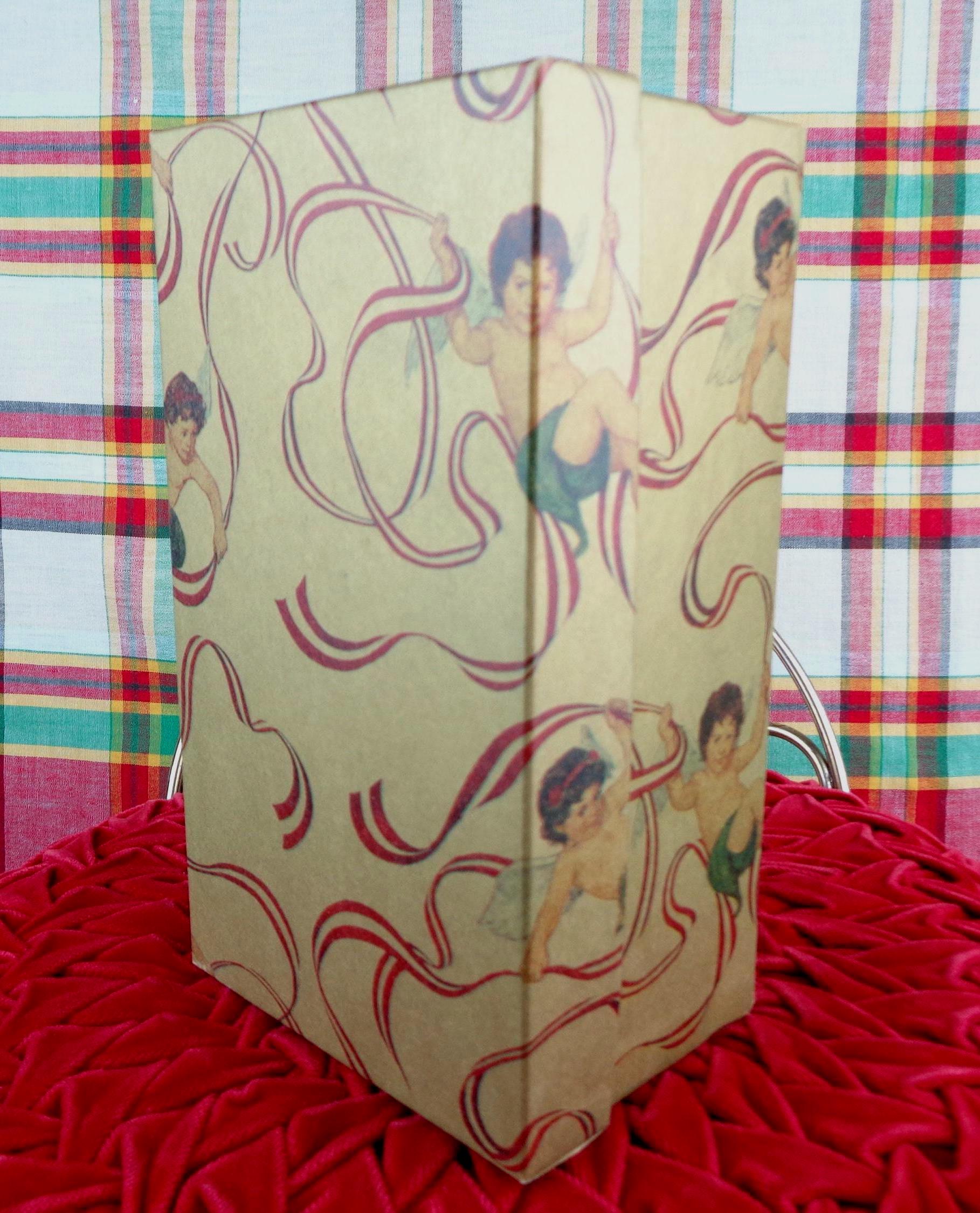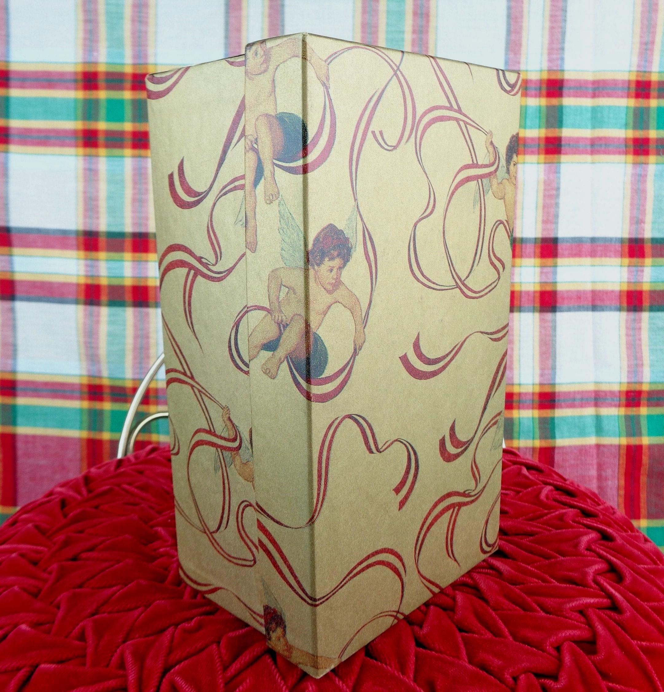 Features 11 floating angels placed among dancing ribbons, with a muted gold paper covered exterior, with shimmering gold paneling paper inside! Great compliment piece!