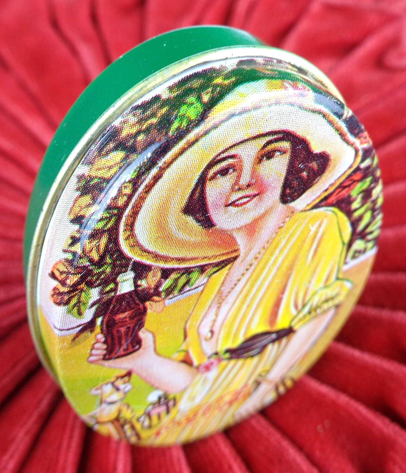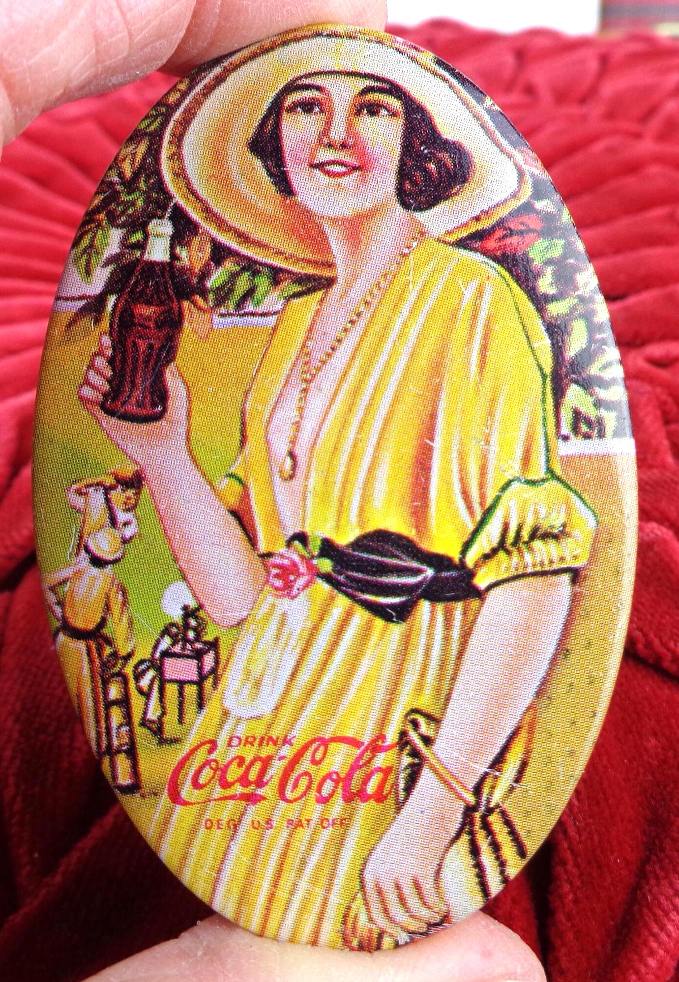 Features a top lid with a women hold a coke bottle in a park track nicely displayed on the front! Great piece!