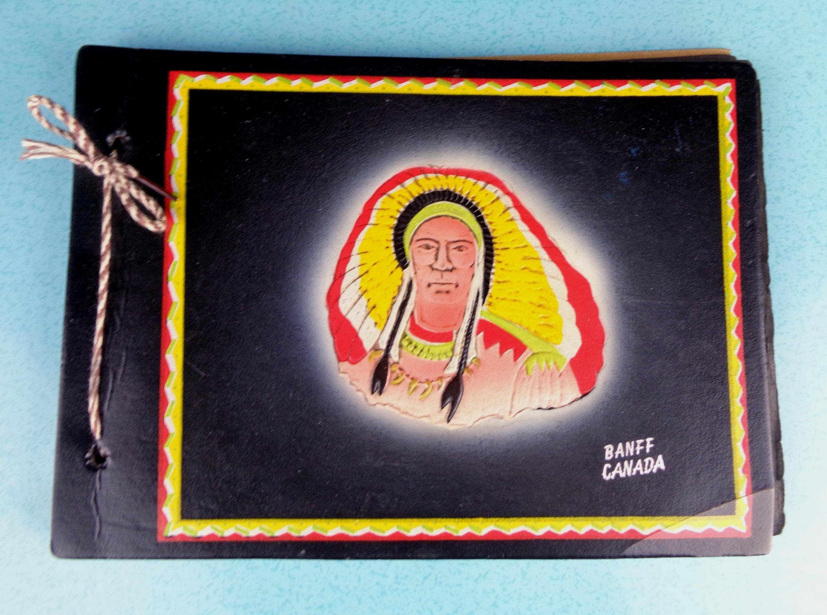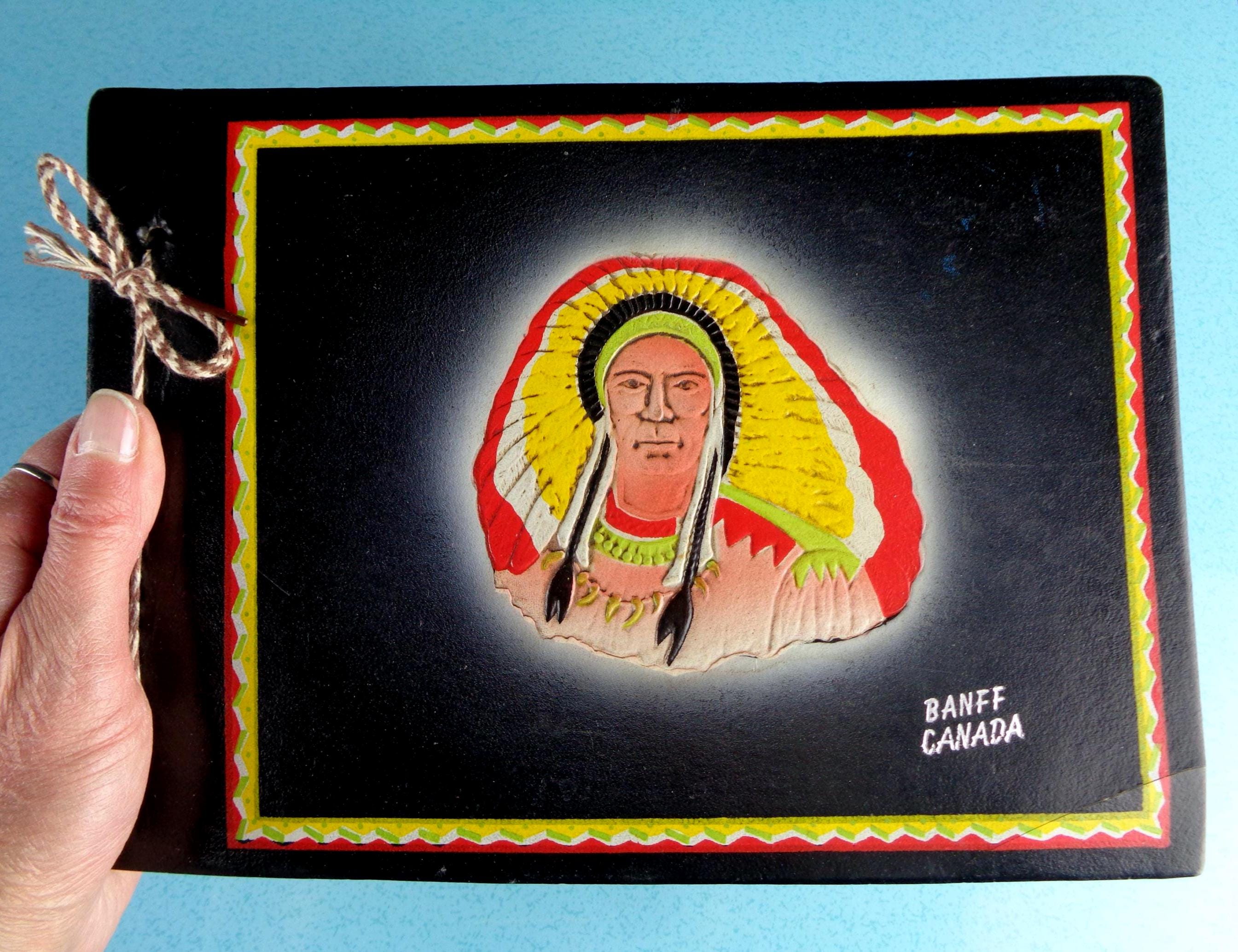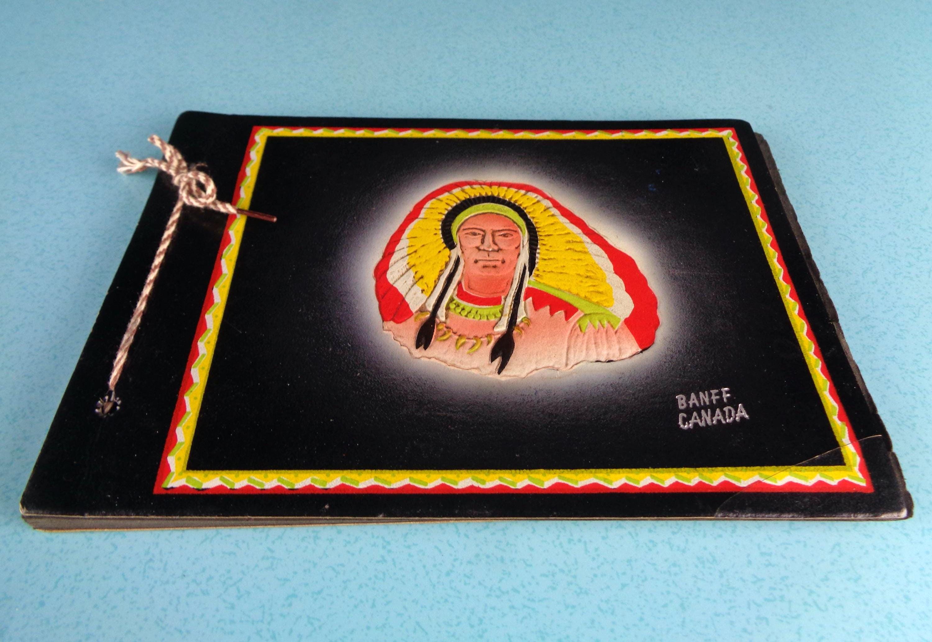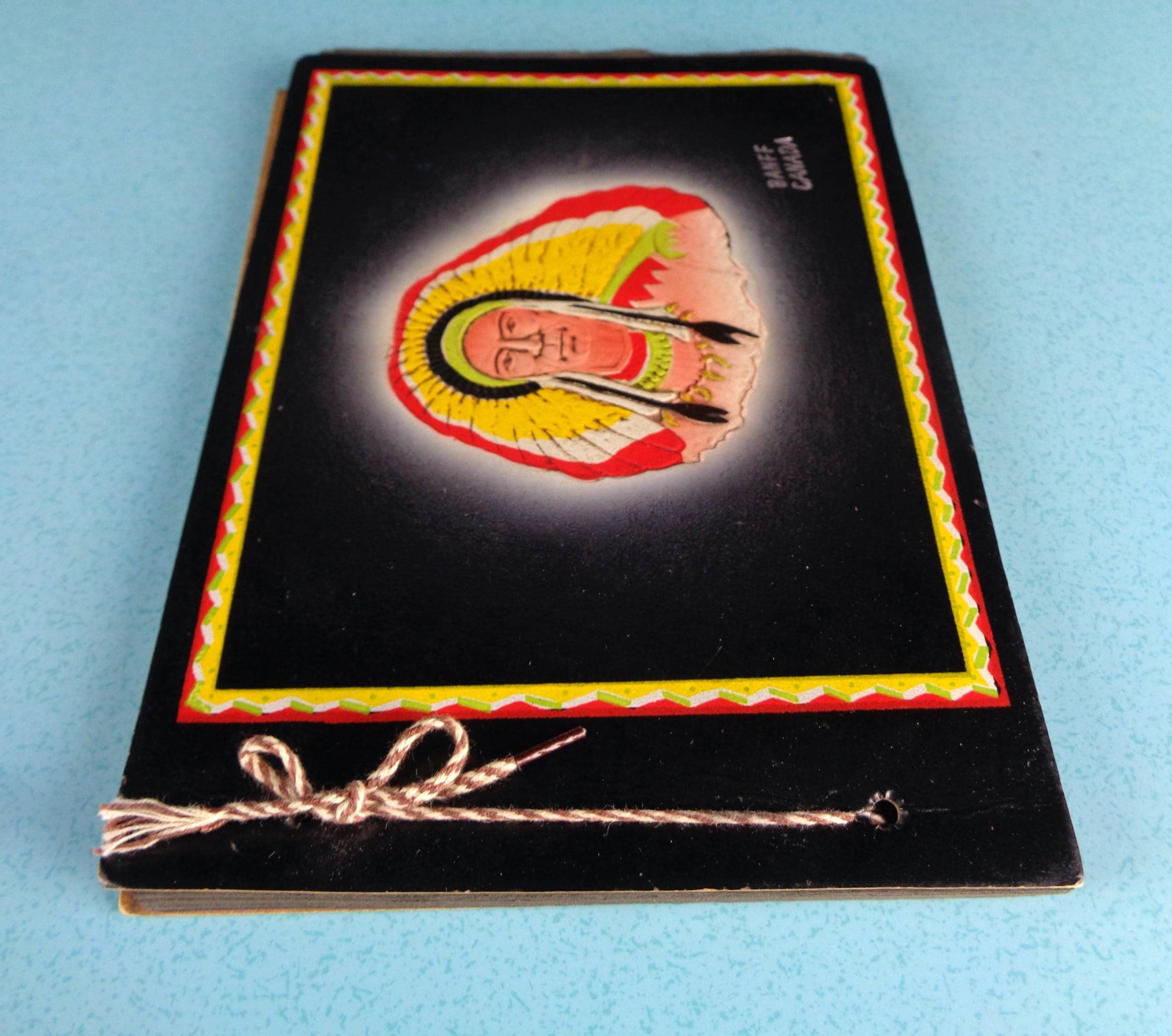 Features a tied spin, with 24 black pages, with 2 sides, a colorful, embossed Native head dress front page with boarder! Great piece!