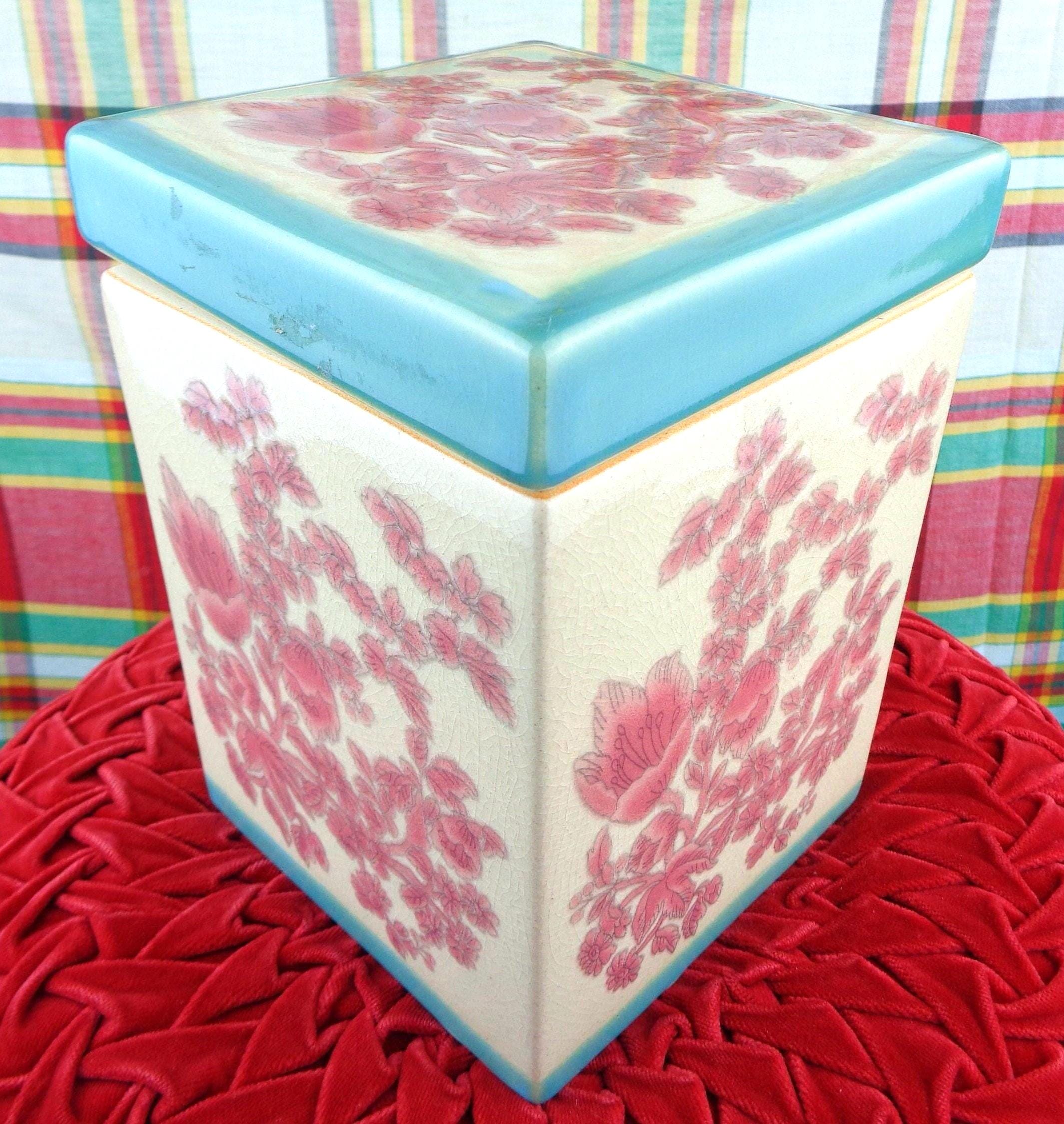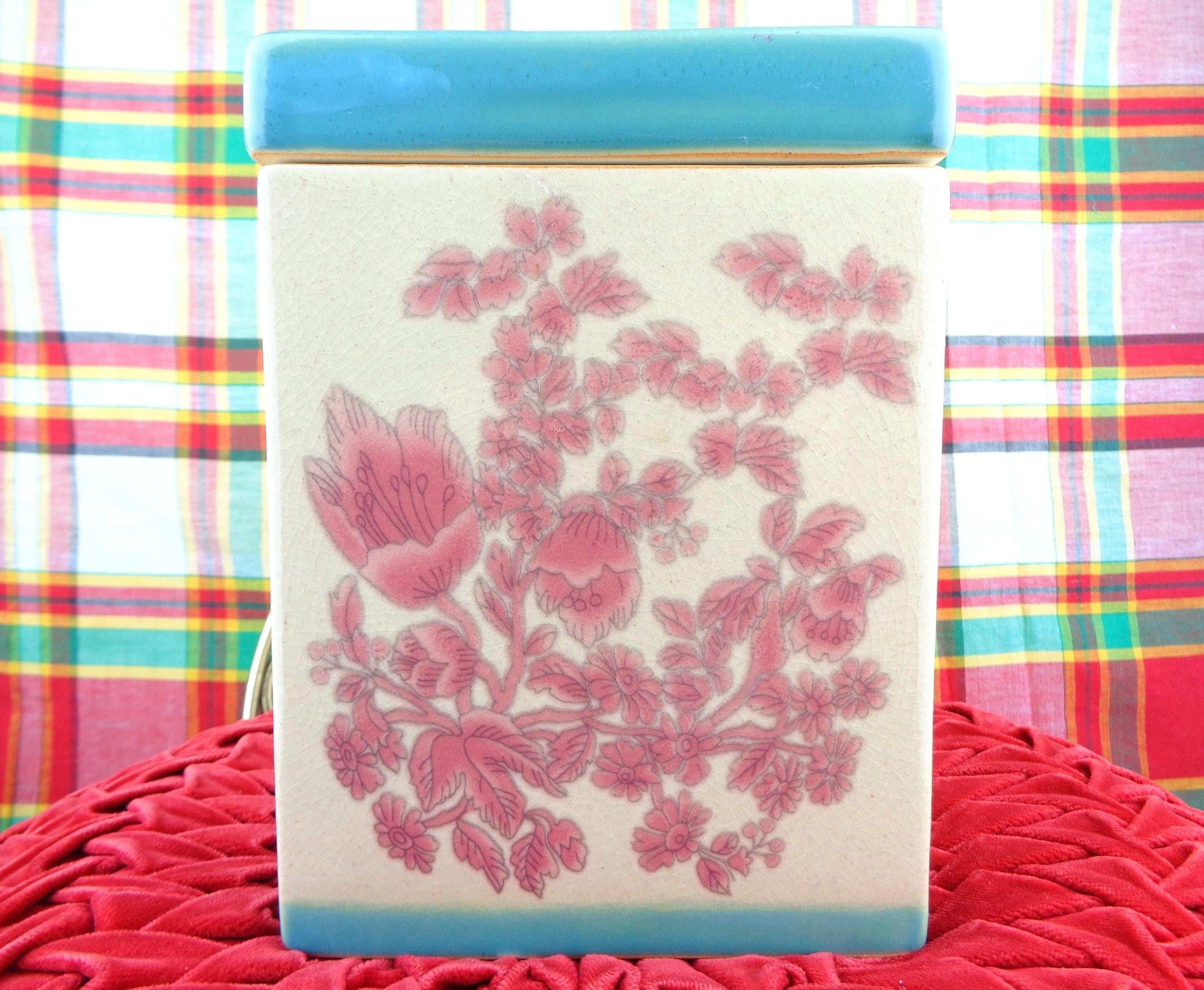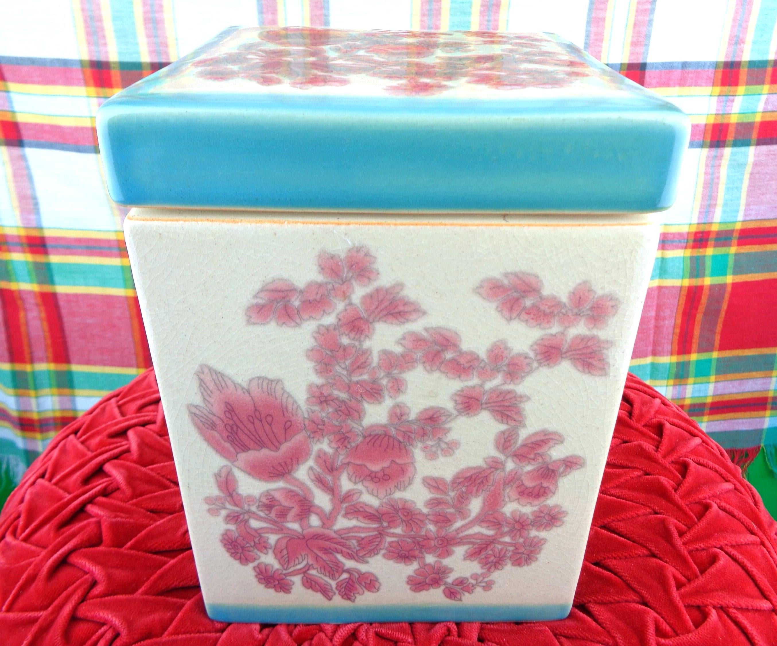 This lovely unique canister, lid container. Features a floral design, pattern four sides and sturdy top, with a boarder top and bottom edges, with a rubber ring inside tp secures the lid in place! Great piece!