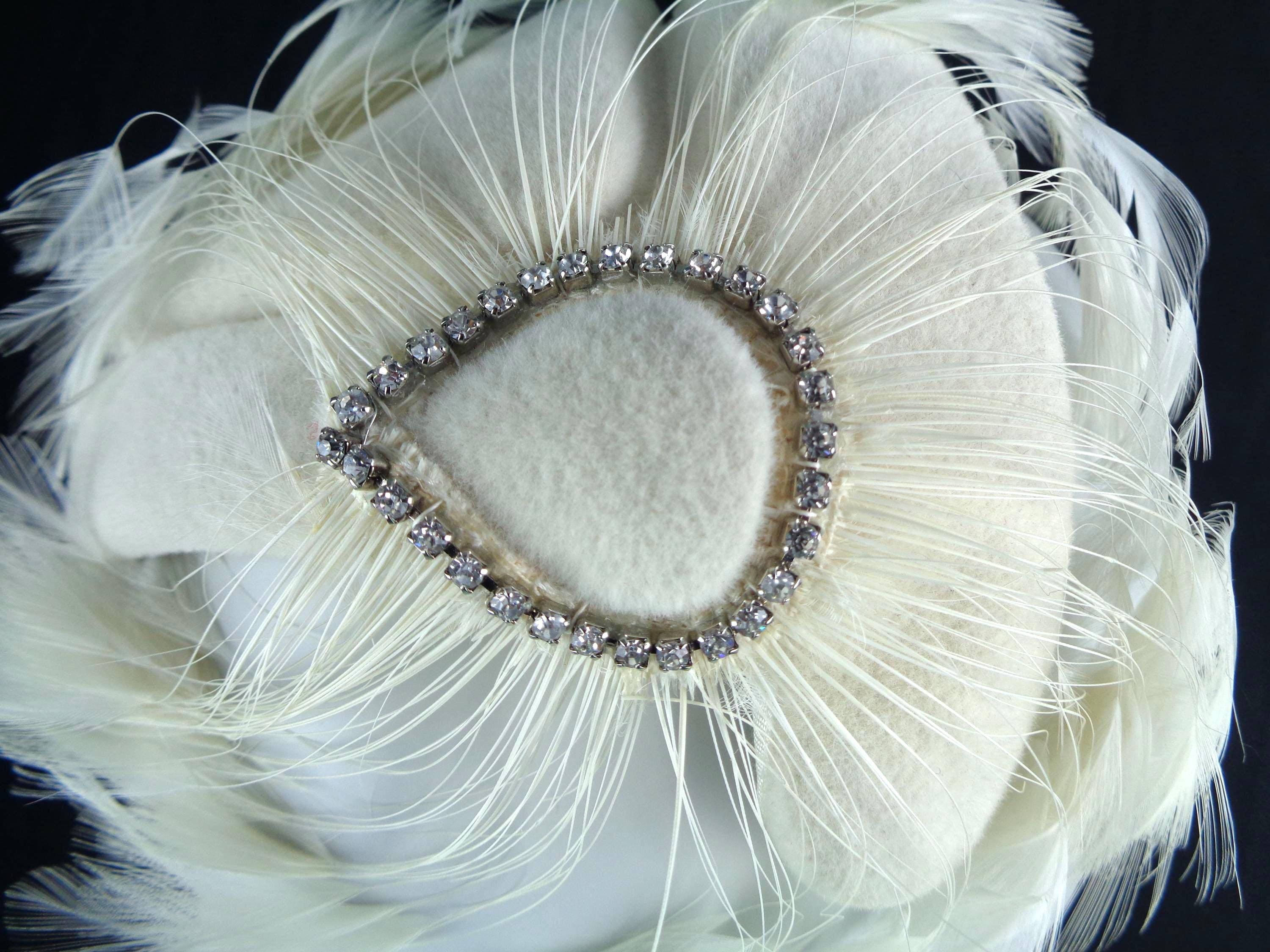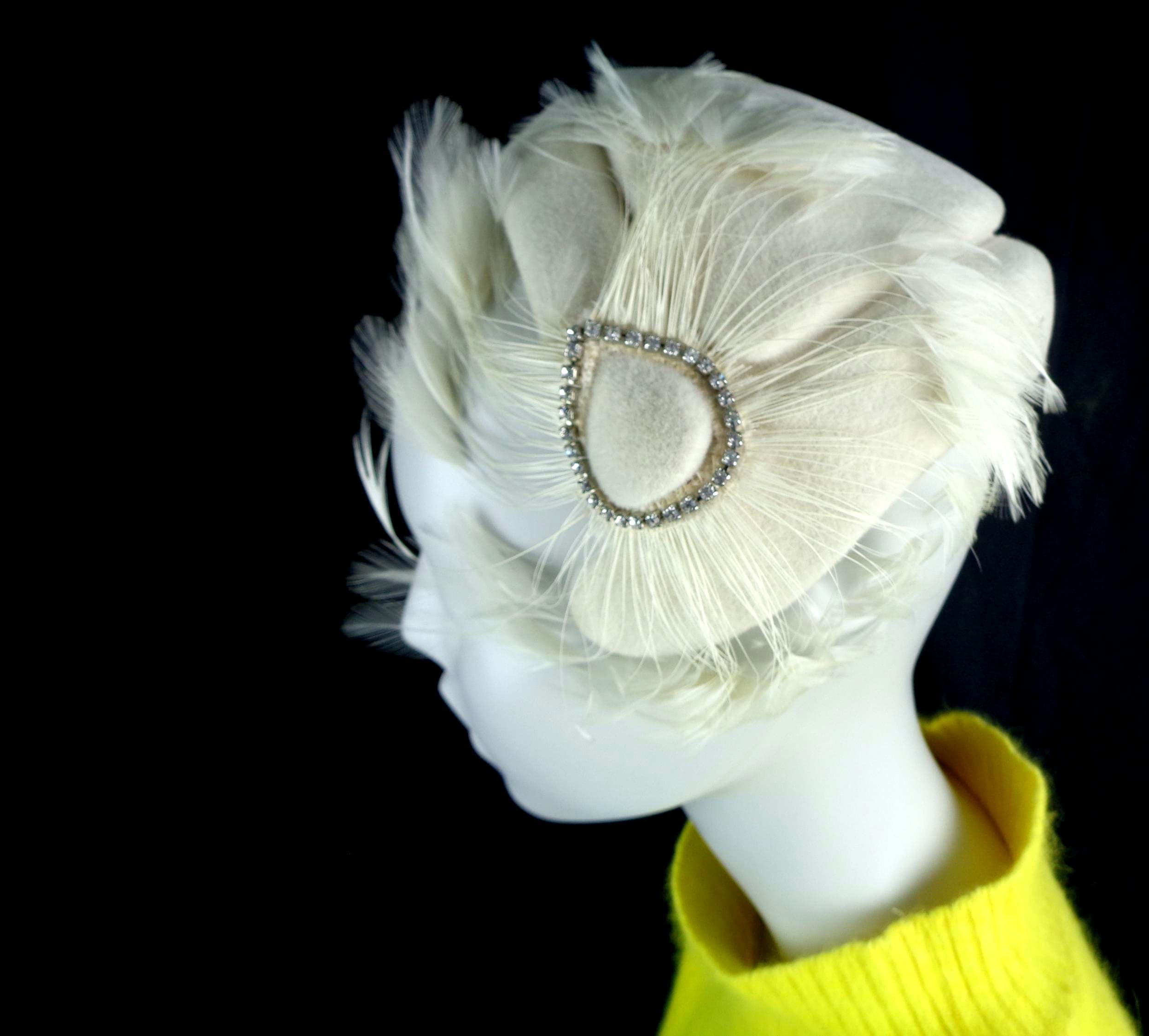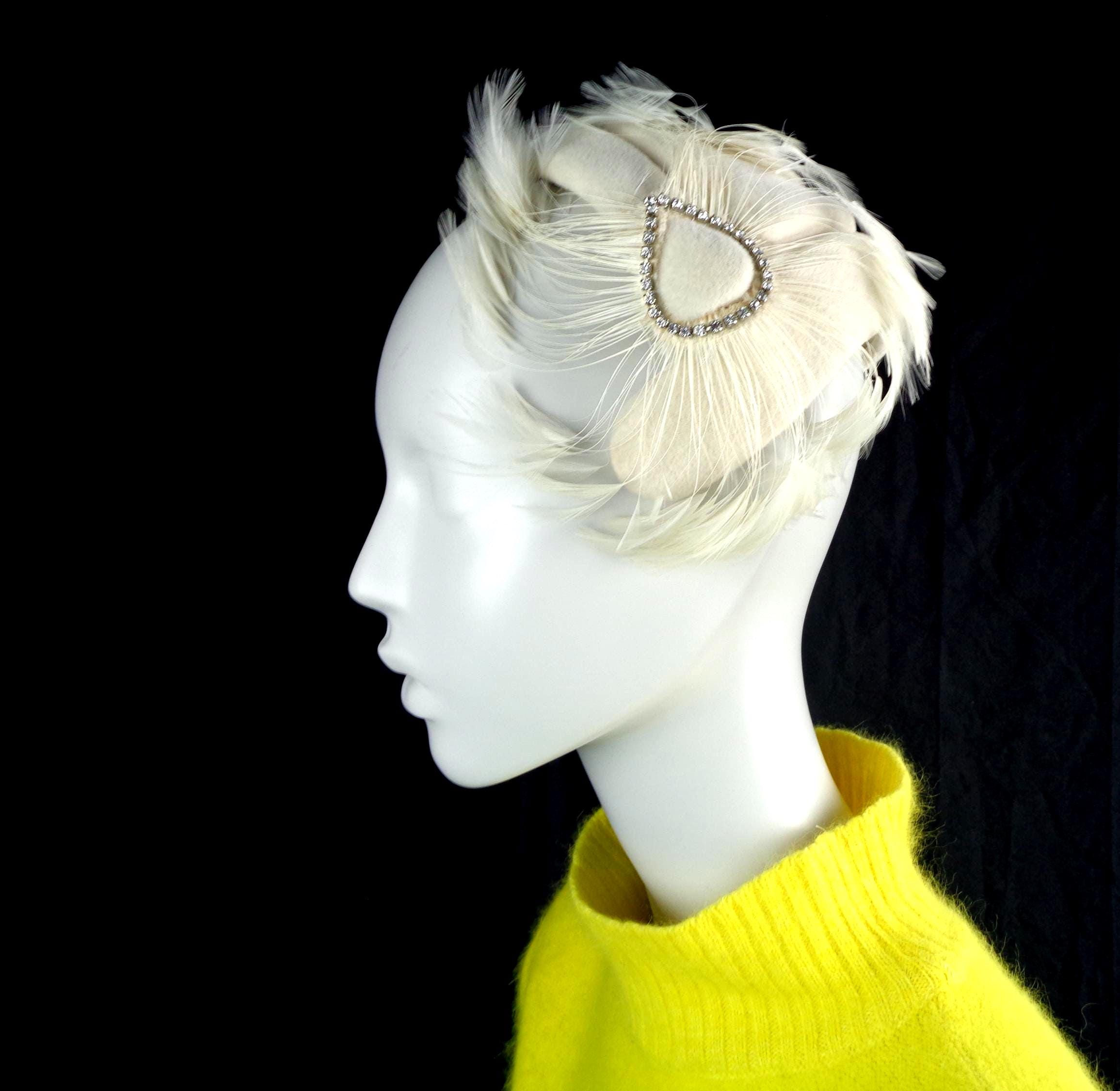 This lovely stylish 1940s 50s off white feather mini half fascinator clamp hat.