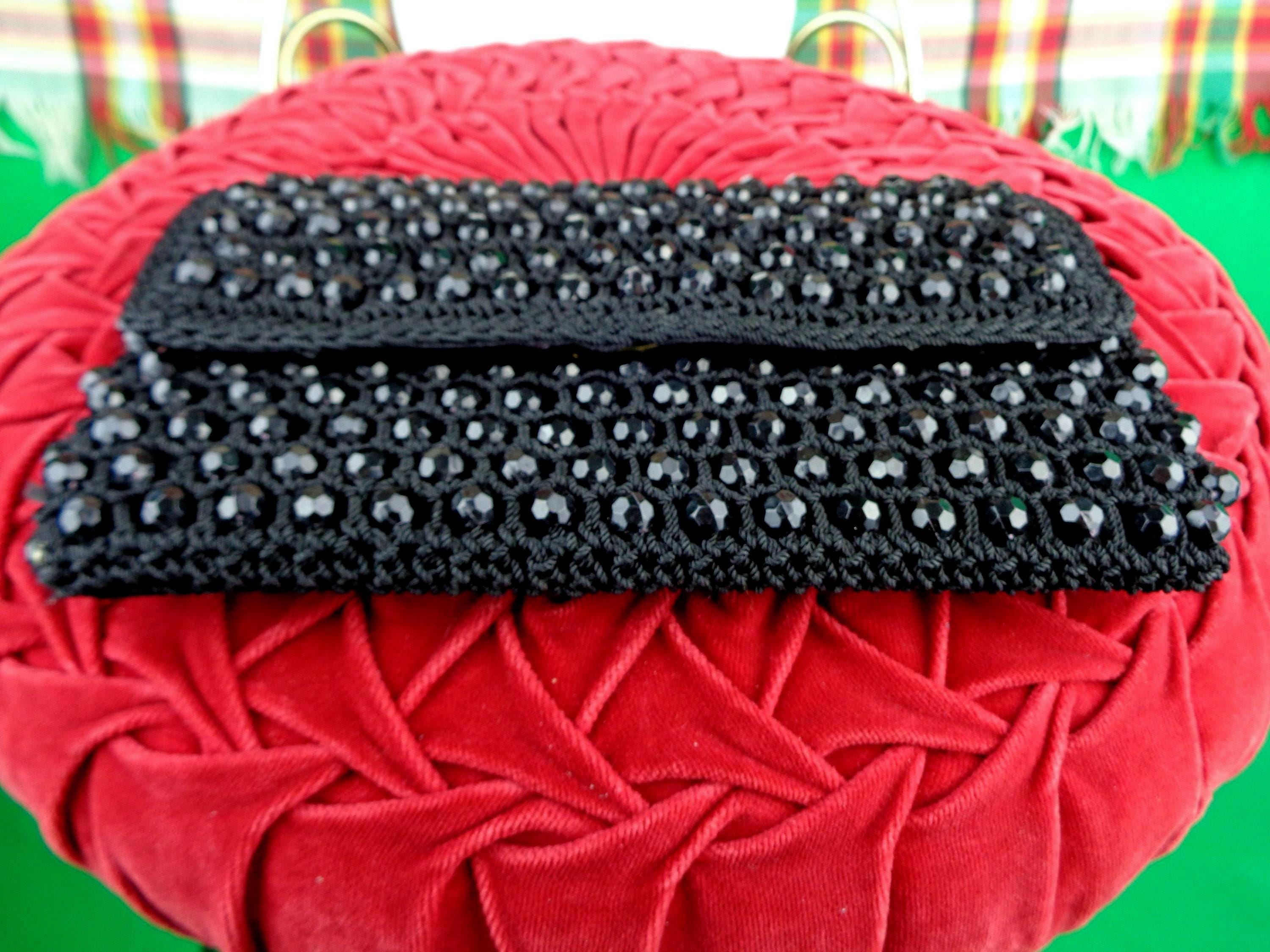 This lovely vibrant 1960s 70s retro clutch, purse, evening bag, handbag. Features an oval clasp front snap closure, with multi sided cut beads that are worked and woven into the cord top material, with knot ends that twist into place that are designed to hold the beads in place! Great compliment piece!