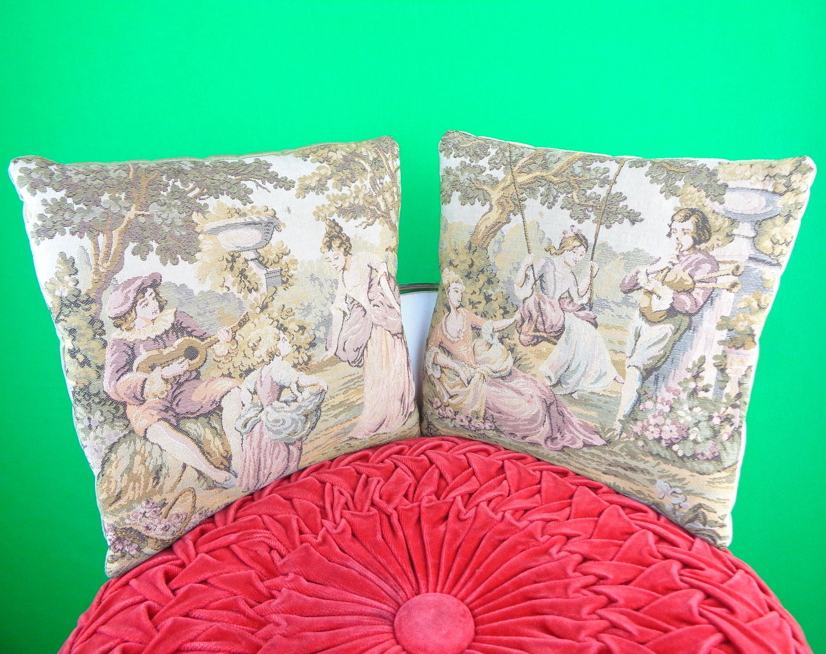 These lovely unique 1930s cushions, pillows. Features 3 friends enjoying a warm summers day on a swing relaxing listening to the bellow of bag pipes and a couple and their daughter playing the guitar! Great pieces!