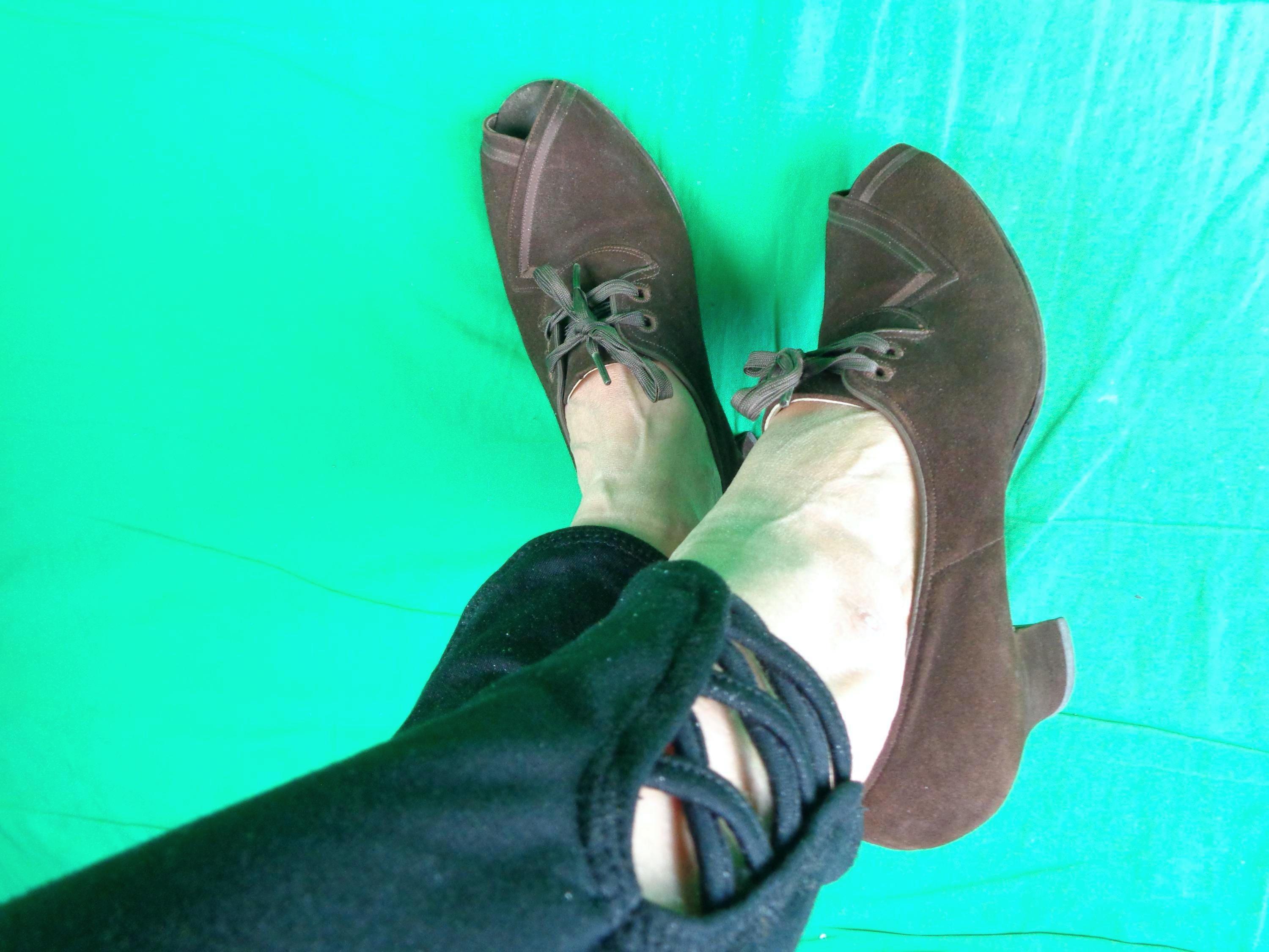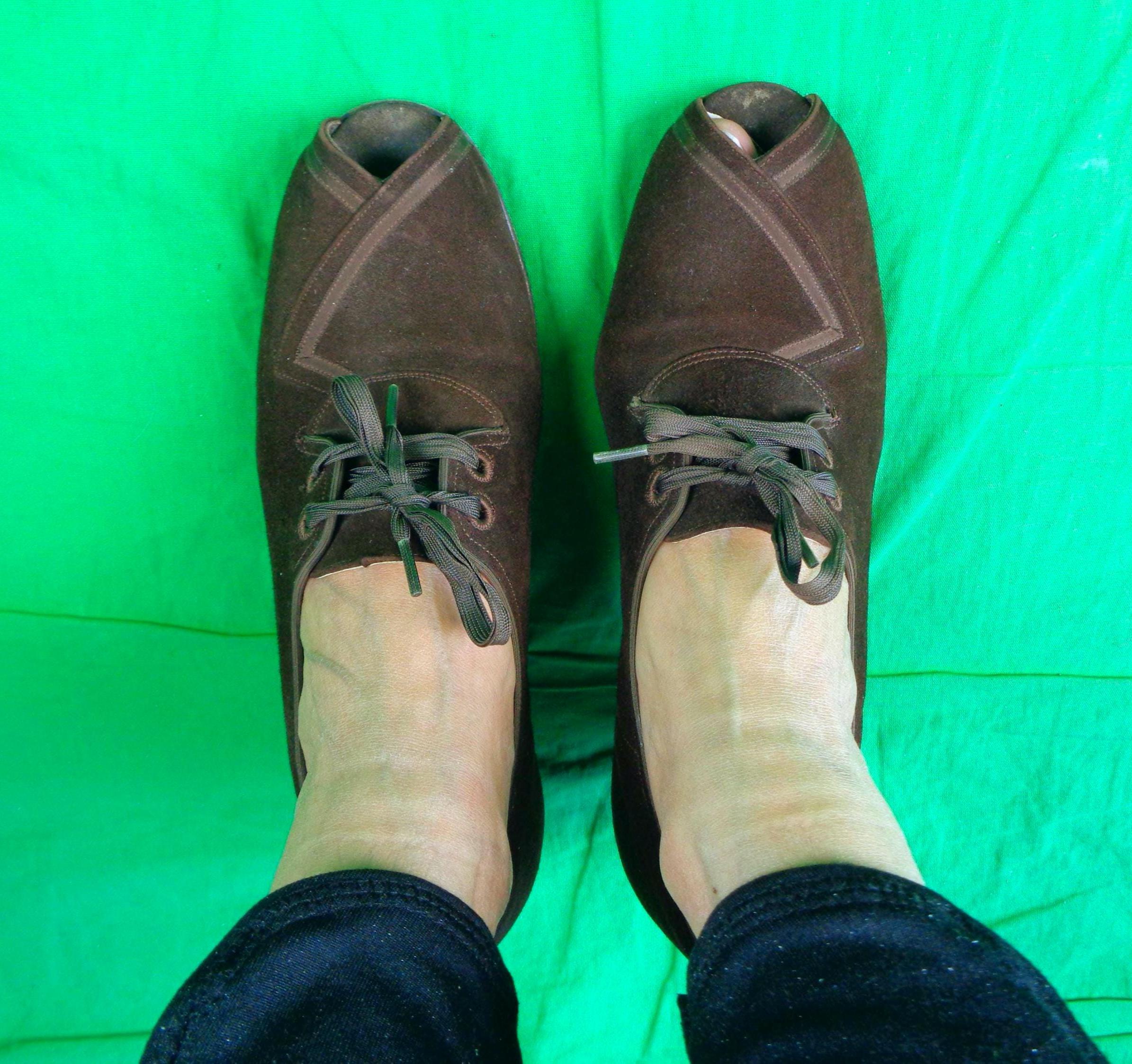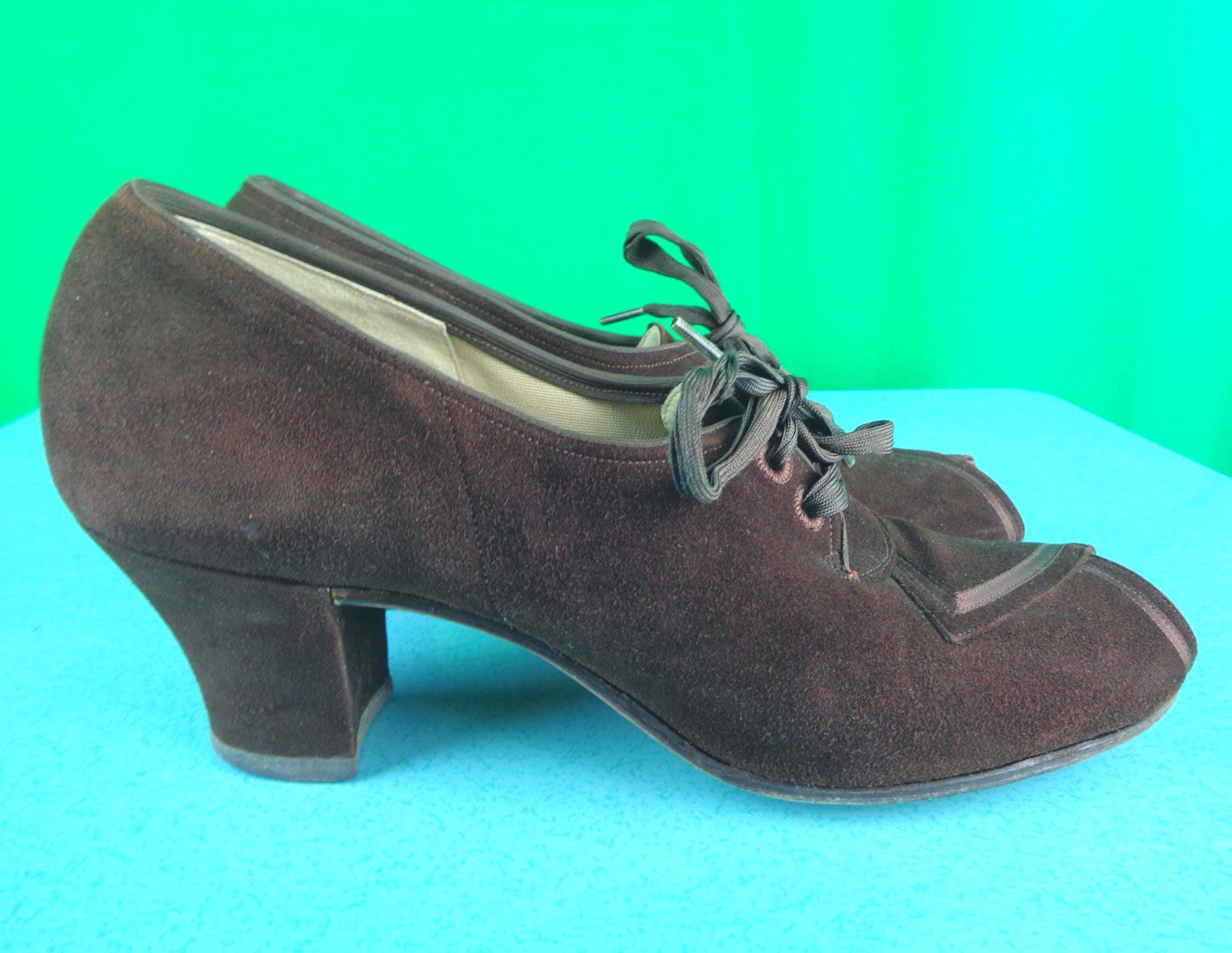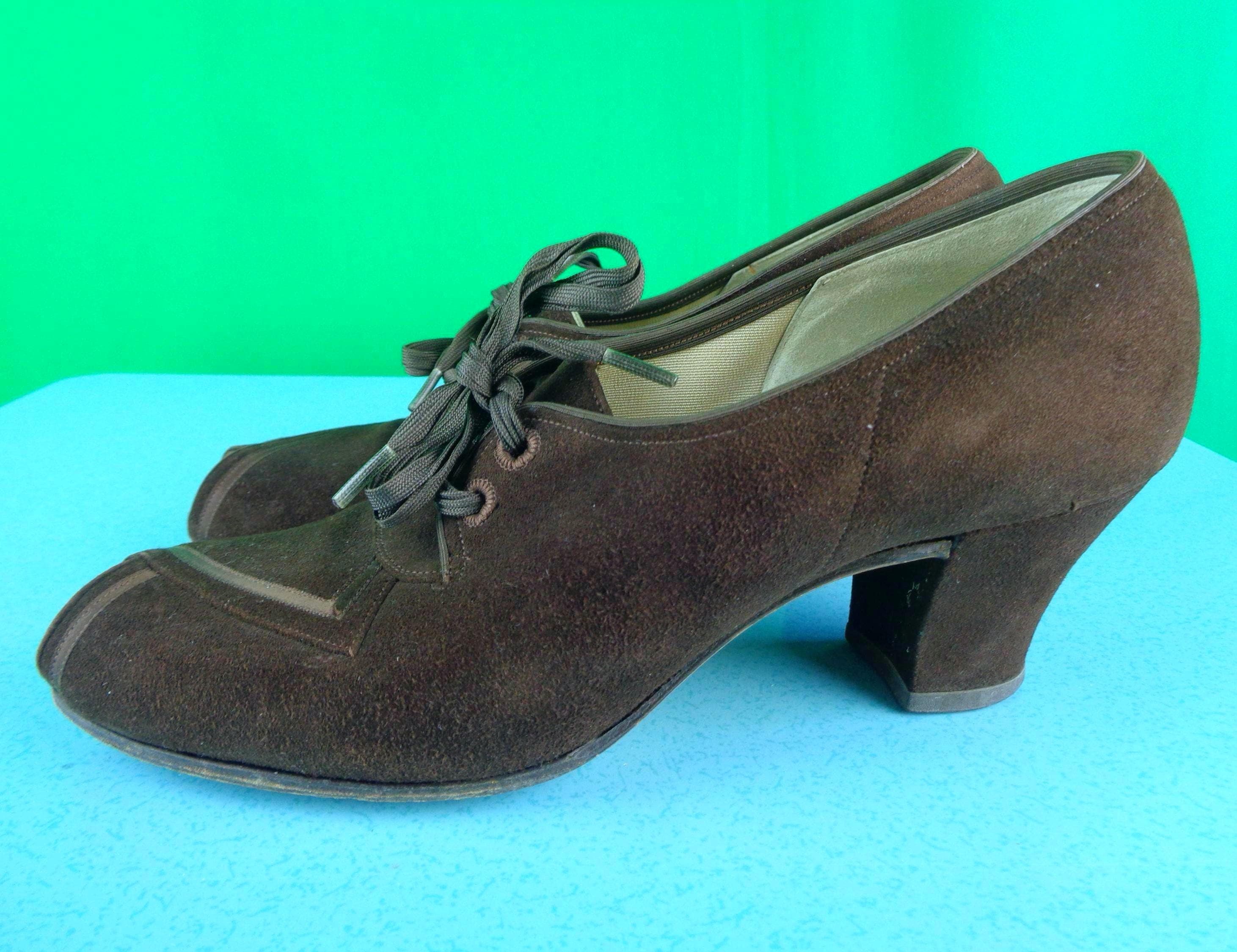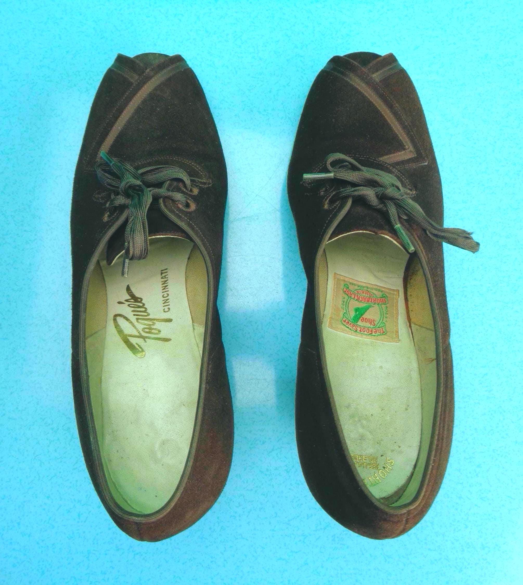 These lovely unique, vibrant, stylish 1930s 40s shoes, oxfords, pumps, footwear. Features the original tie lace up front, zigzag stitched pattern, design vamp, with V peep toes, matching shoe tongue with a point, with the original factory tag inside right shoe! Great piece!