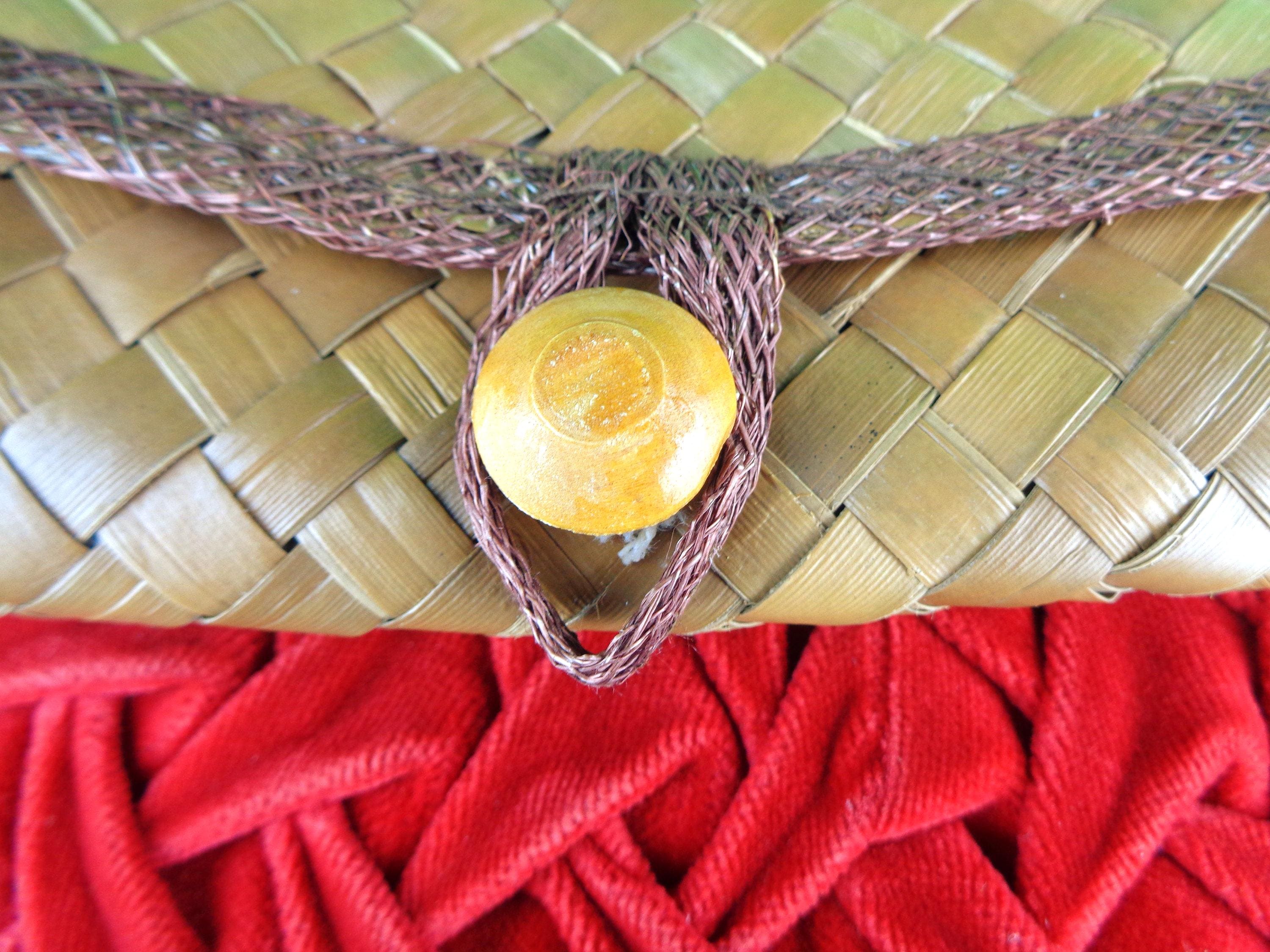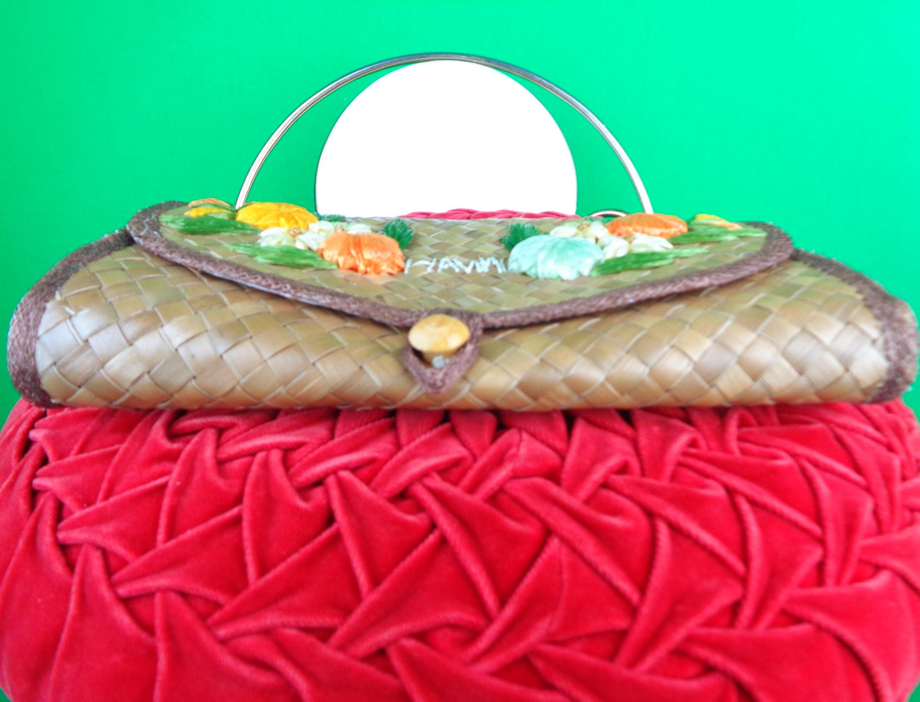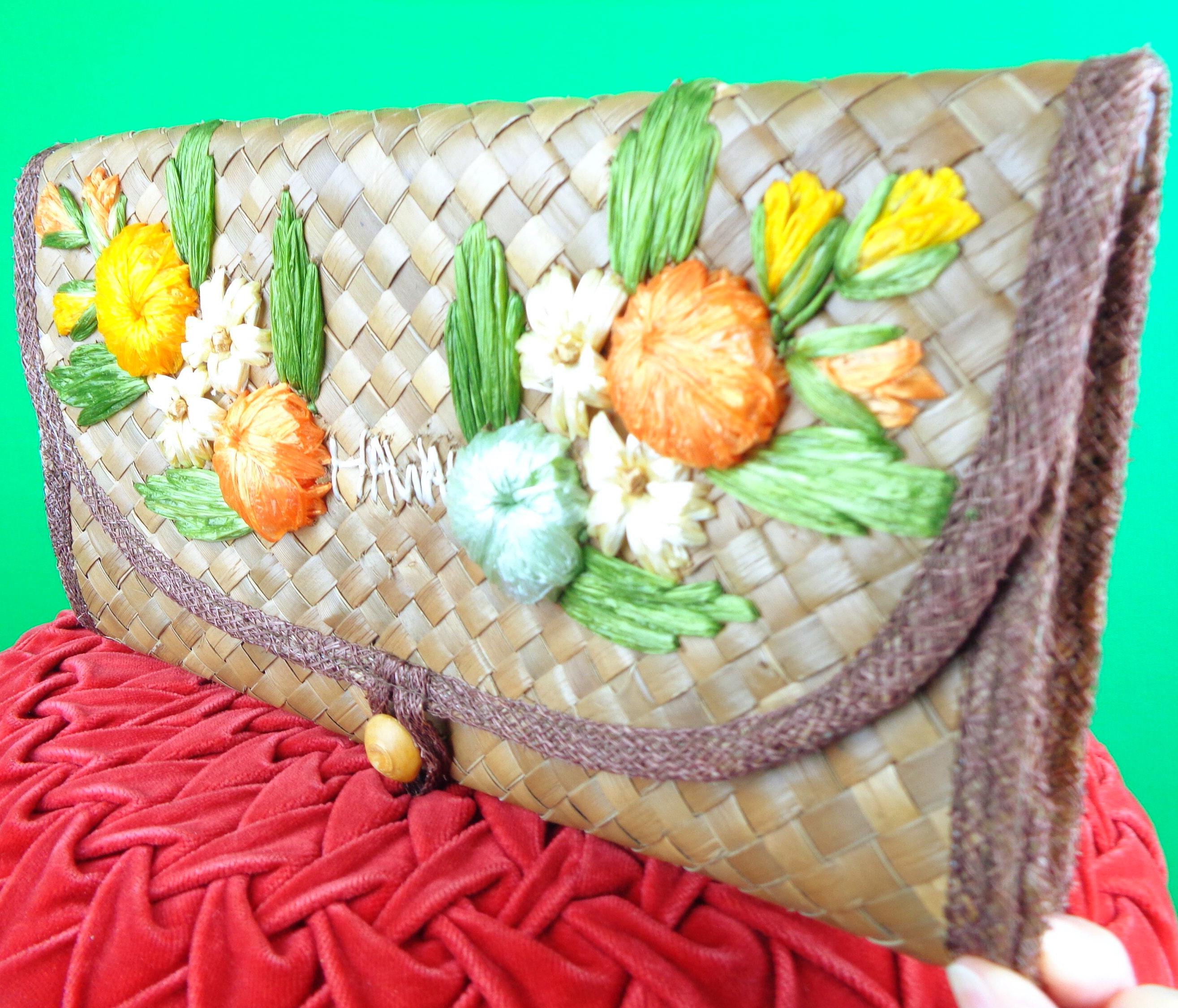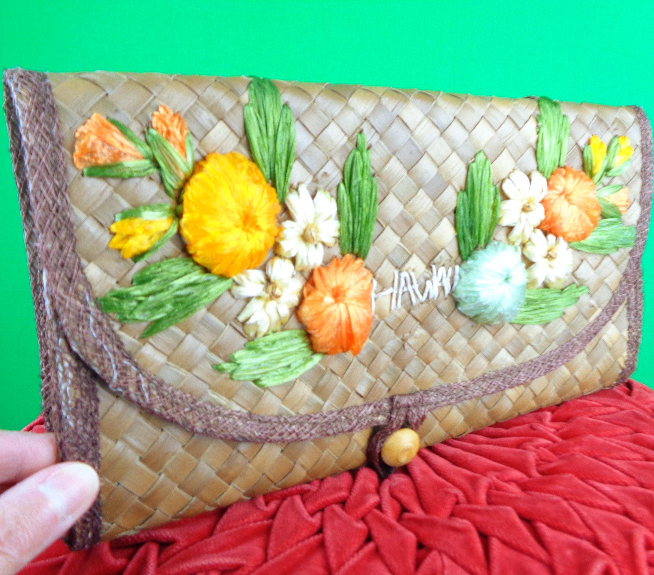 This lovely stylish 1950s 60s clutch, purse, handbag features a variety of 14 woven flowers on the front, a wooden loop closure, with stitched border, a crossover woven pattern throughout!