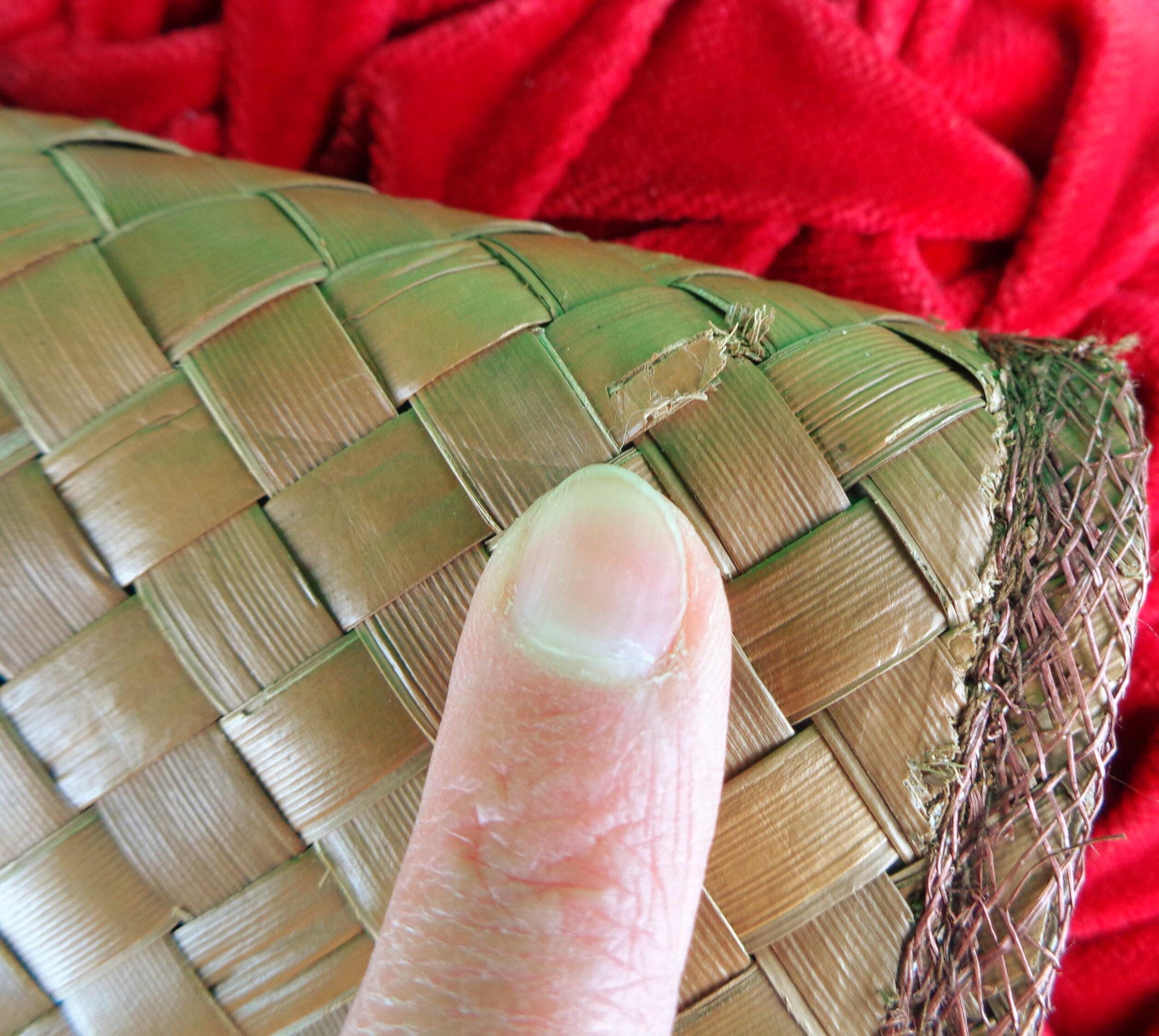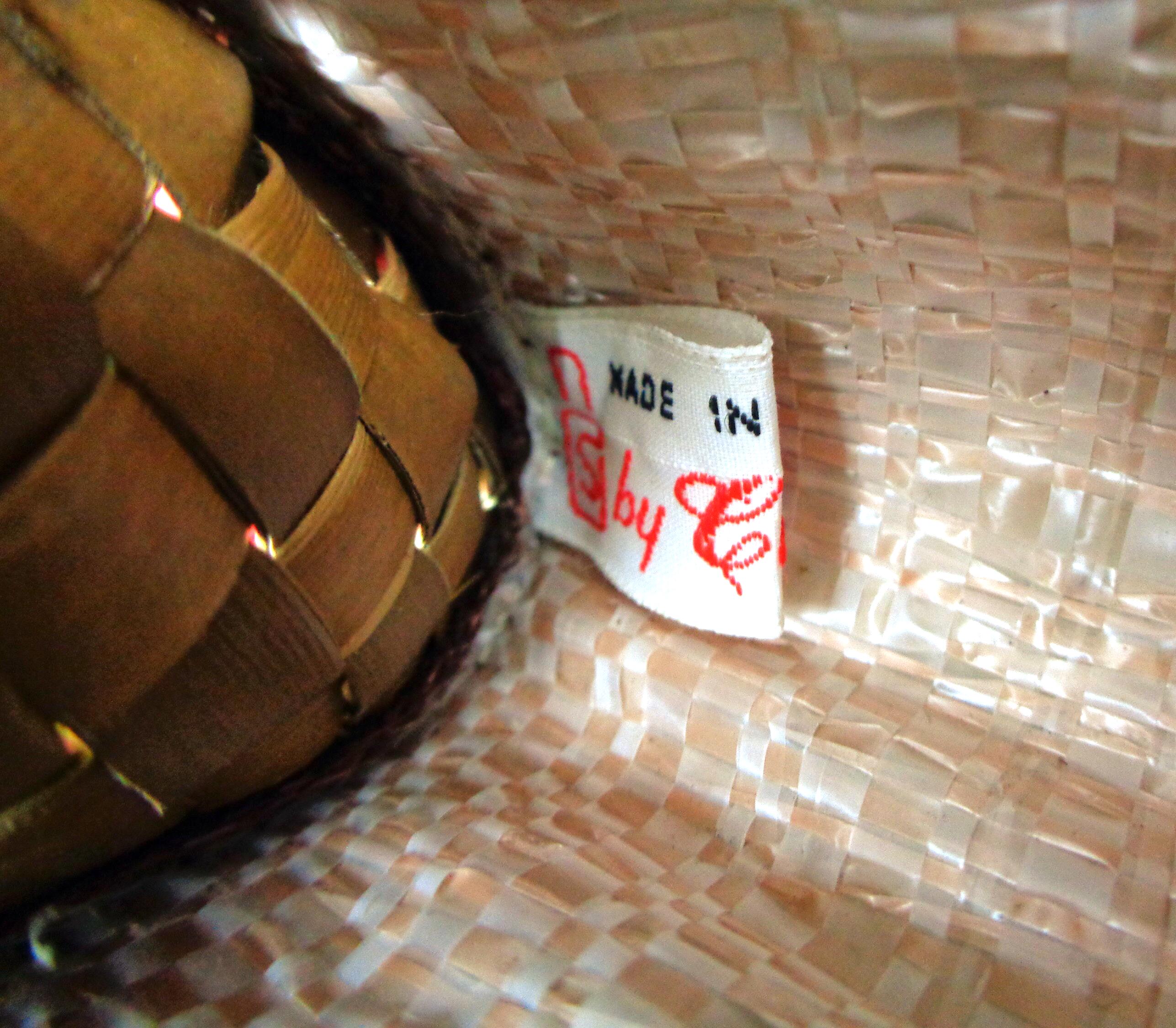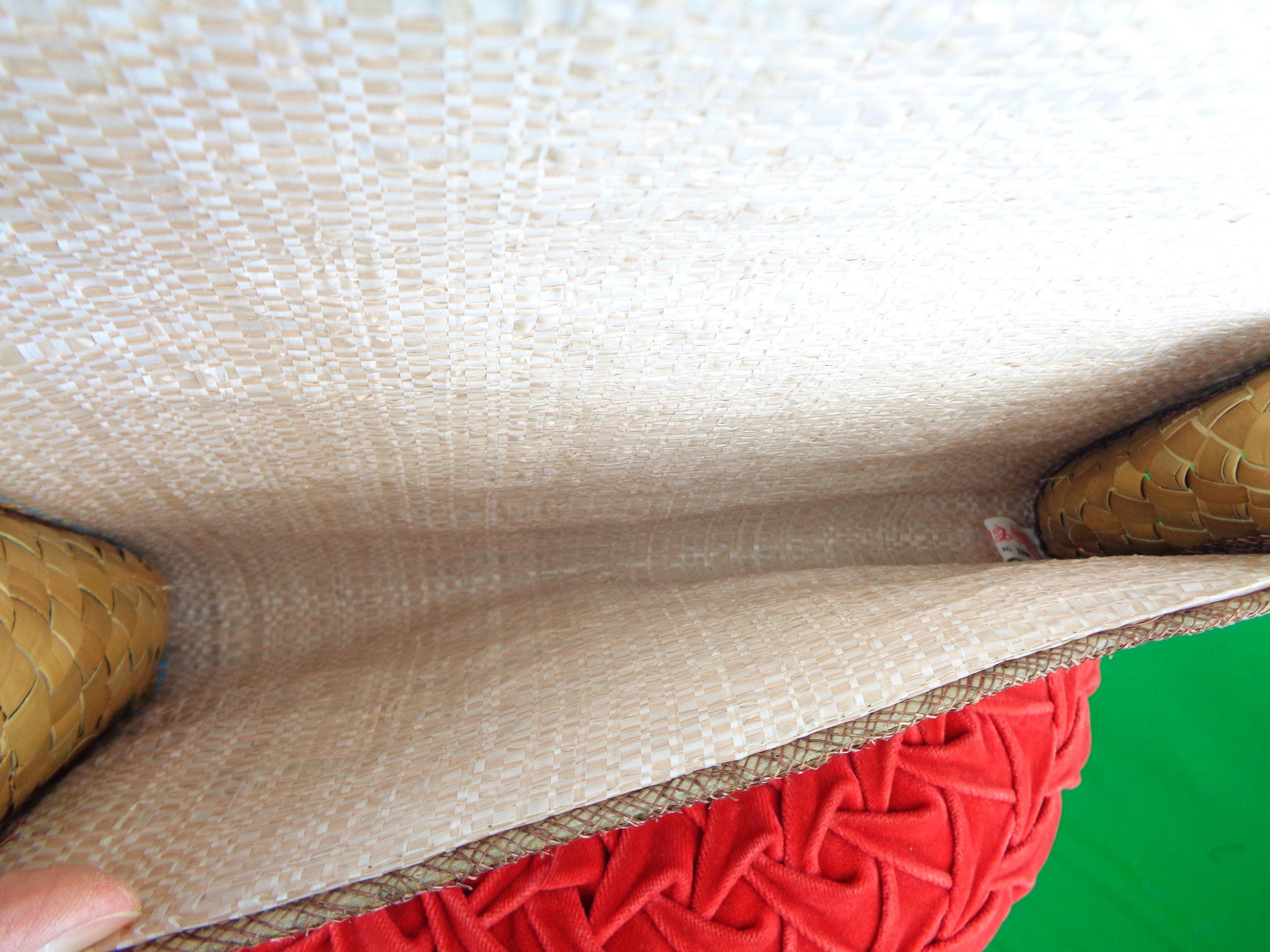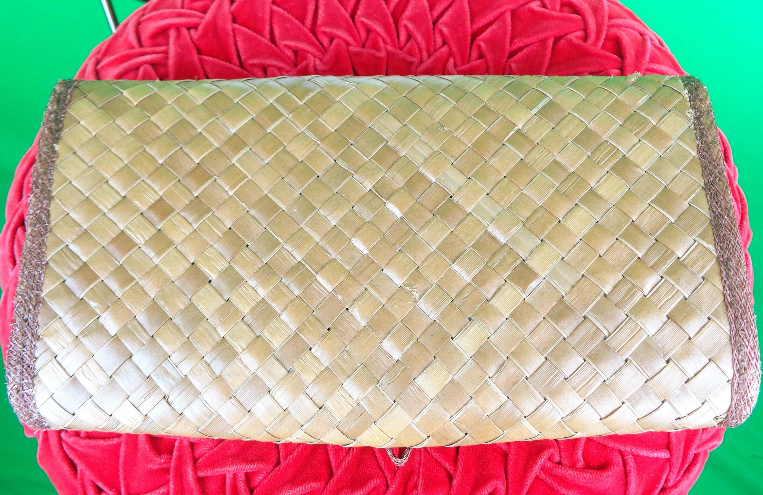 This lovely stylish 1950s 60s clutch, purse, handbag features a variety of 14 woven flowers on the front, a wooden loop closure, with stitched border, a crossover woven pattern throughout!