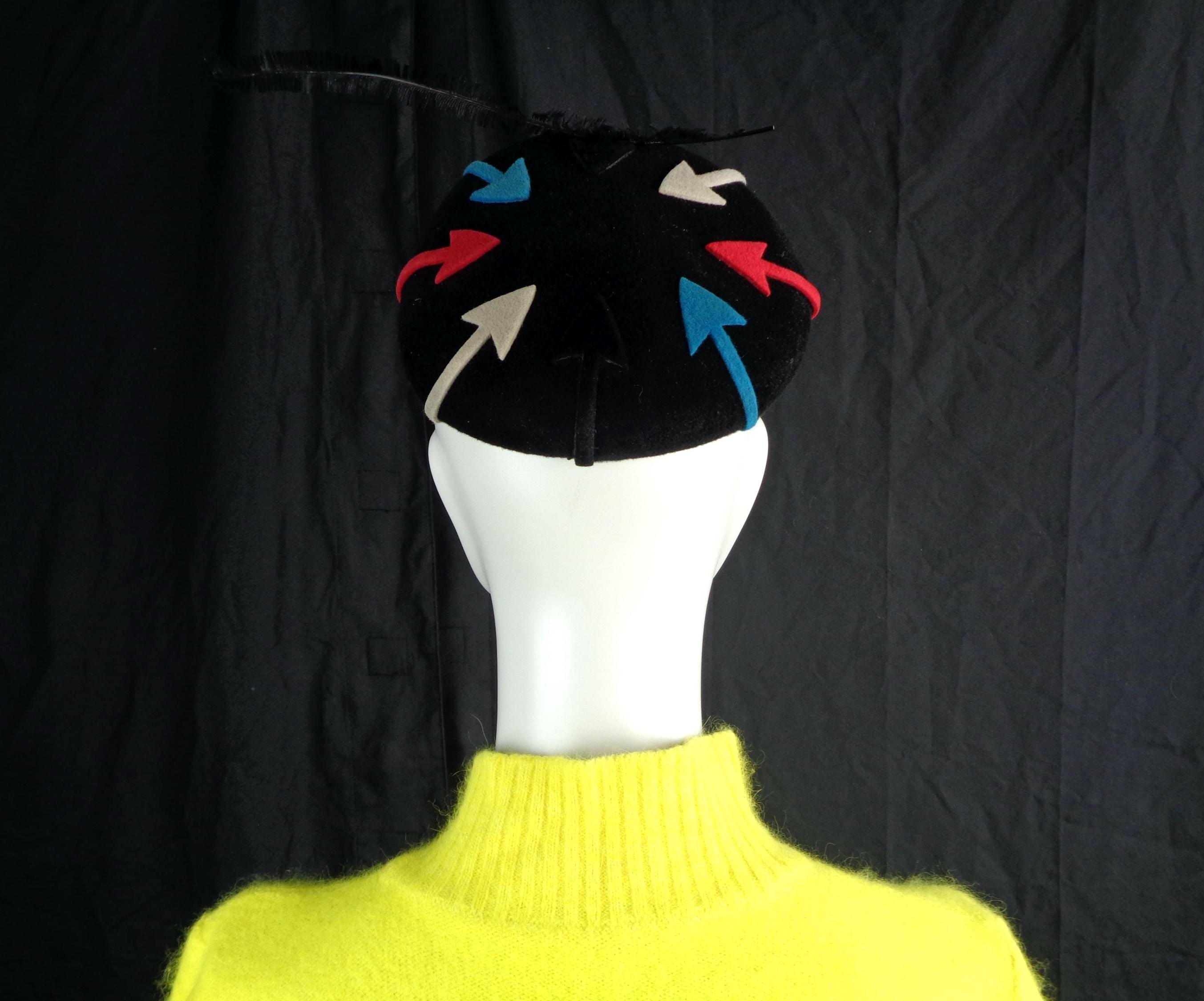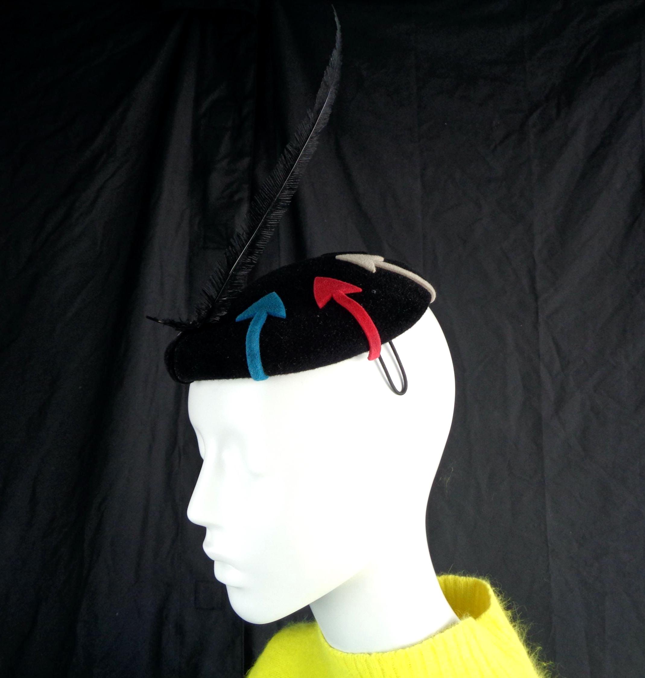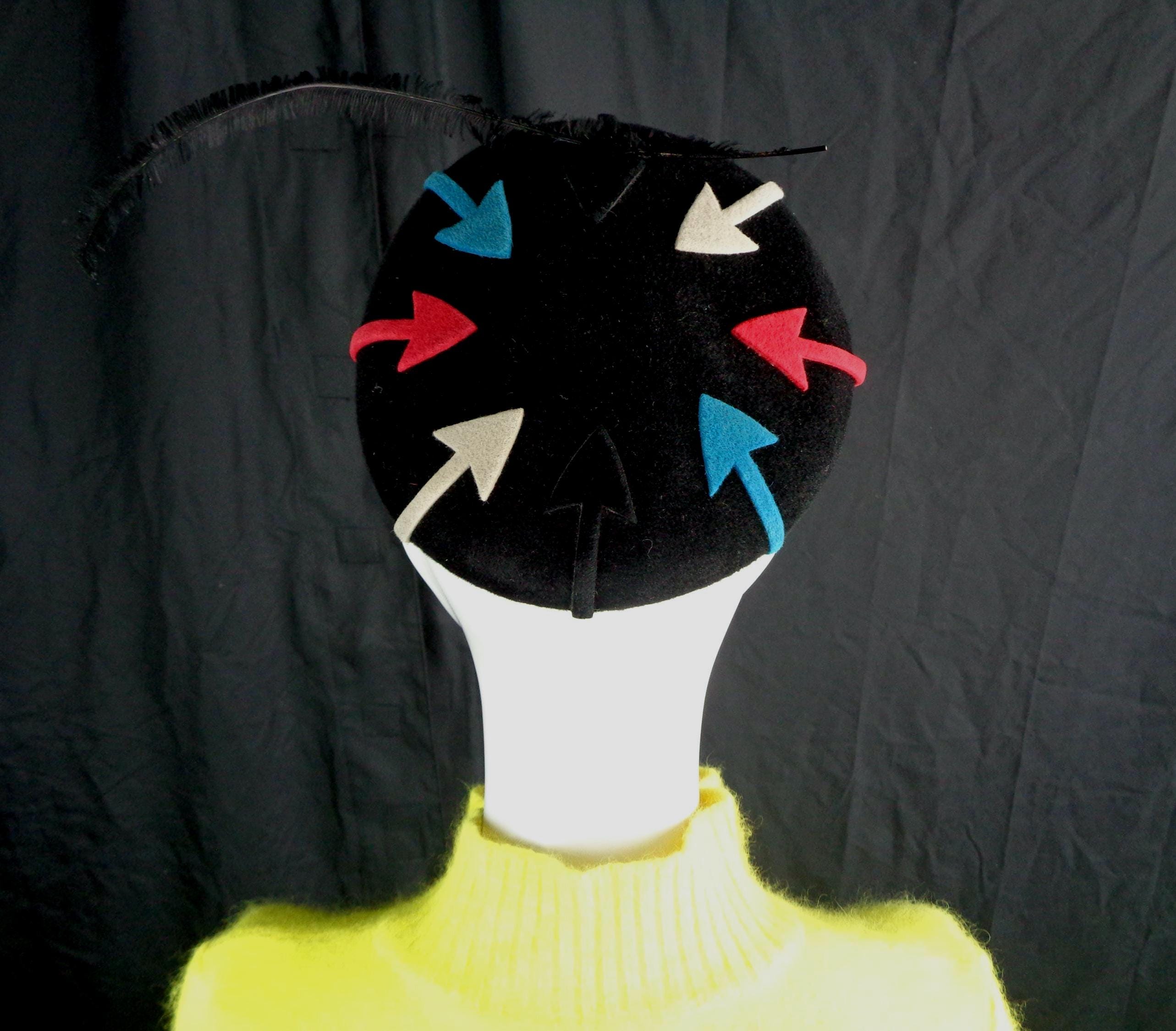 Features a long dainty side decorative feather with 8 designed arrows that surround the top, with 2 sculpted wires loops to hold the hat in place, with ultra soft material throughout! Great compliment piece!