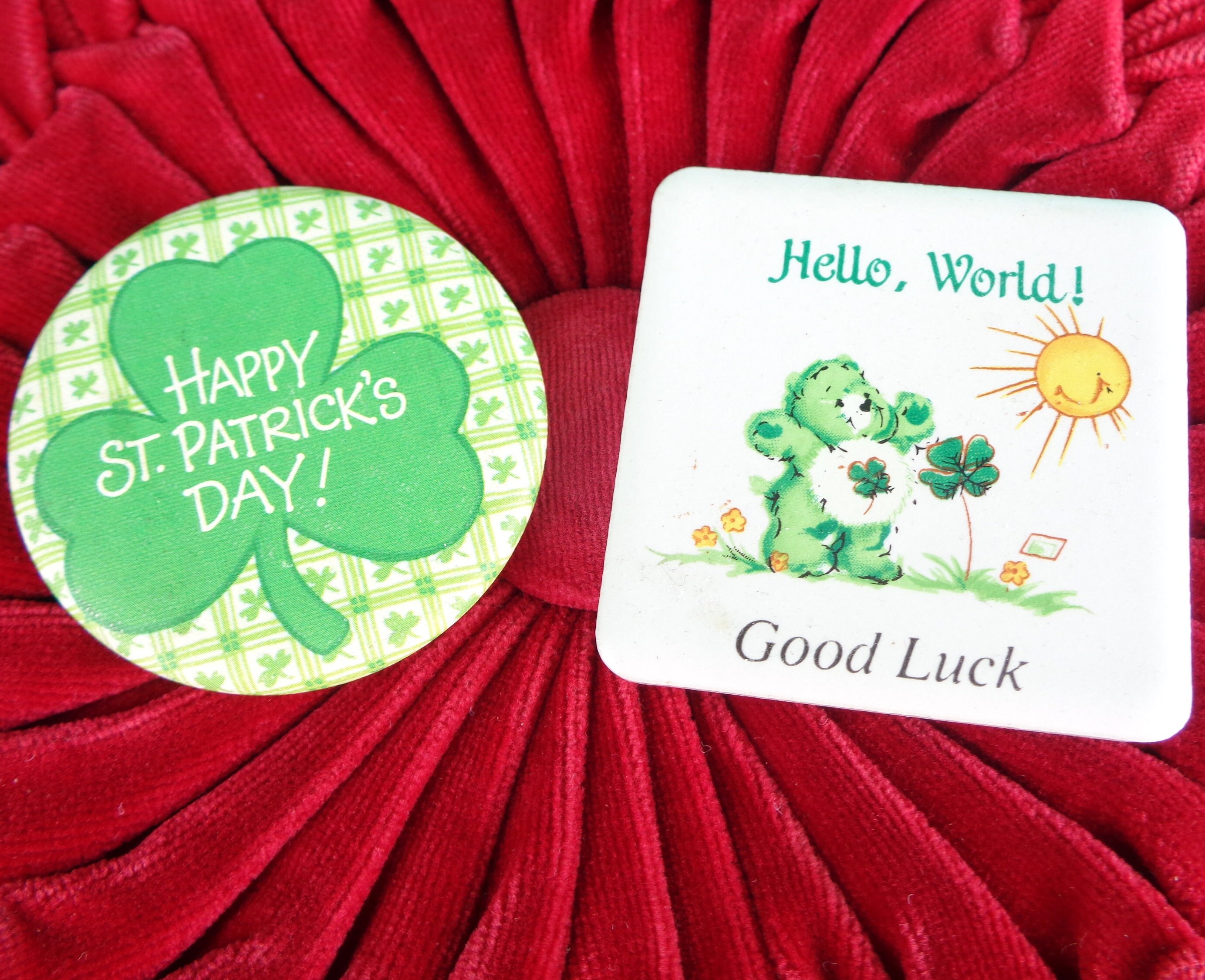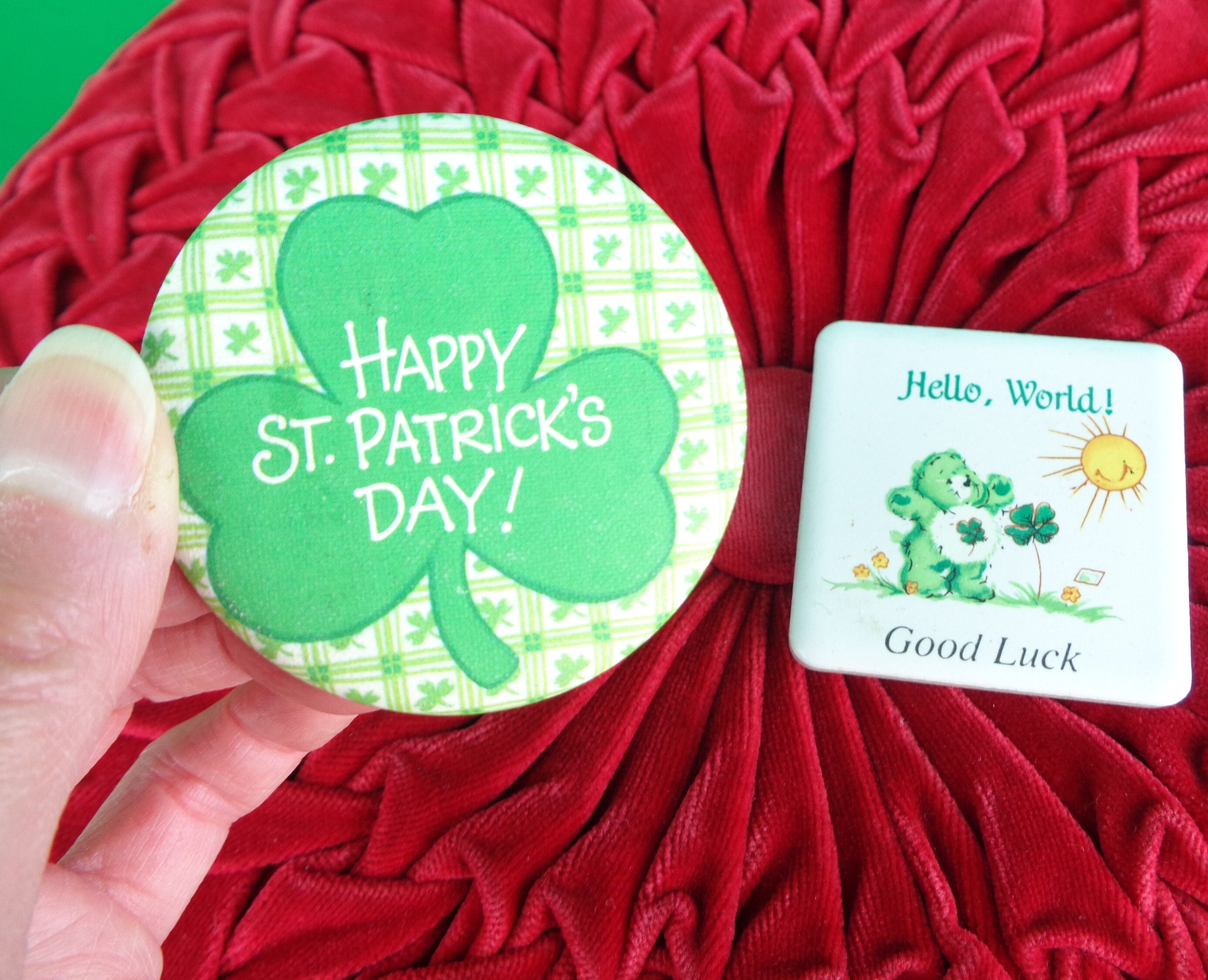 These lovely 1970s 80s pin badge and magnet features St Patrick theme!