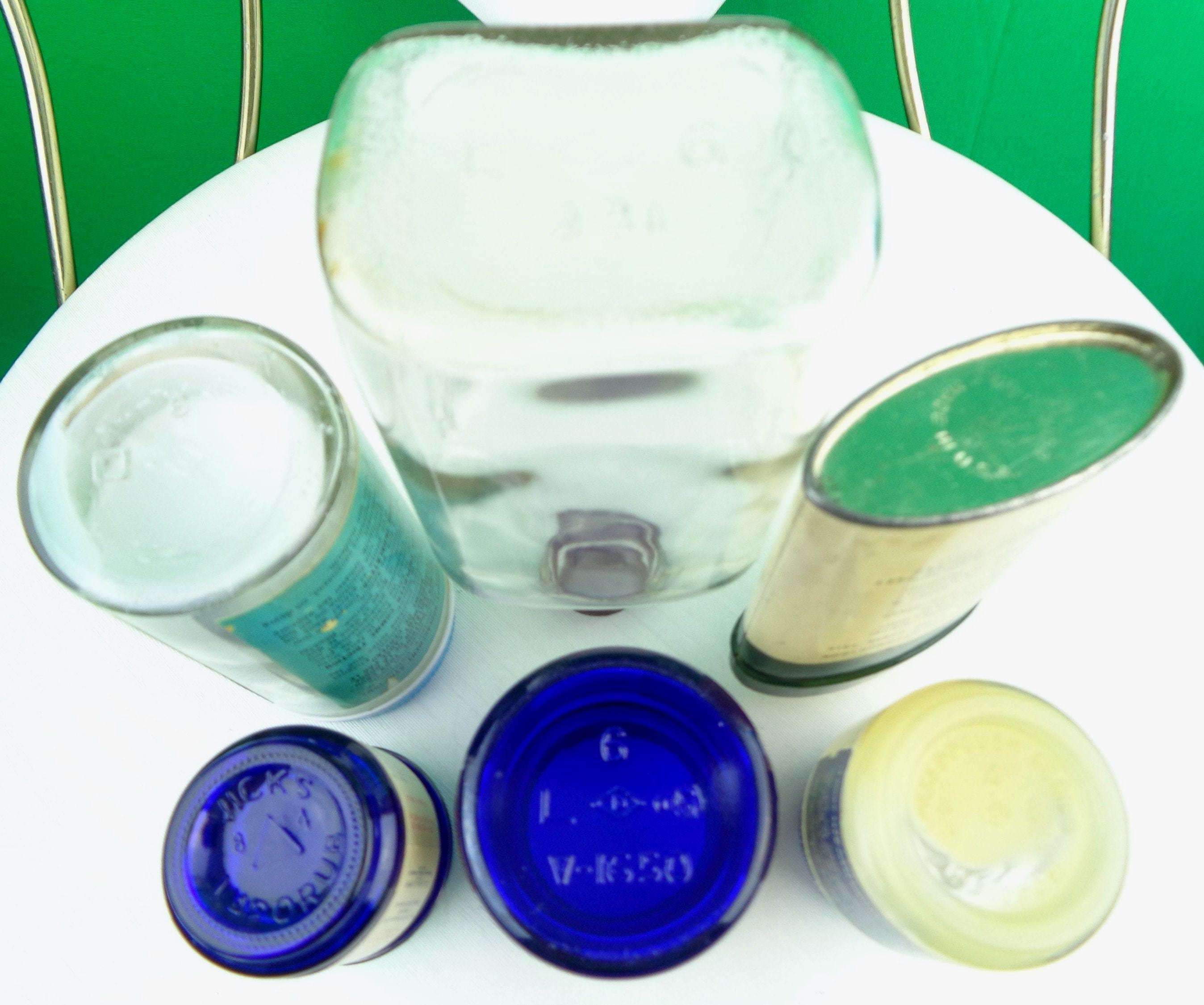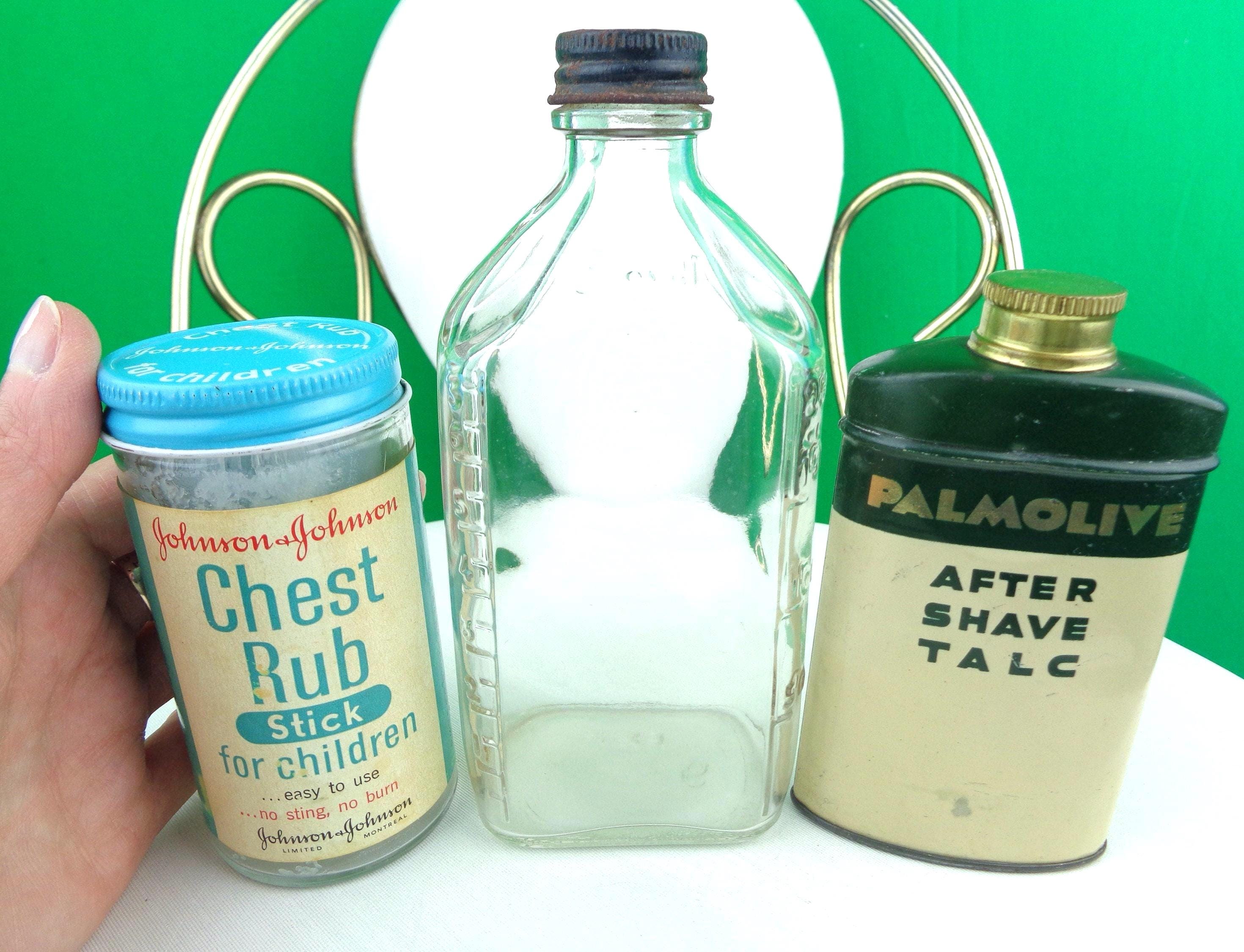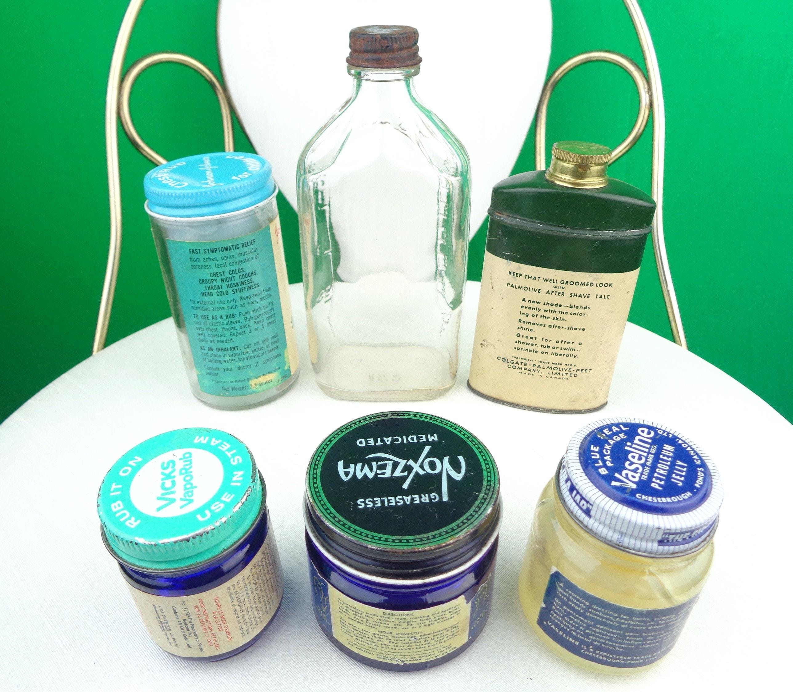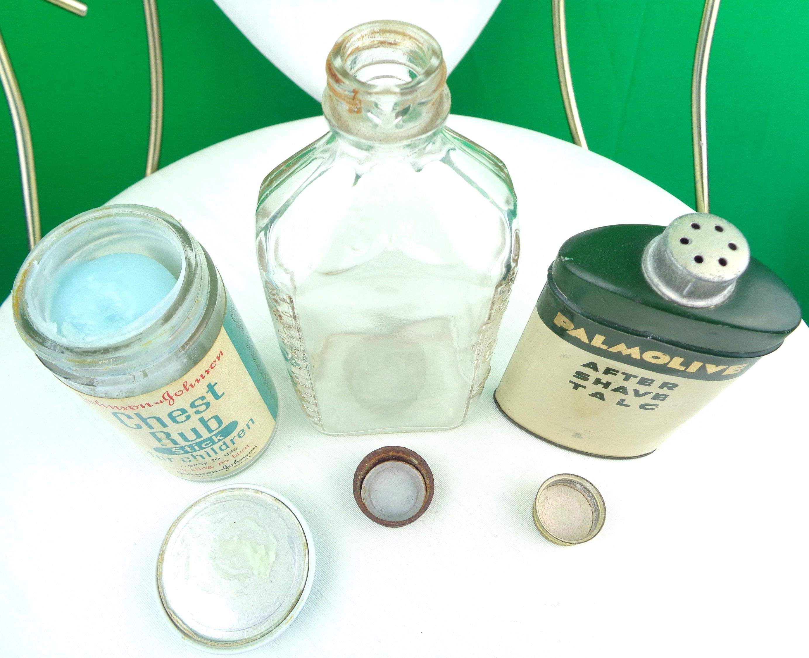 These lovely unique 20s clear medicine bottle, 30s Noxzema cream bottle, 50s-60s Johnson & Johnson bottle, Vaseline bottle, Palmolive talc tin bottles features the original labels and lids and products! Great pieces!