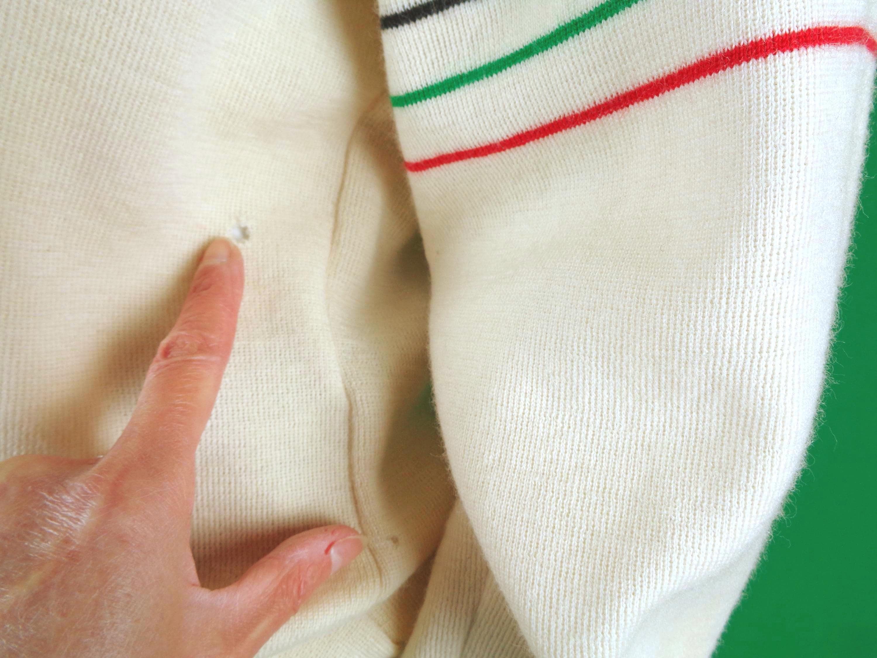 Conditions: Good! some holes, arms front back, front and back couple light stains on arm. No other flaws to note! See pictures for detailed references! Still very wearable!:) Cleaned!
