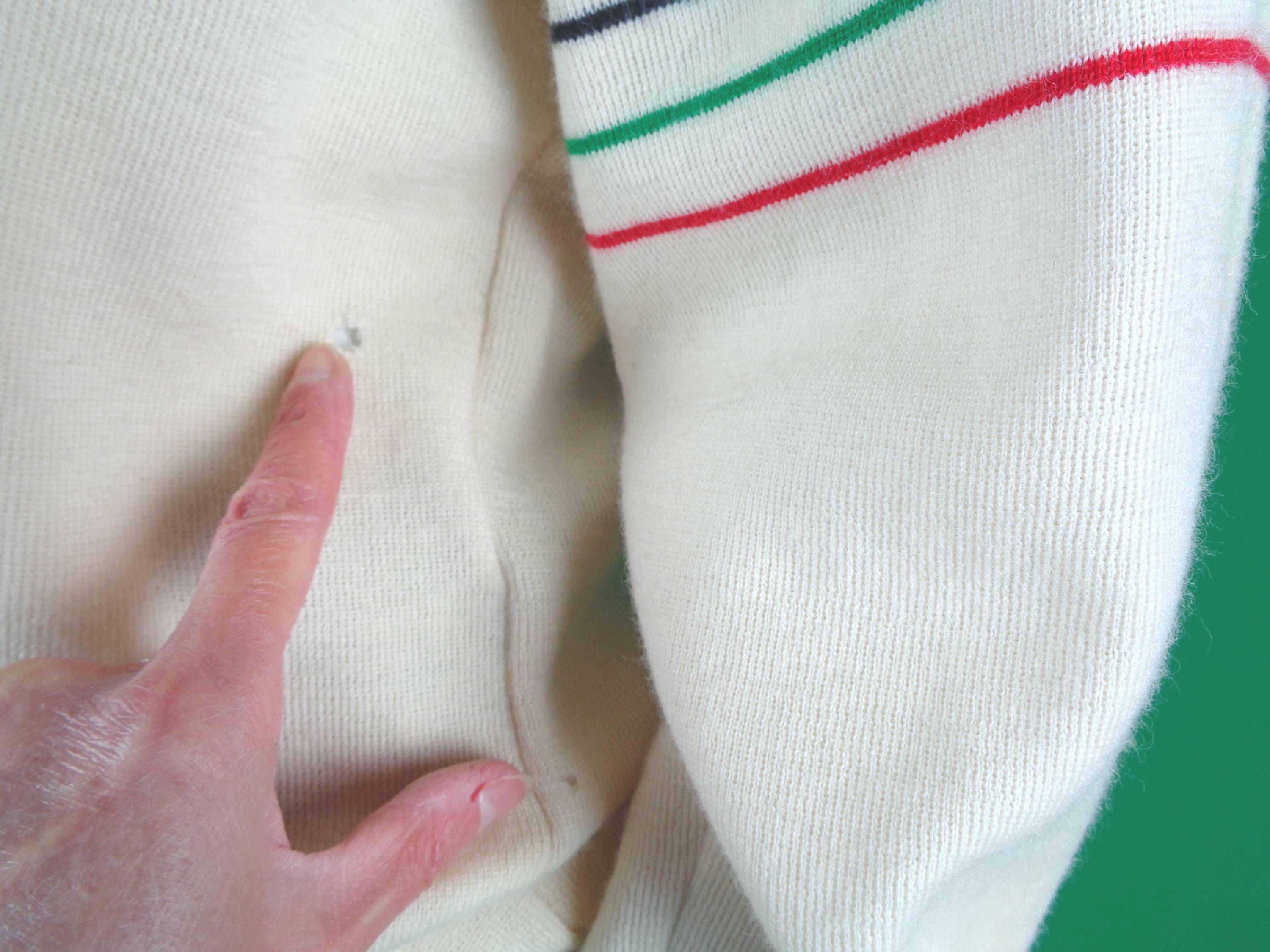 Conditions: Good! Several holes, arms front back, front and back couple light stains on arm. couldn't picture all holes. No other flaws to note! See pictures for detailed references! Still very wearable!:) Cleaned!