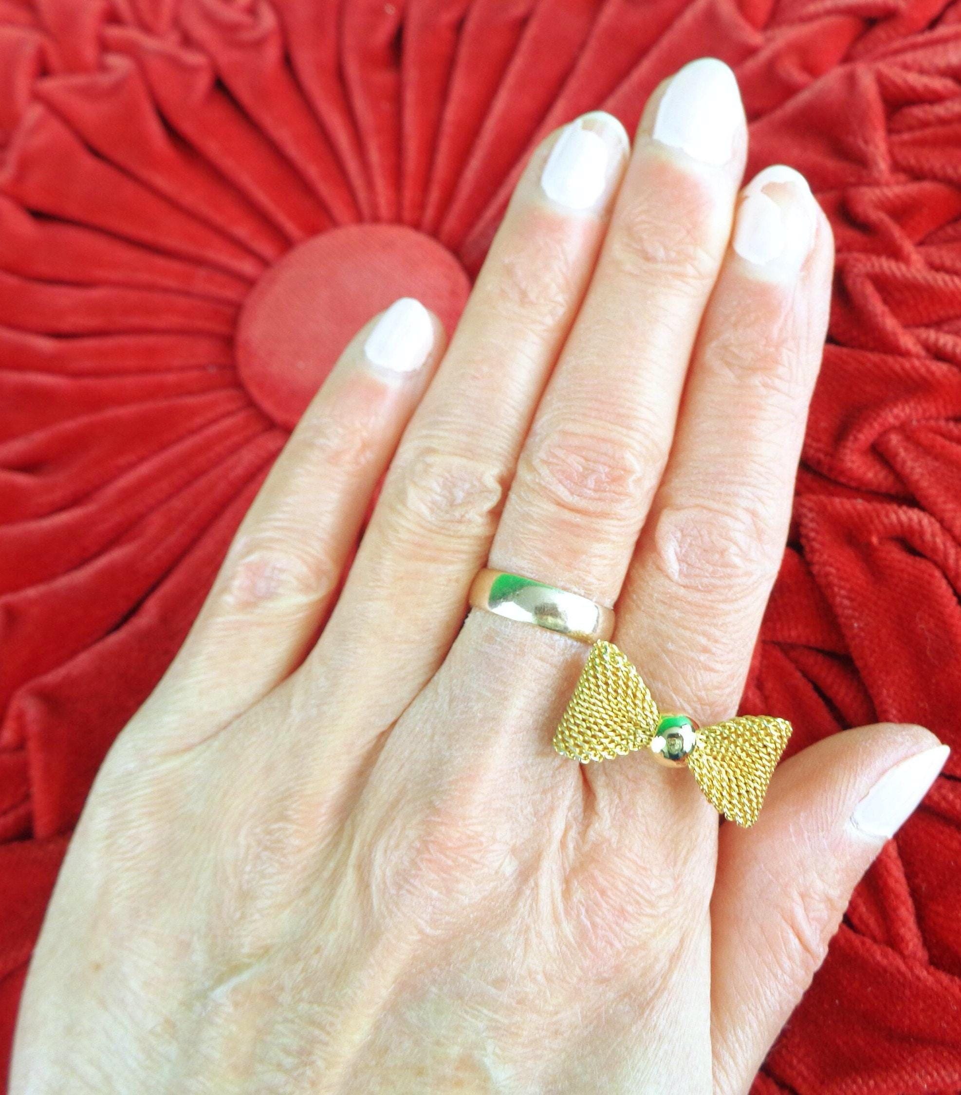 This lovely elegant 1970s 80s bow ring. Features a 3D mesh bow with a mirror center accent, with an adjustable band for most sizes! Great compliment piece!
