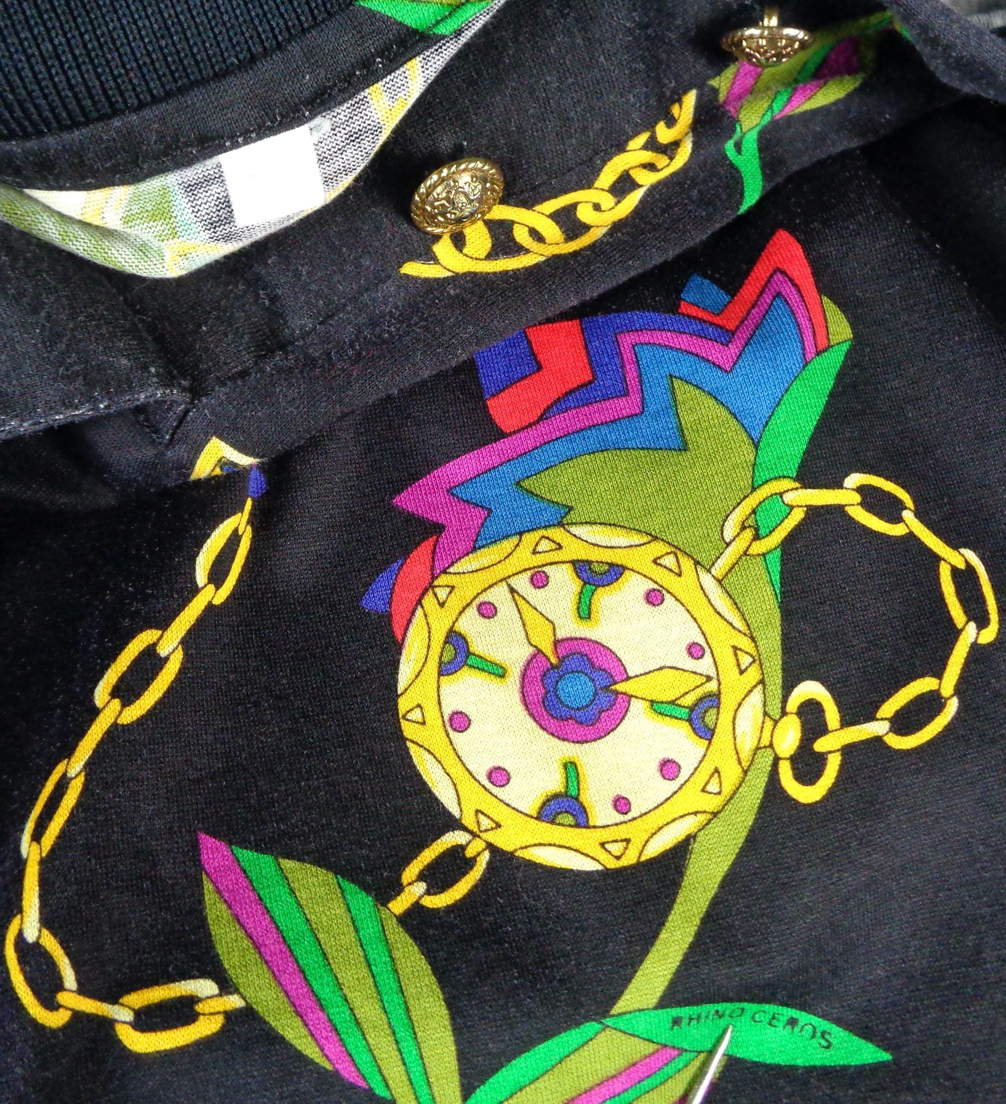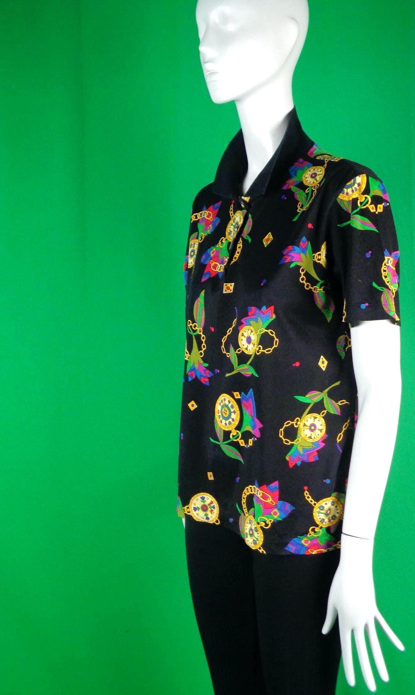 Features 3 front decorative buttons, iconic 80s snap collar, chain pocket watch floral pattern, design, with soft material, fabric throughout! Great compliment piece!