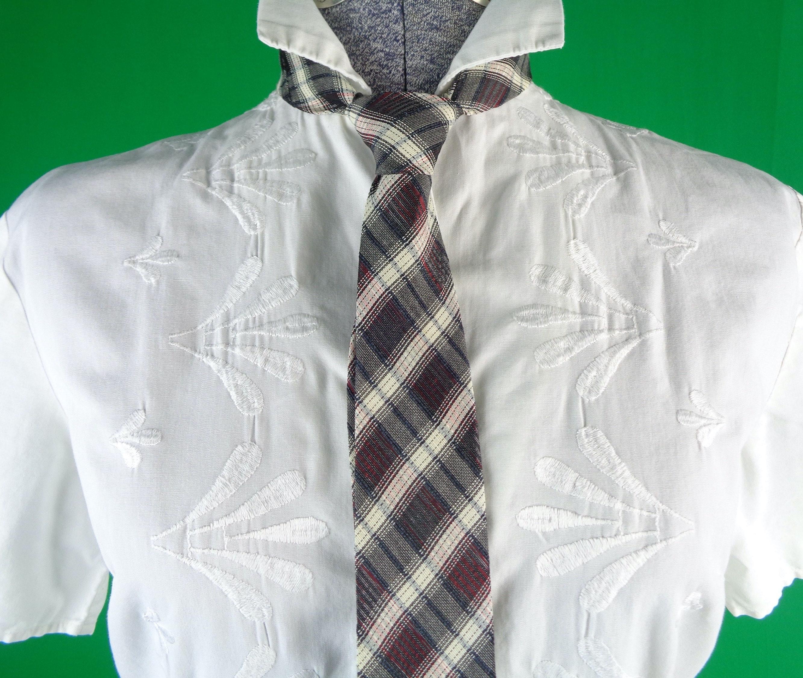 This lovely stylish 1940s 50s necktie, self tie. Features a uniquely crafted, with a muted ray of colors stitched in a plaid, tartan pattern design throughout! Greta compliment piece!