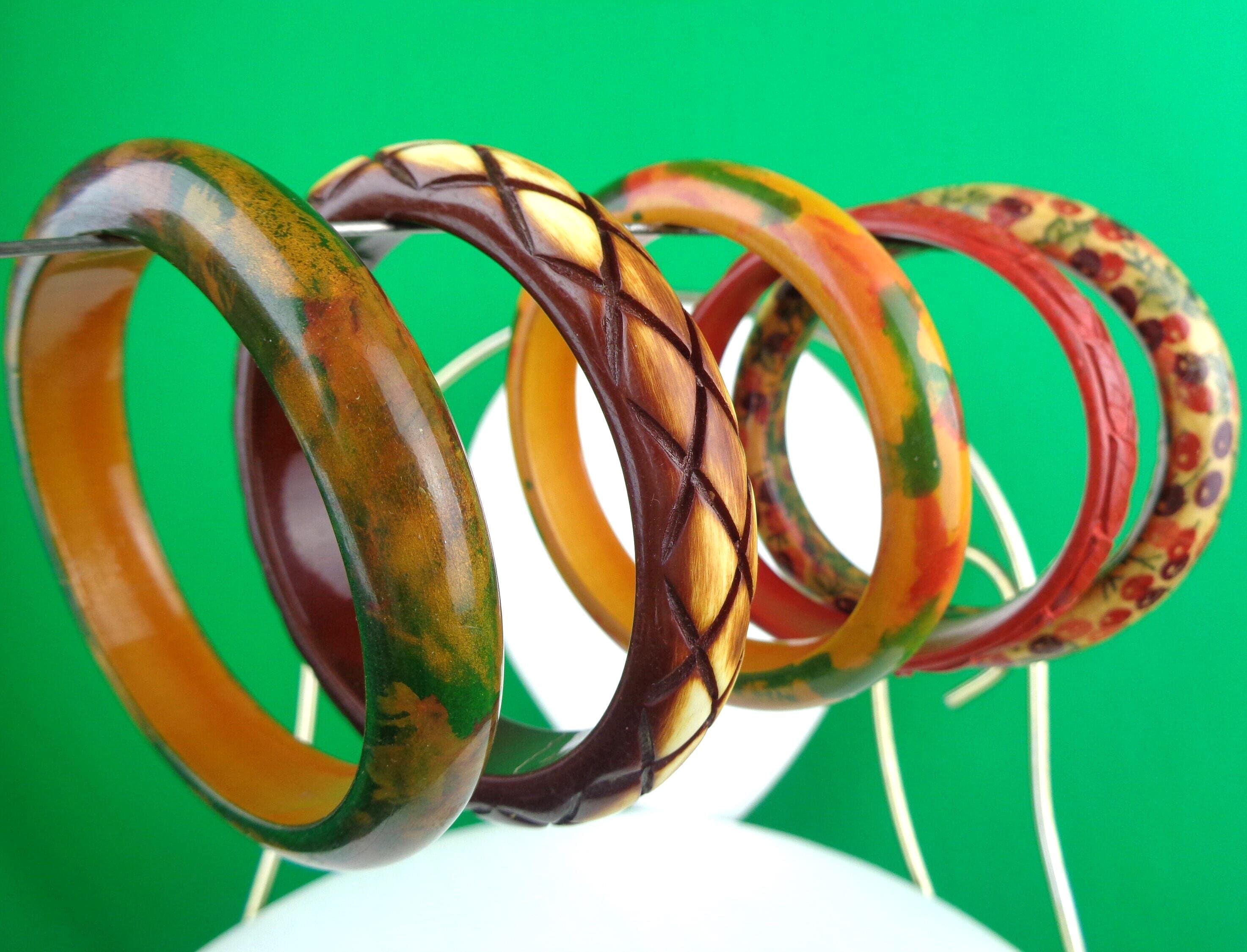 These lovely unique 1960s 70s retro slides bracelets, bangles, spinners, laminated textile wood. Features 5 different styles and colors #1 carved leaf #2 carved argyle #3 berry #4 yellow abstract #5 green abstract, glossy, textured finish throughout! Great compliment pieces!