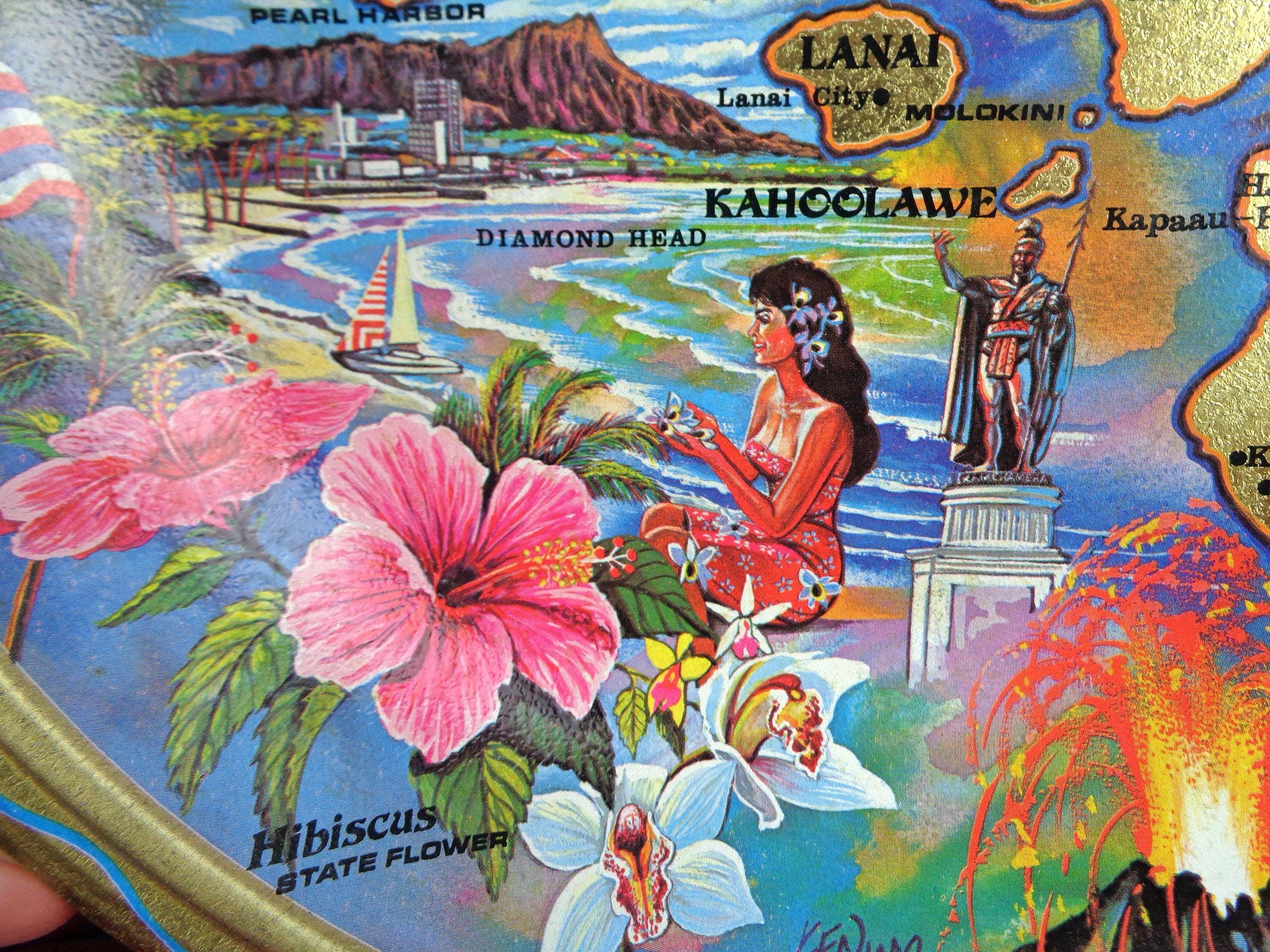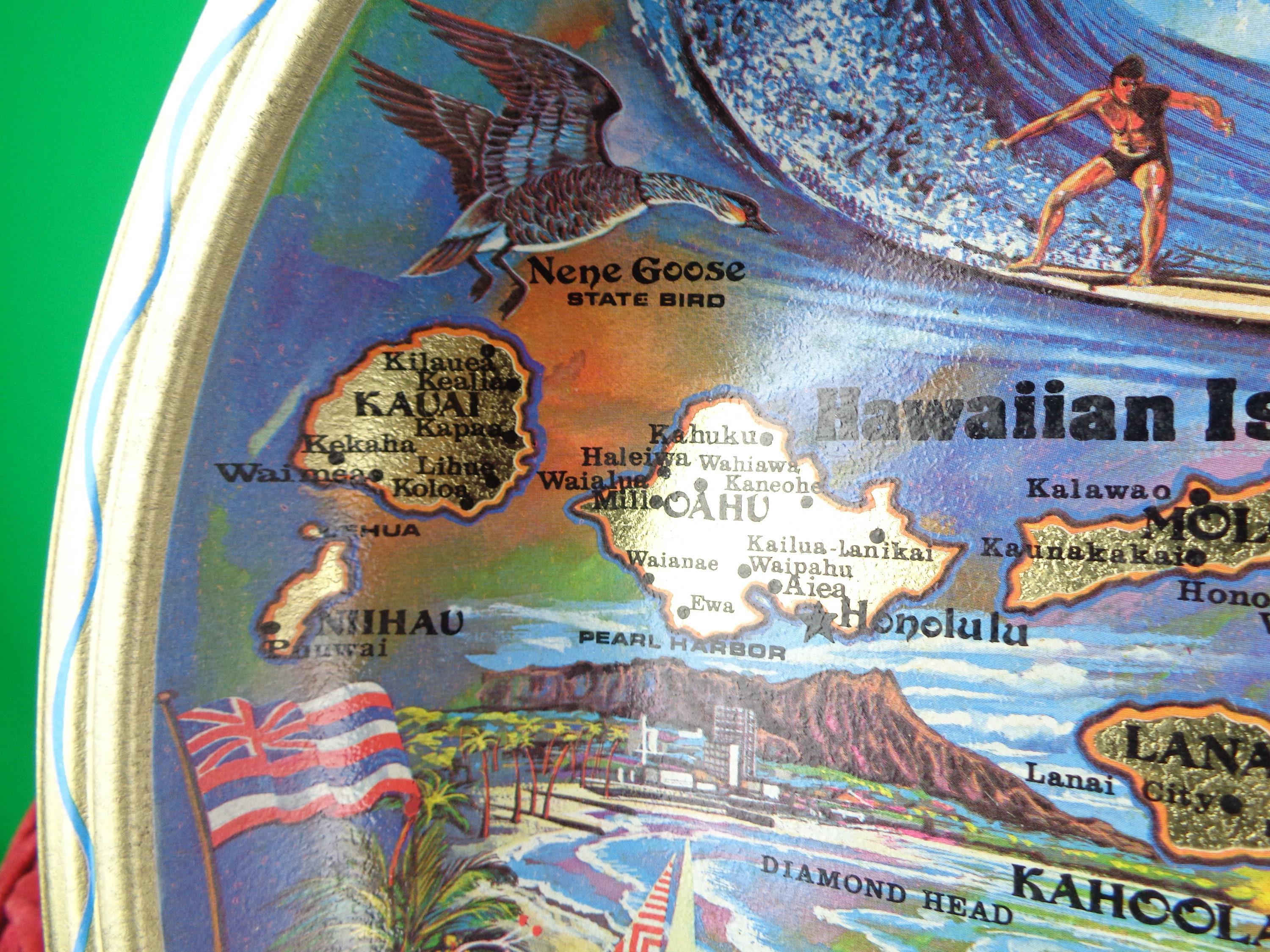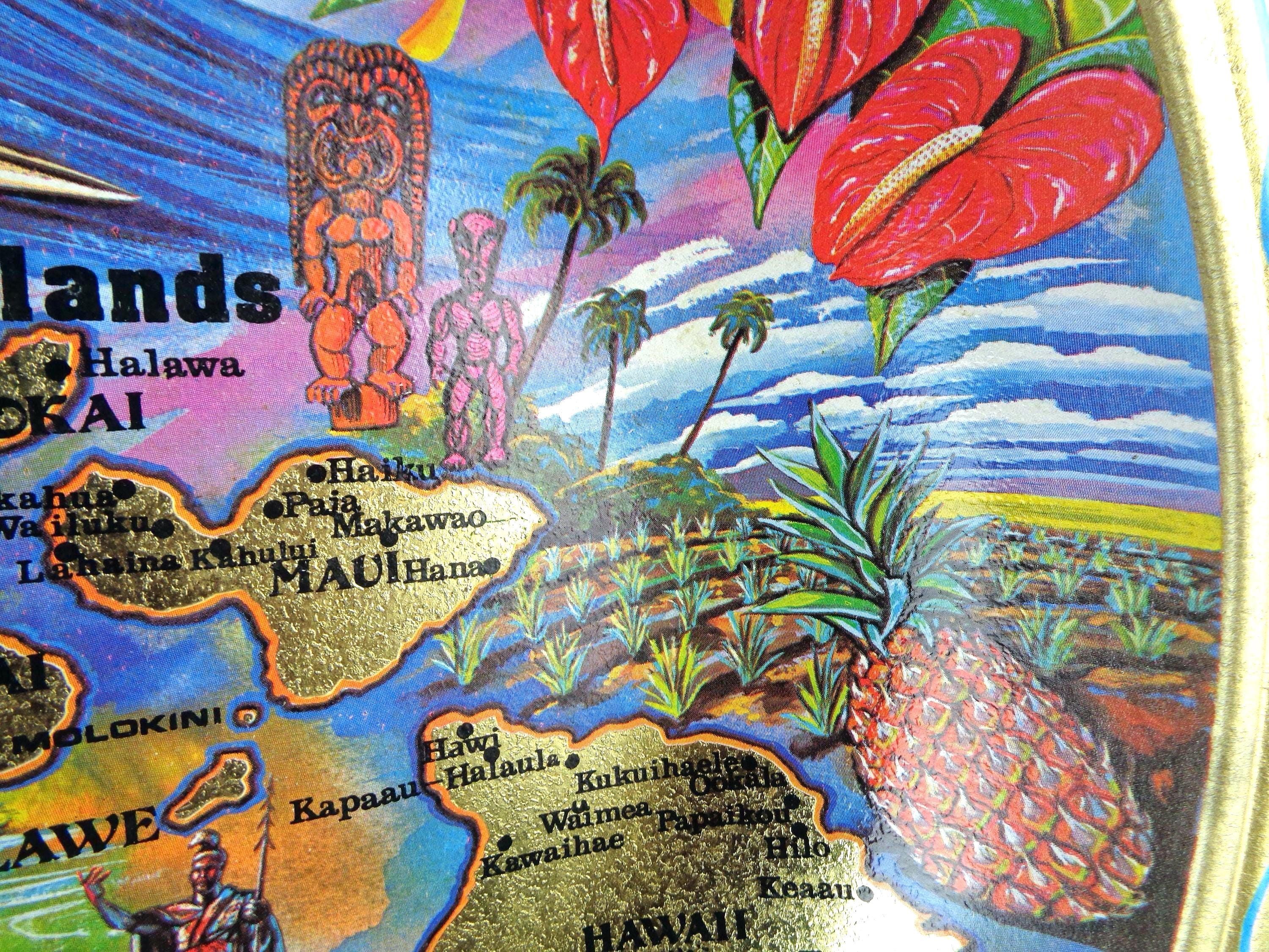 This lovely vibrant 1960s 70s retro bicentennial souvenir bowl. Features a painted enamel pictorial illustration map of the Hawaiian Islands, the capital and all major cities, state flower the hibiscus tropical flowers, goose bird, with with orchids and various Hawaiian culture! Great collectible piece!
