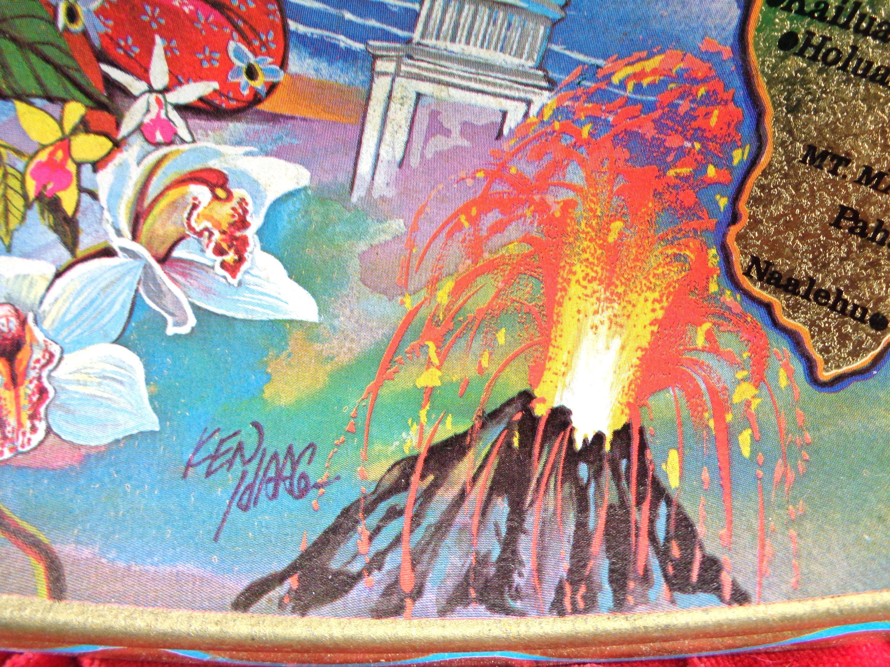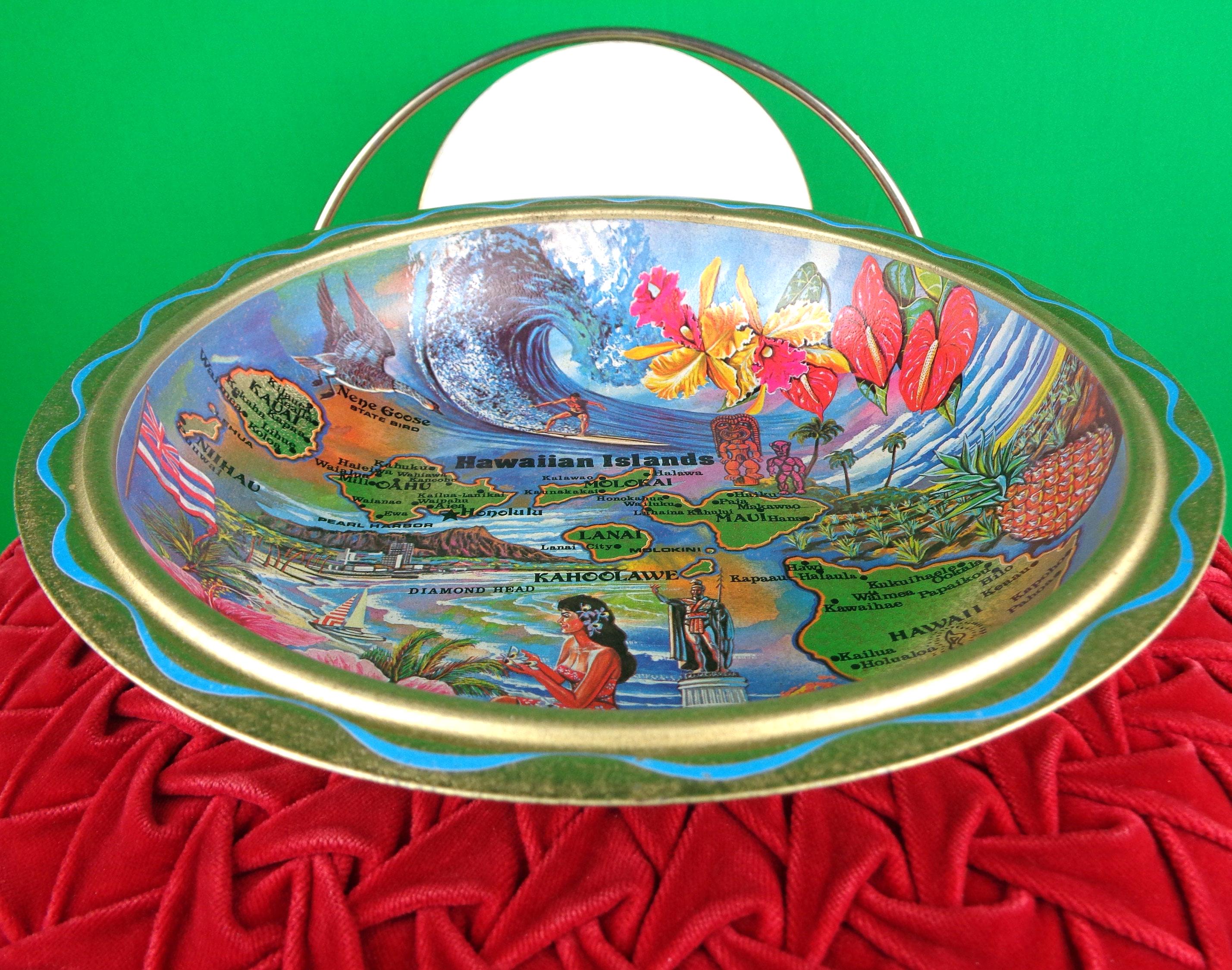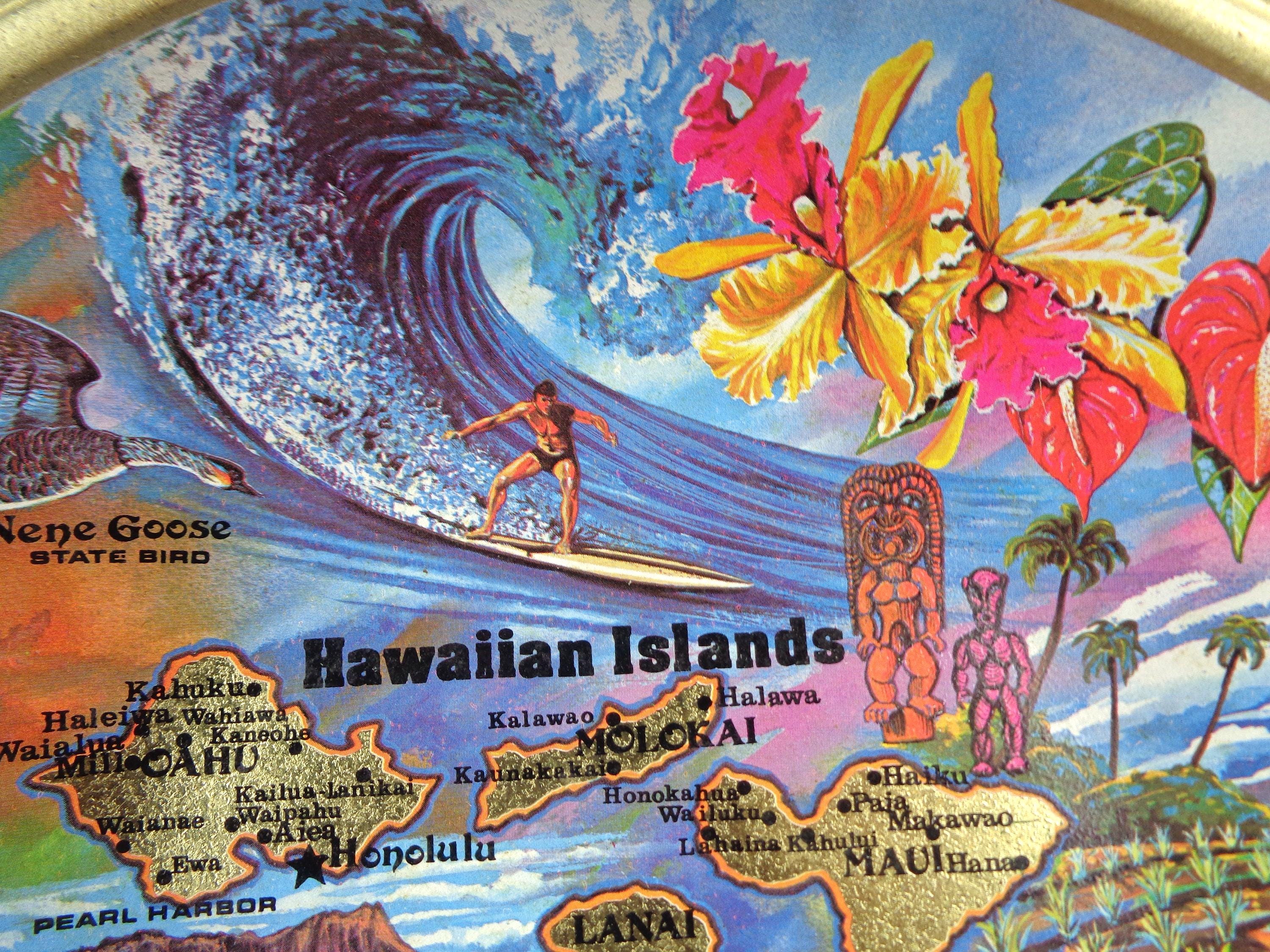 This lovely vibrant 1960s 70s retro bicentennial souvenir bowl. Features a painted enamel pictorial illustration map of the Hawaiian Islands, the capital and all major cities, state flower the hibiscus tropical flowers, goose bird, with with orchids and various Hawaiian culture! Great collectible piece!