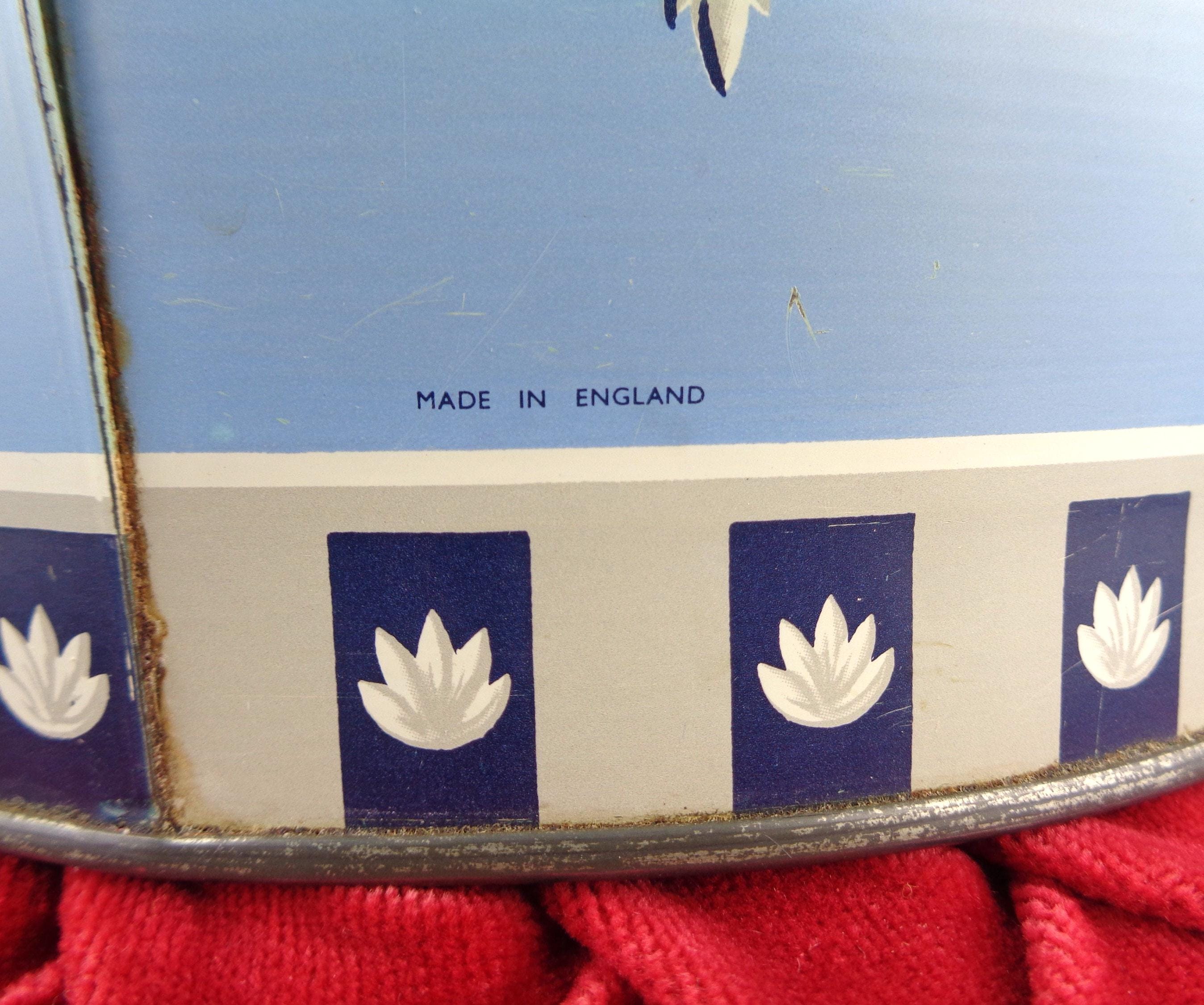 This lovely unique 1940s 50s tin, storage container. Features a top lid with a women and 2 birds embossed, pressed on the front a wheat pattern on top and sides, with a vegetation pattern along the top and bottom edges! Great piece!