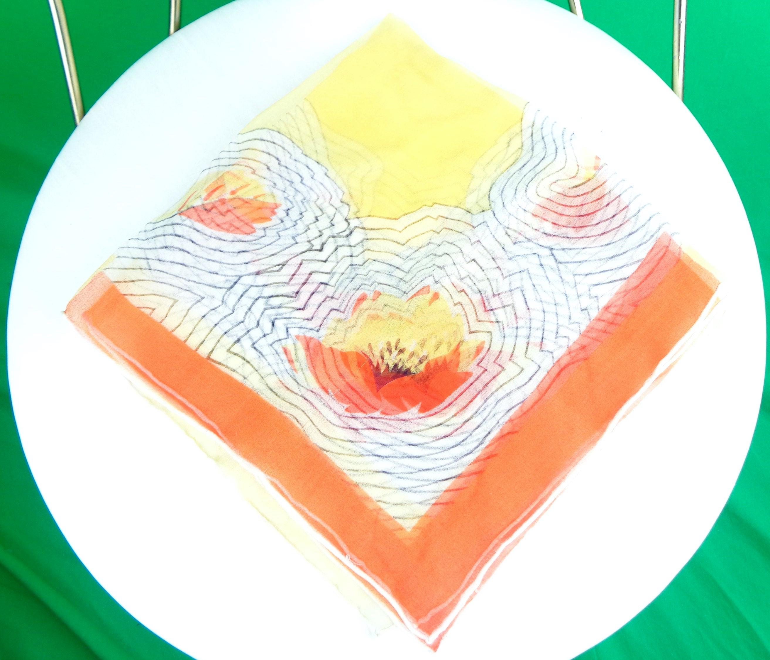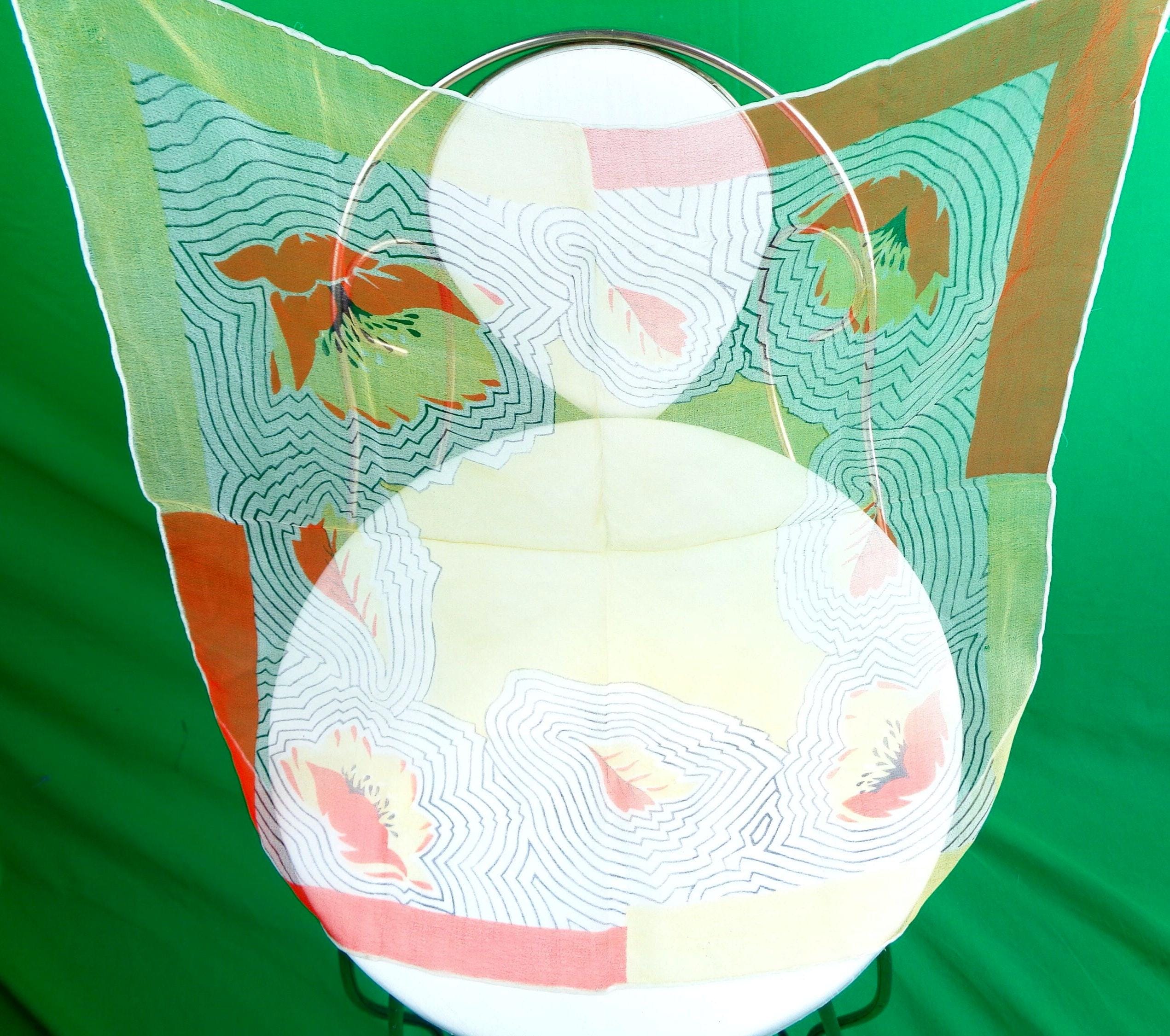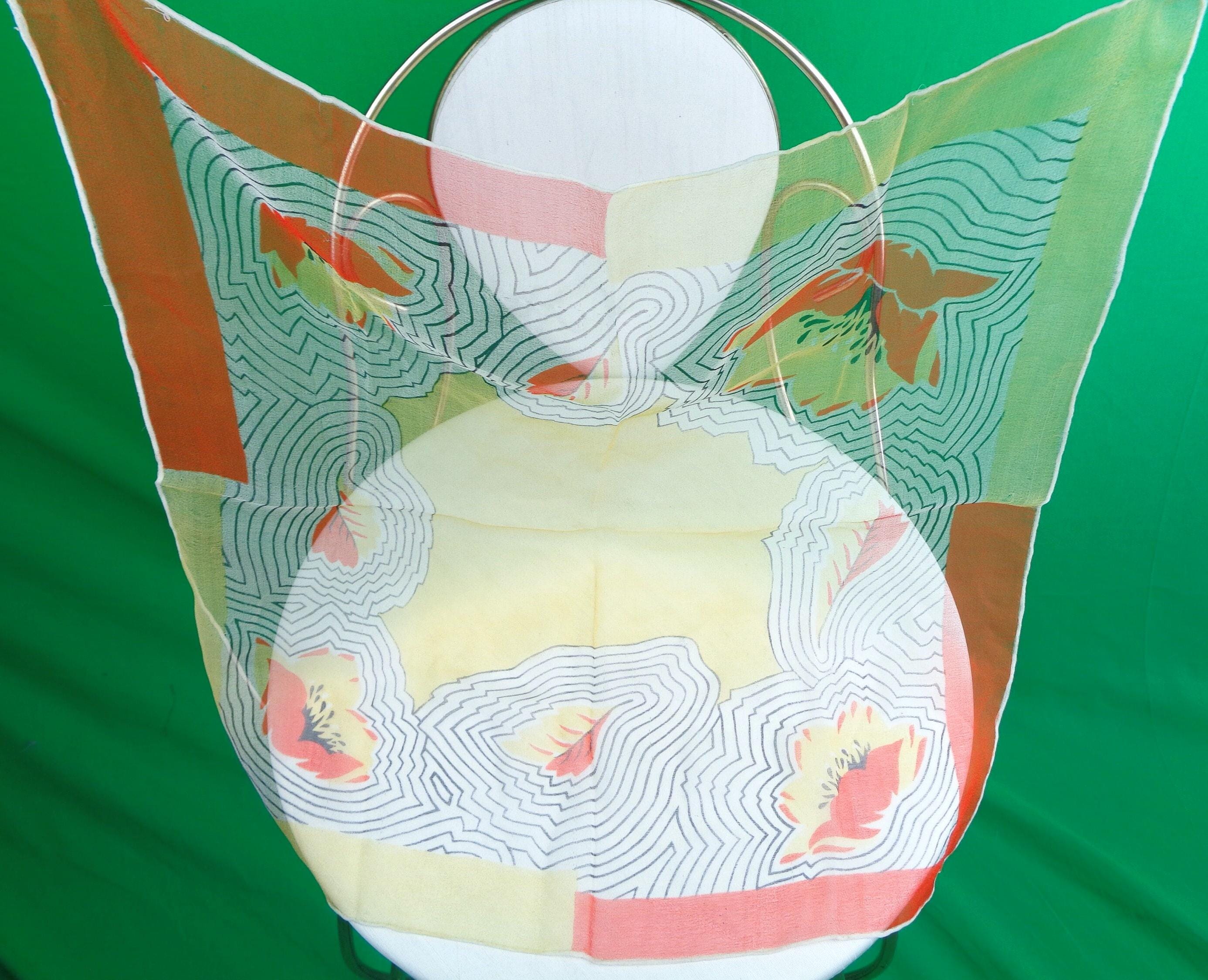 This lovely elegant 1920s 30s scarf, tie wrap. Features hand rolled edged boarder with an abstract floral pattern, design, with soft fabric, material throughout! Great compliment piece!