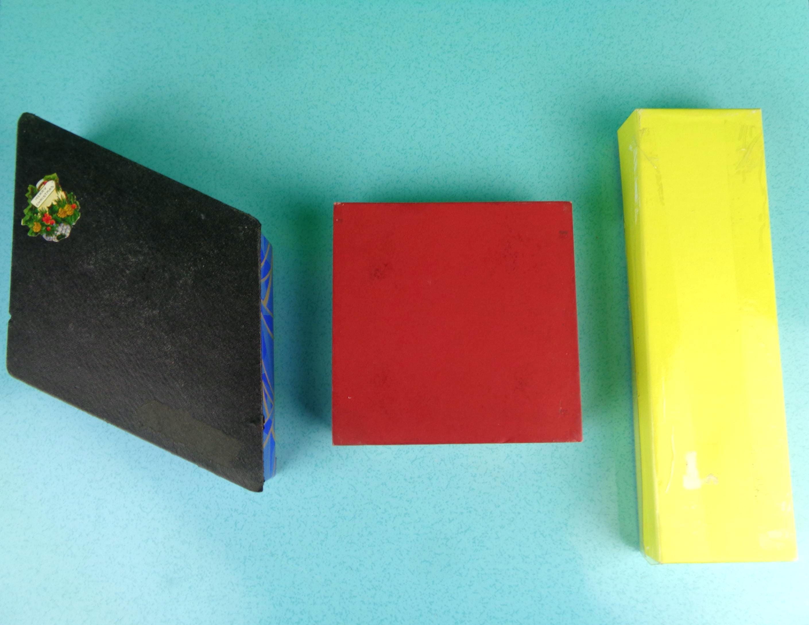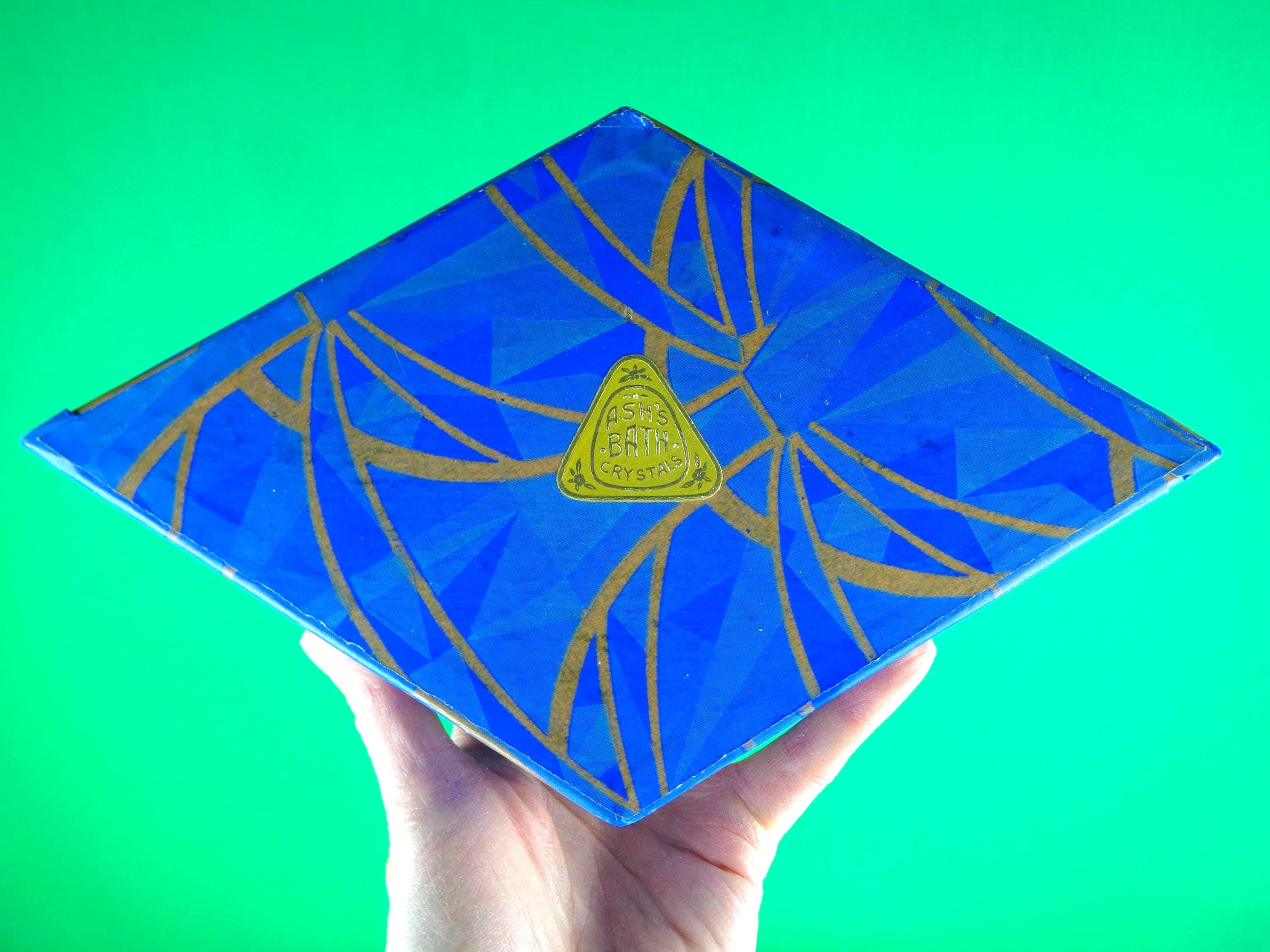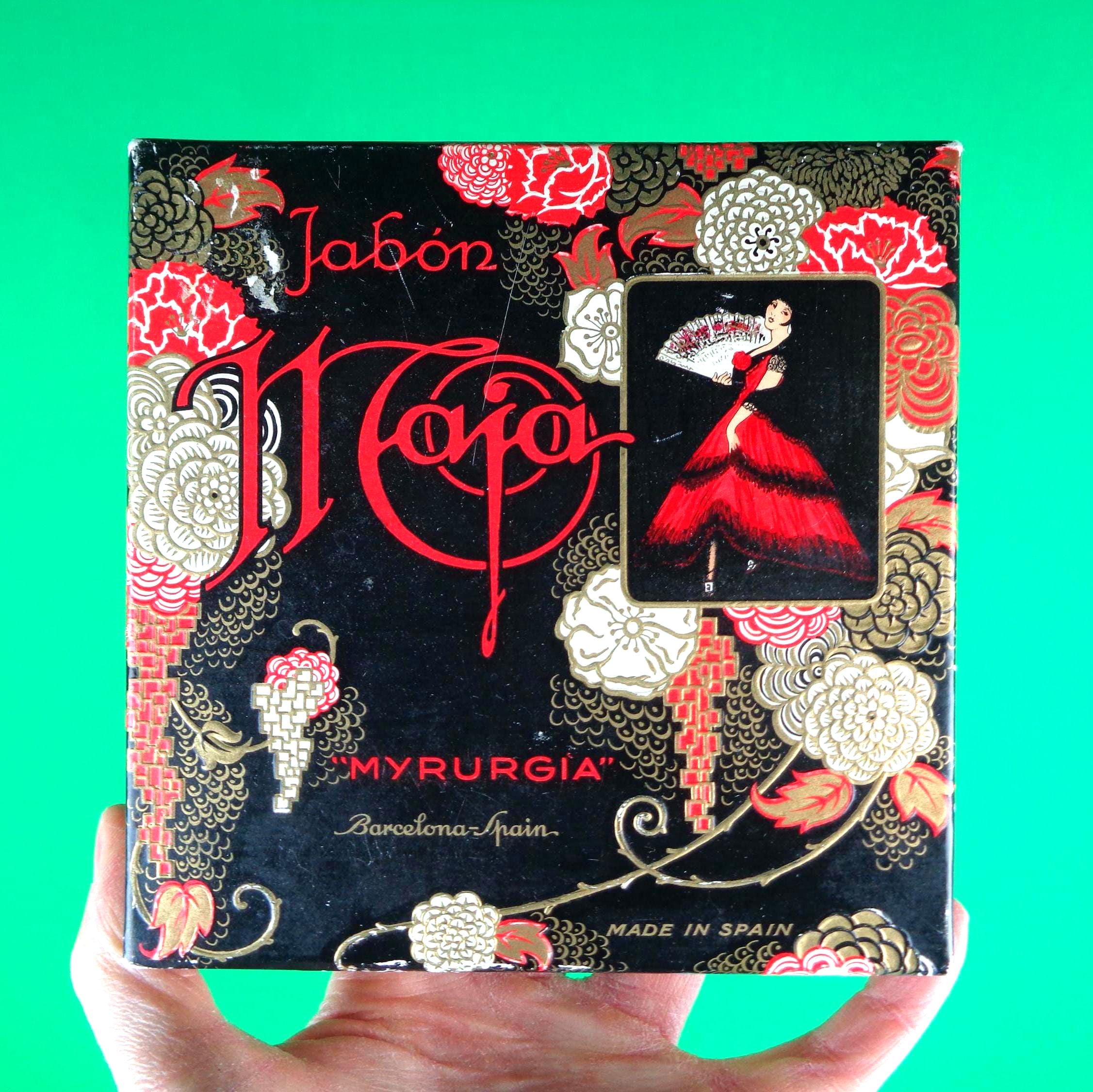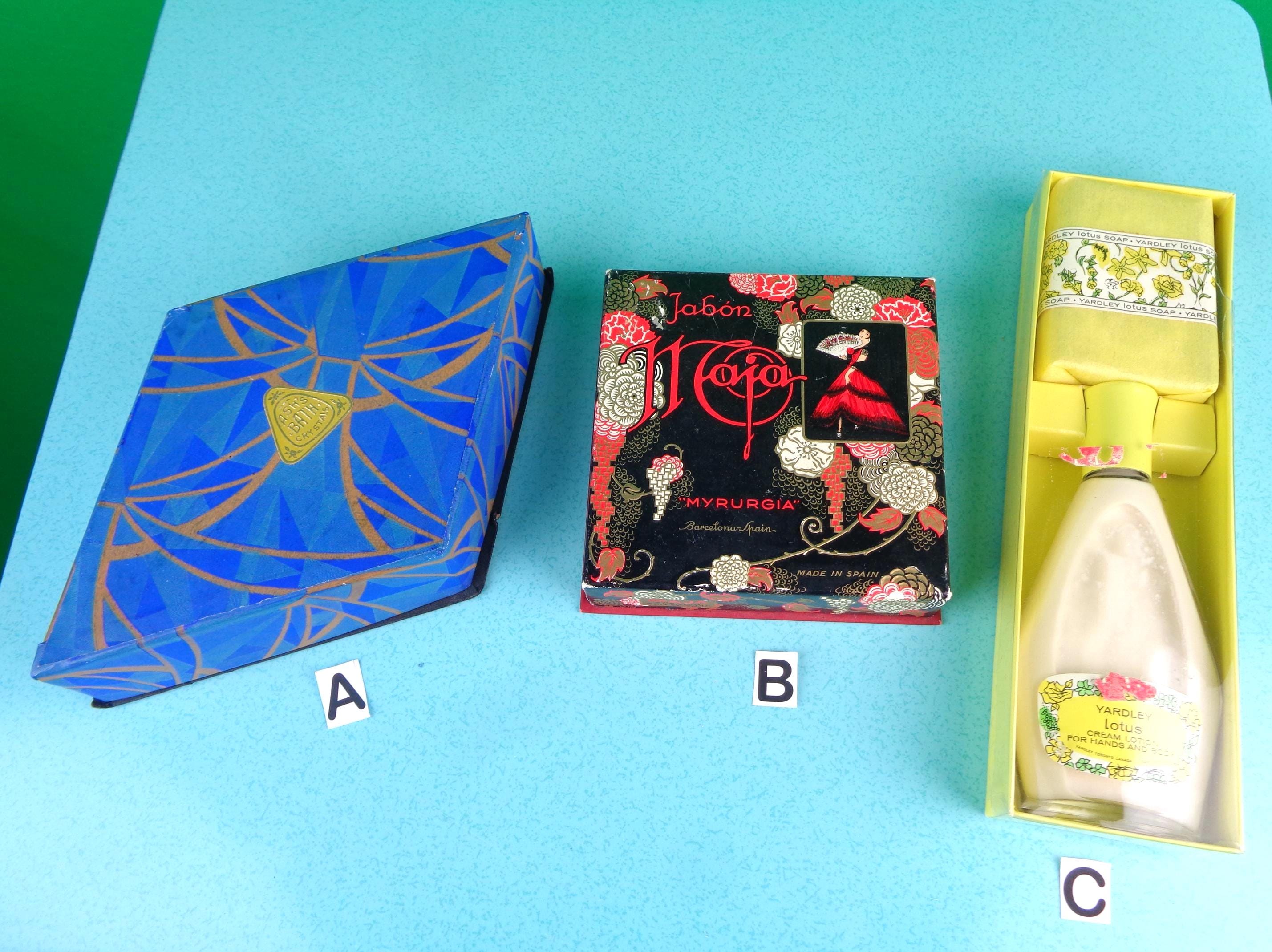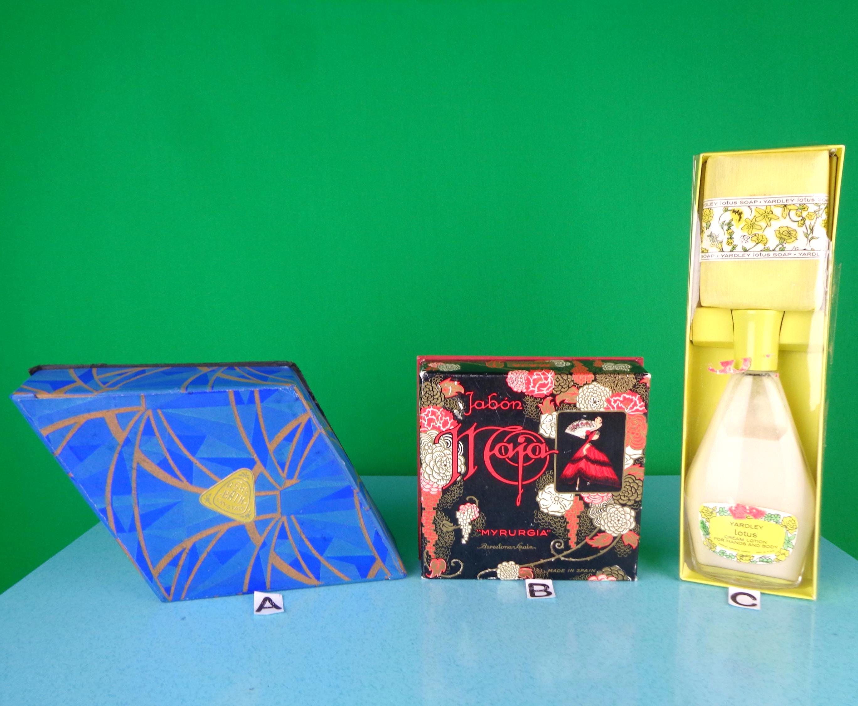 This lovely vibrant unique 1920-1960s 20s-30s bath salts, retro hand body soap, cream, lotion. Features 3 different of a variety of crafted bottle and wrapped paper with the original factory box! Greta pieces!