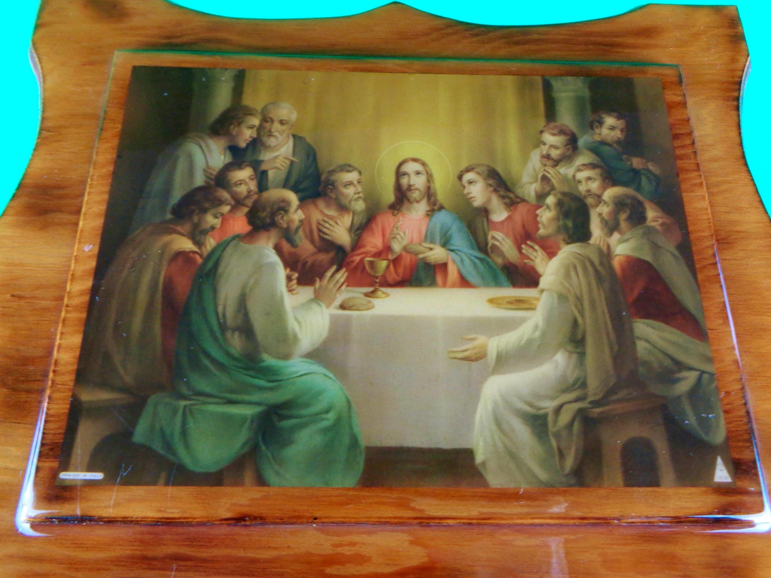 1. Last supper medium handmade wood glaze pictures features scalloped, carved edges, a color picture illustration of the last supper Jesus and 12 disciples.