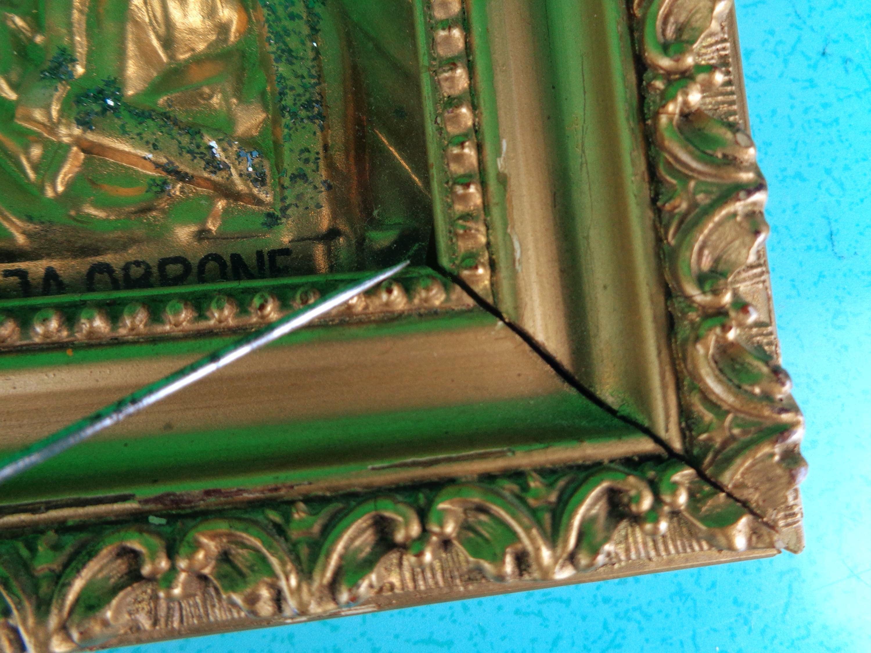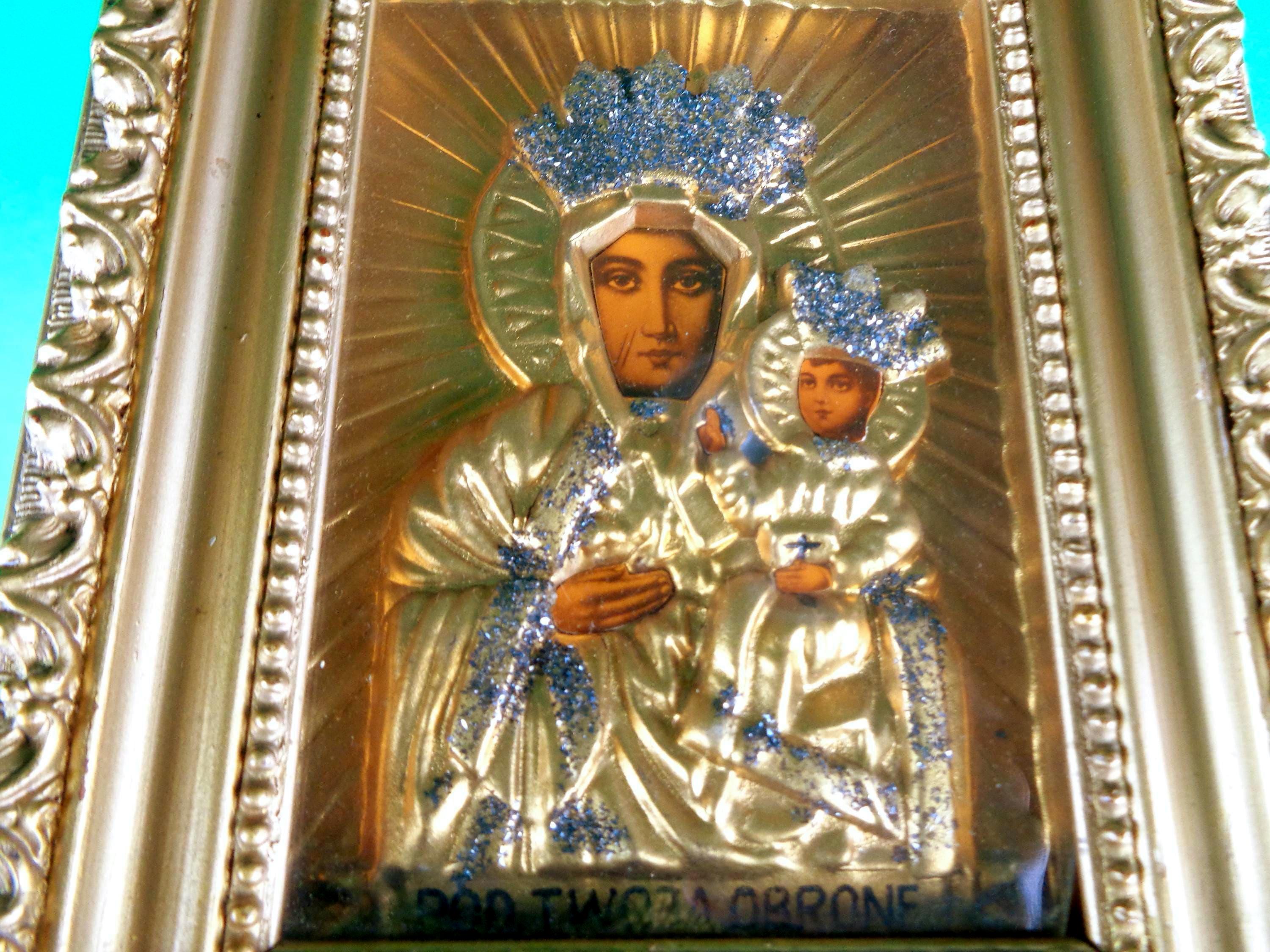 2. Small Madonna wood frame shadow box features carved decorative inlay frame, gold frame, glitter crowns, message on the back was mothers, uncle Mike brought from Poland.