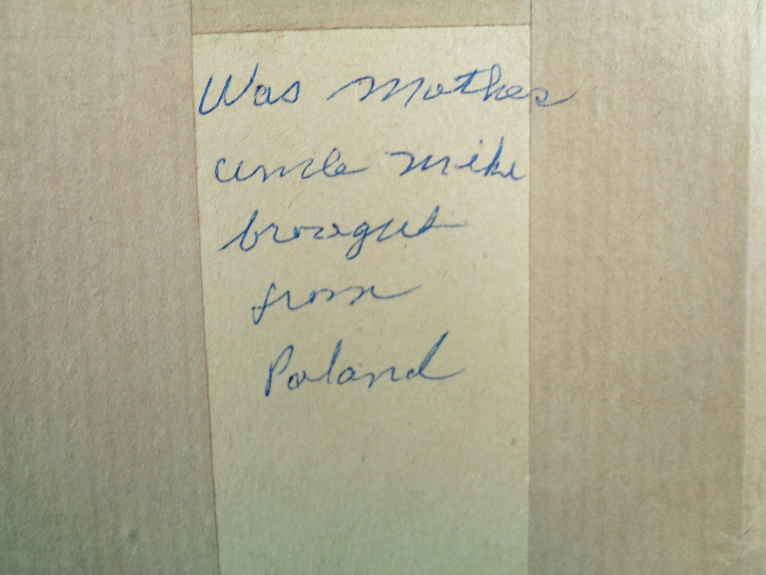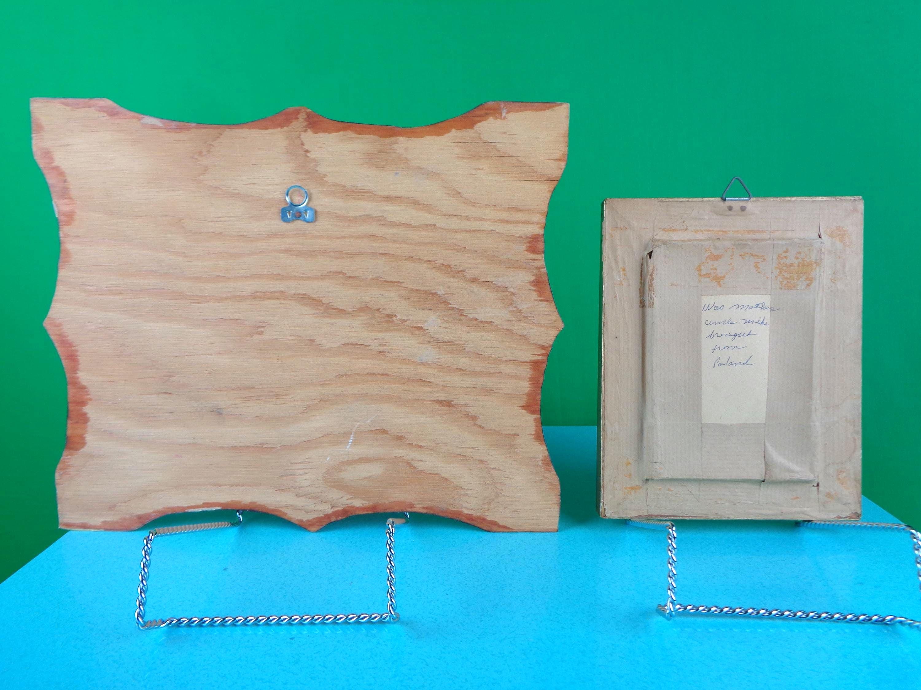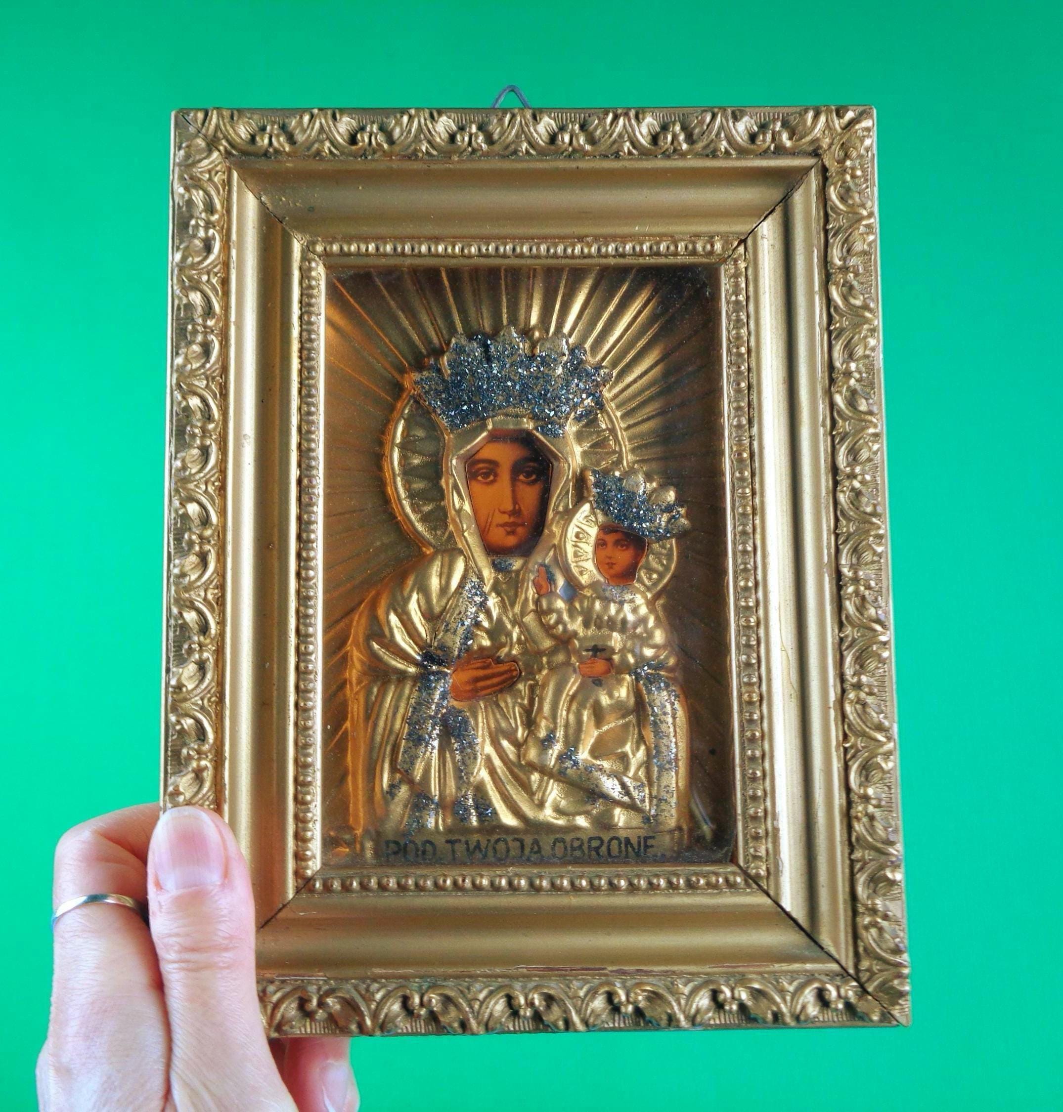 2. Small Madonna wood frame shadow box features carved decorative inlay frame, gold frame, glitter crowns, message on the back was mothers, uncle Mike brought from Poland.