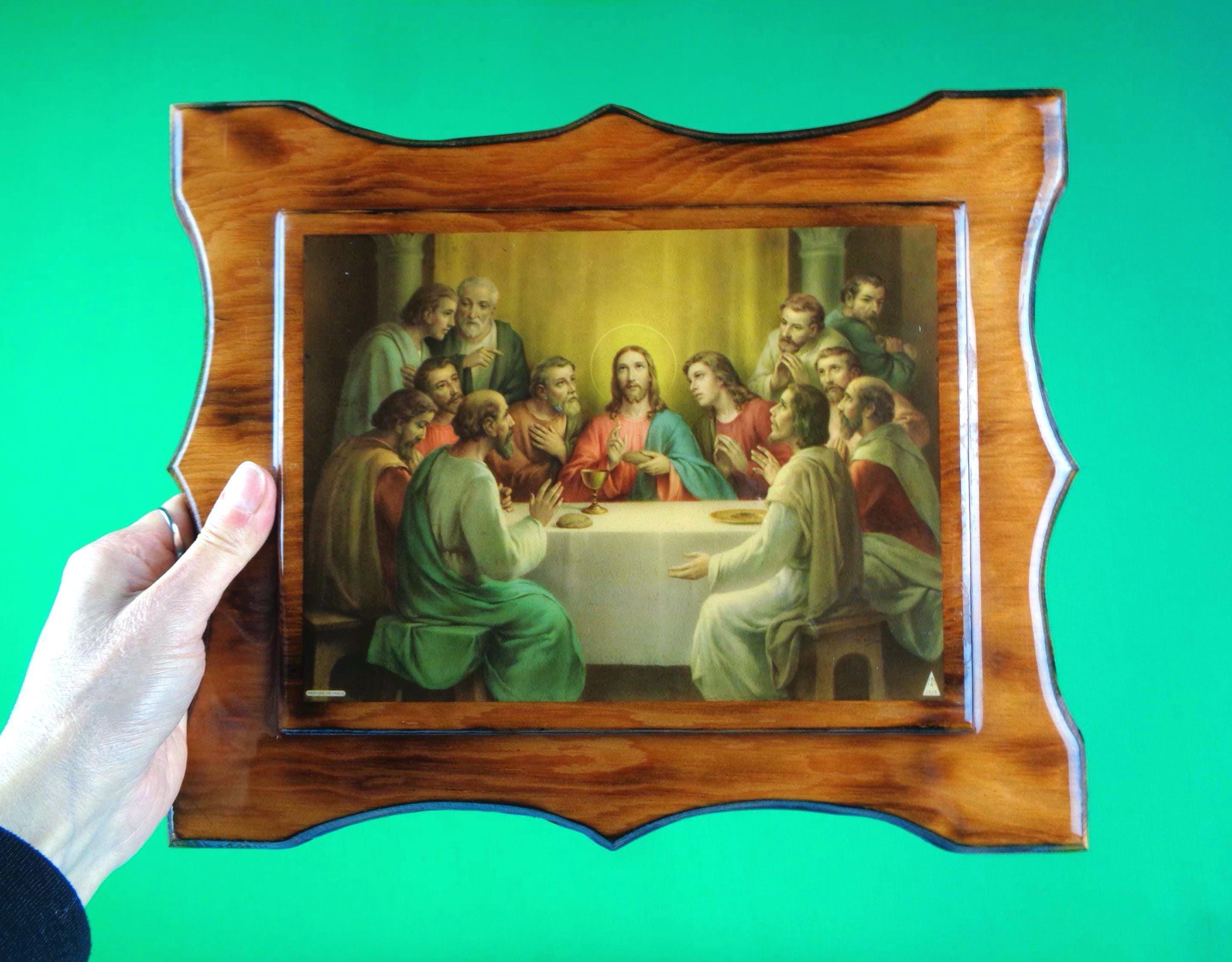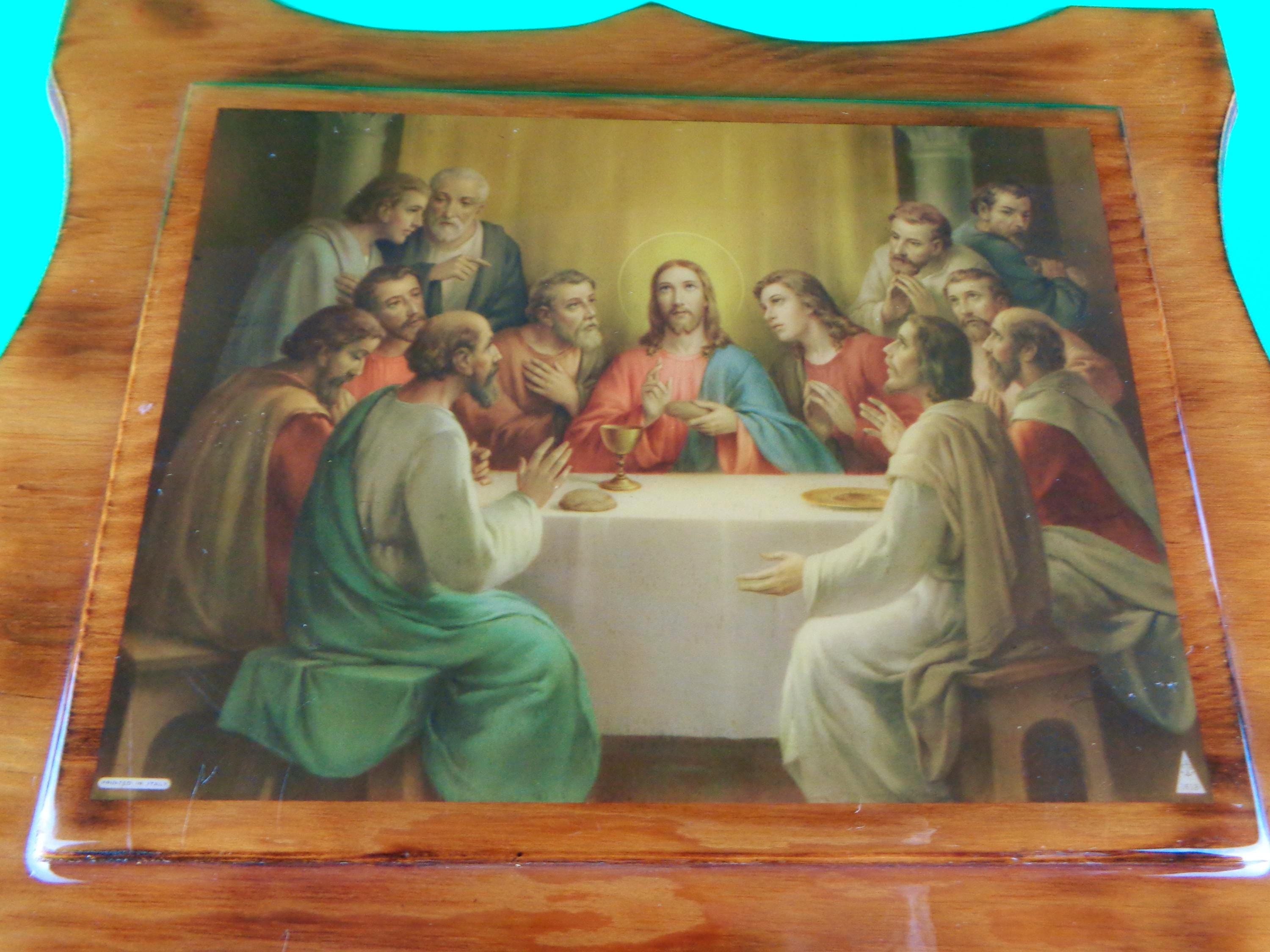 1. Last supper medium handmade wood glaze pictures features scalloped, carved edges, a color picture illustration of the last supper Jesus and 12 disciples.