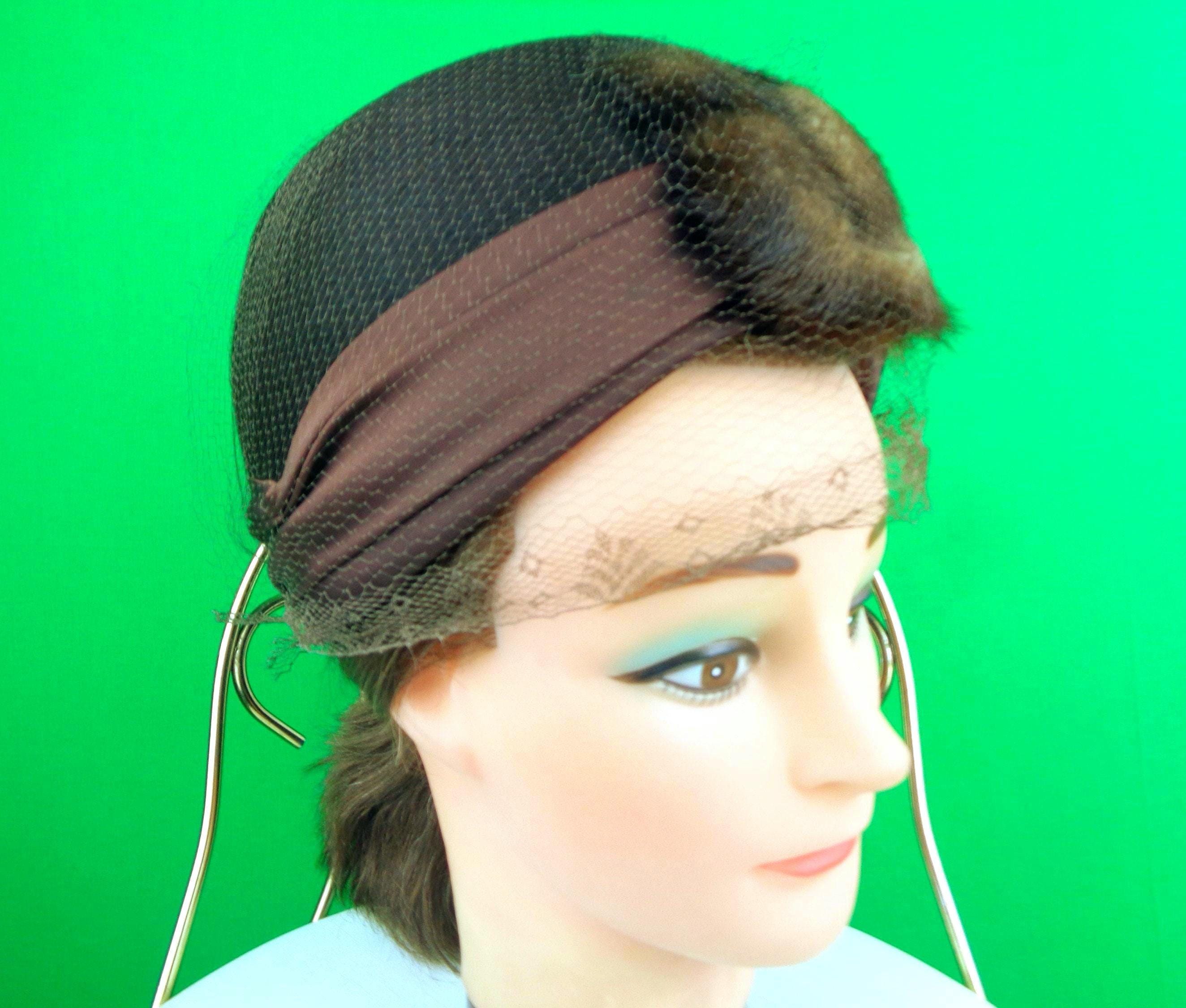 This lovely stylish 1950s 60s retro pillbox veil, fur, capulet turban cloche hat. Features a large satin band around the base edge, with a mink, fur loop on the front, a uniquely designed honeycomb decorative veil that cover the hat that come down the forehead, with soft material throughout! Great compliment piece!