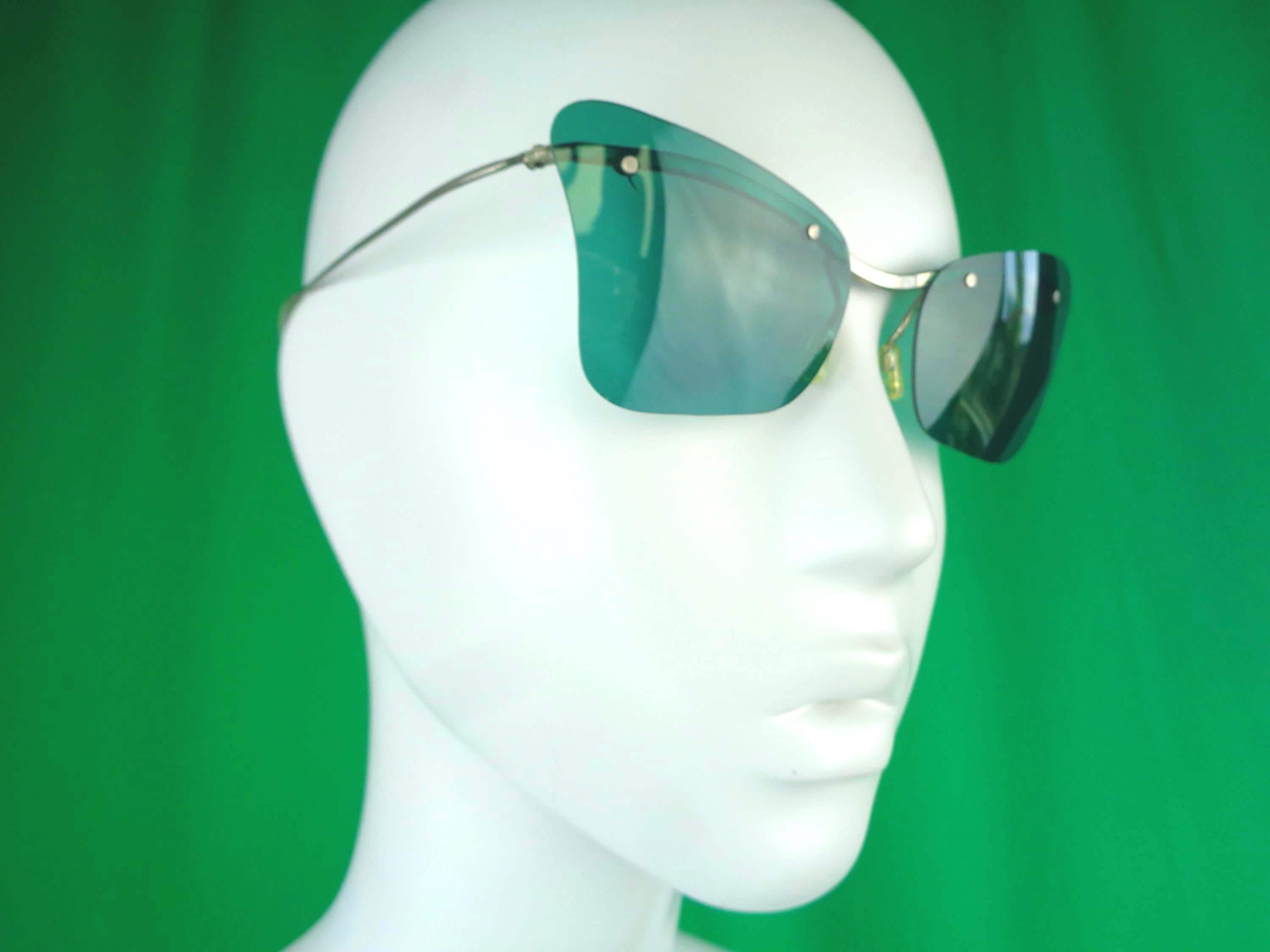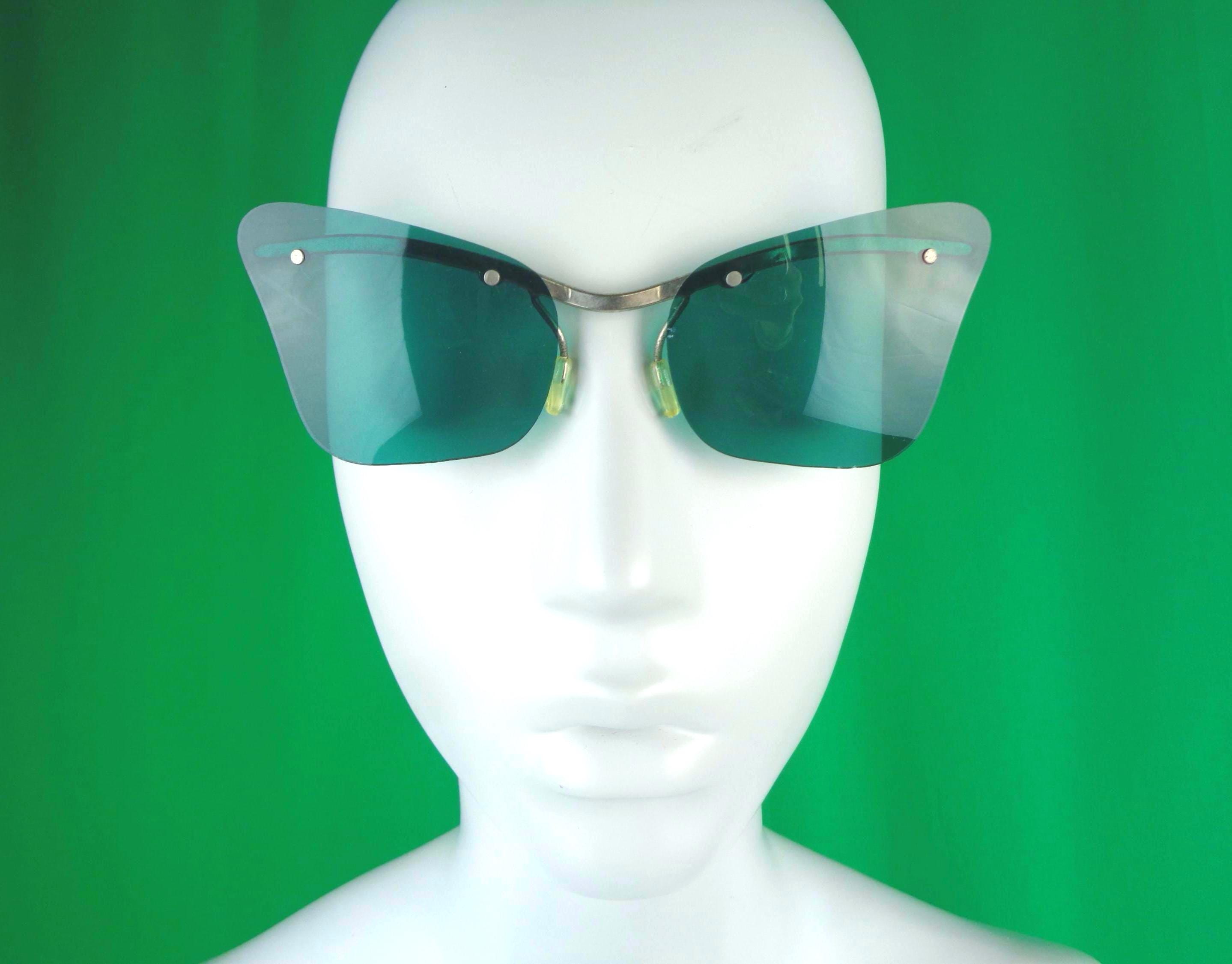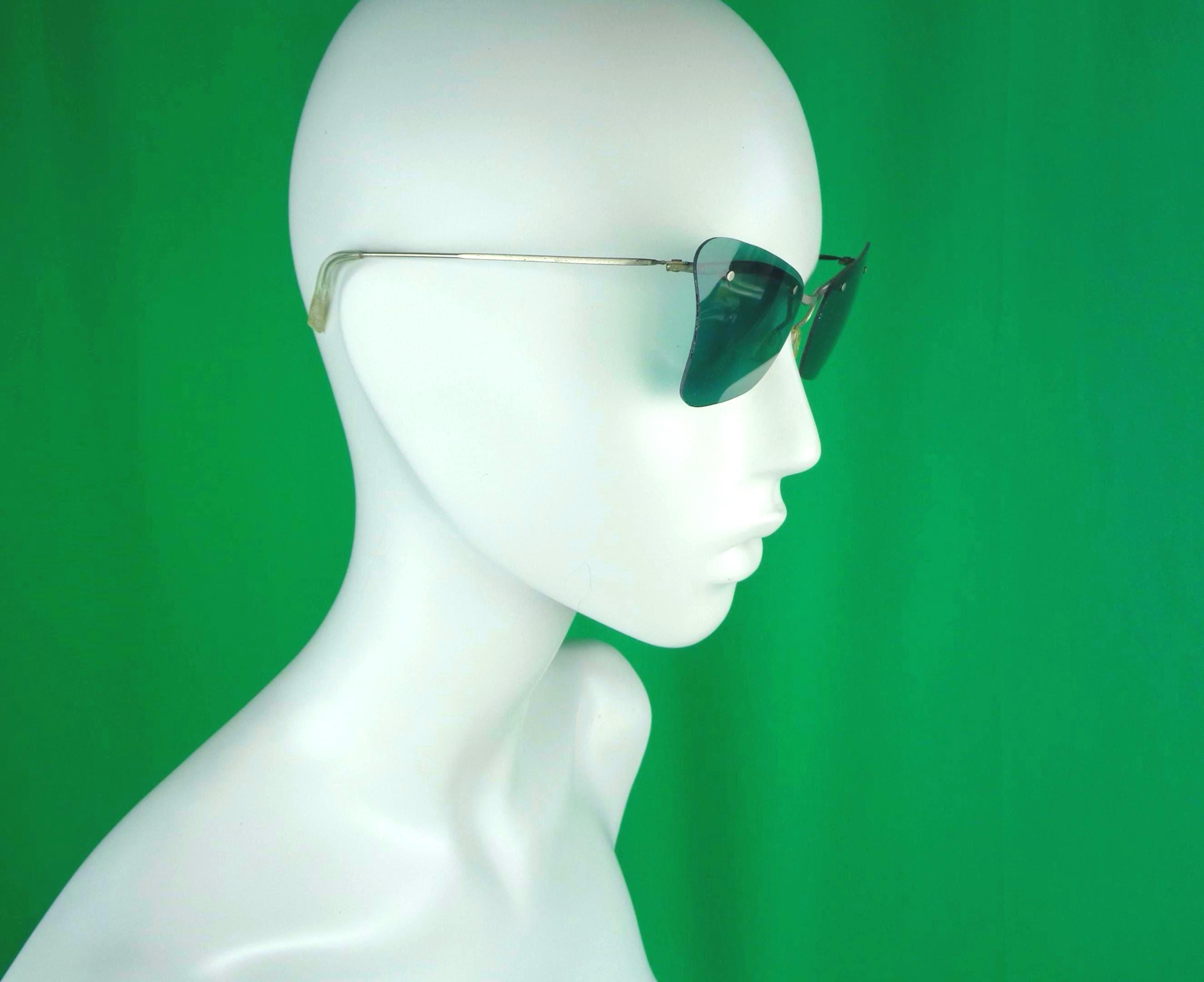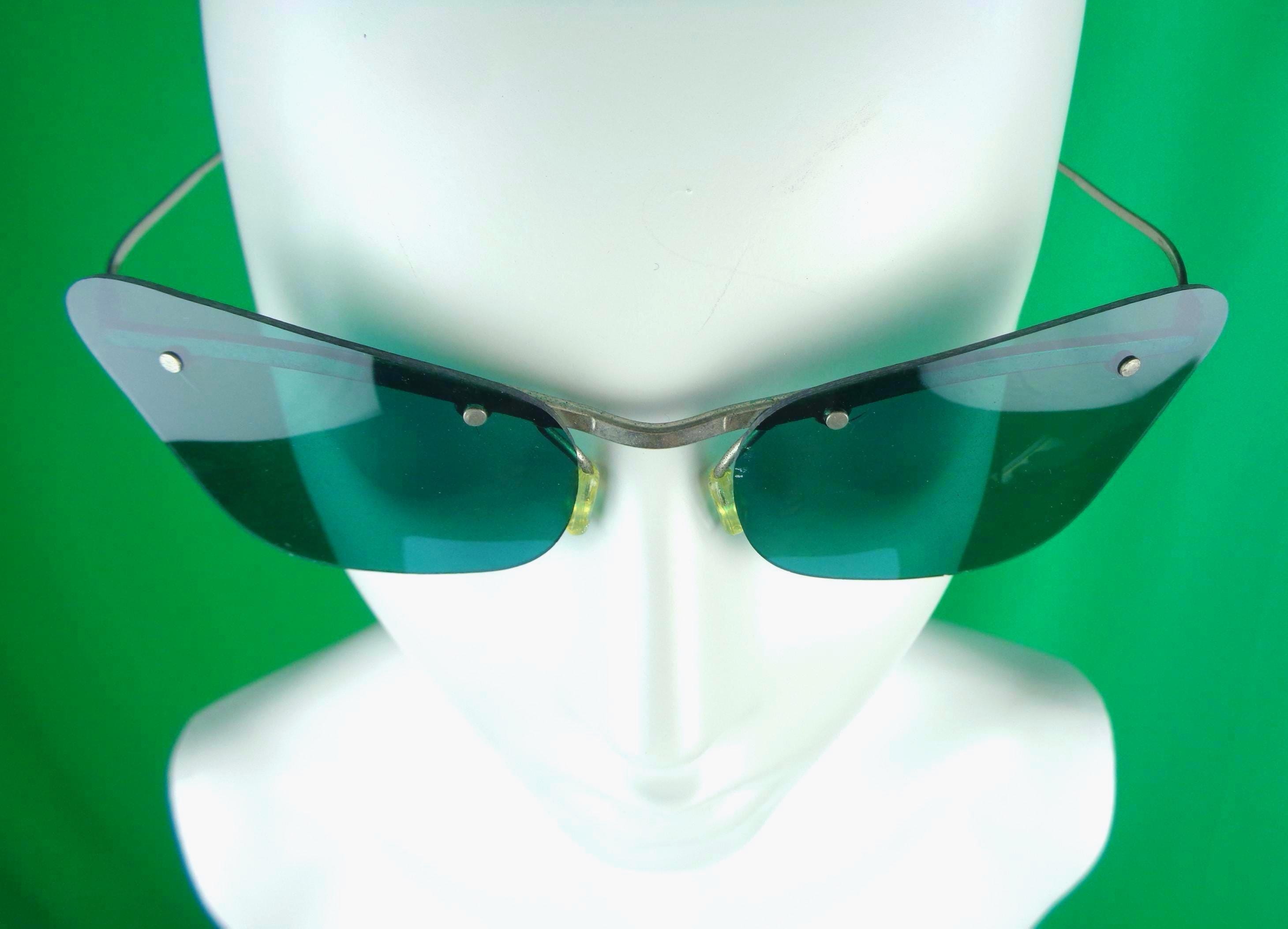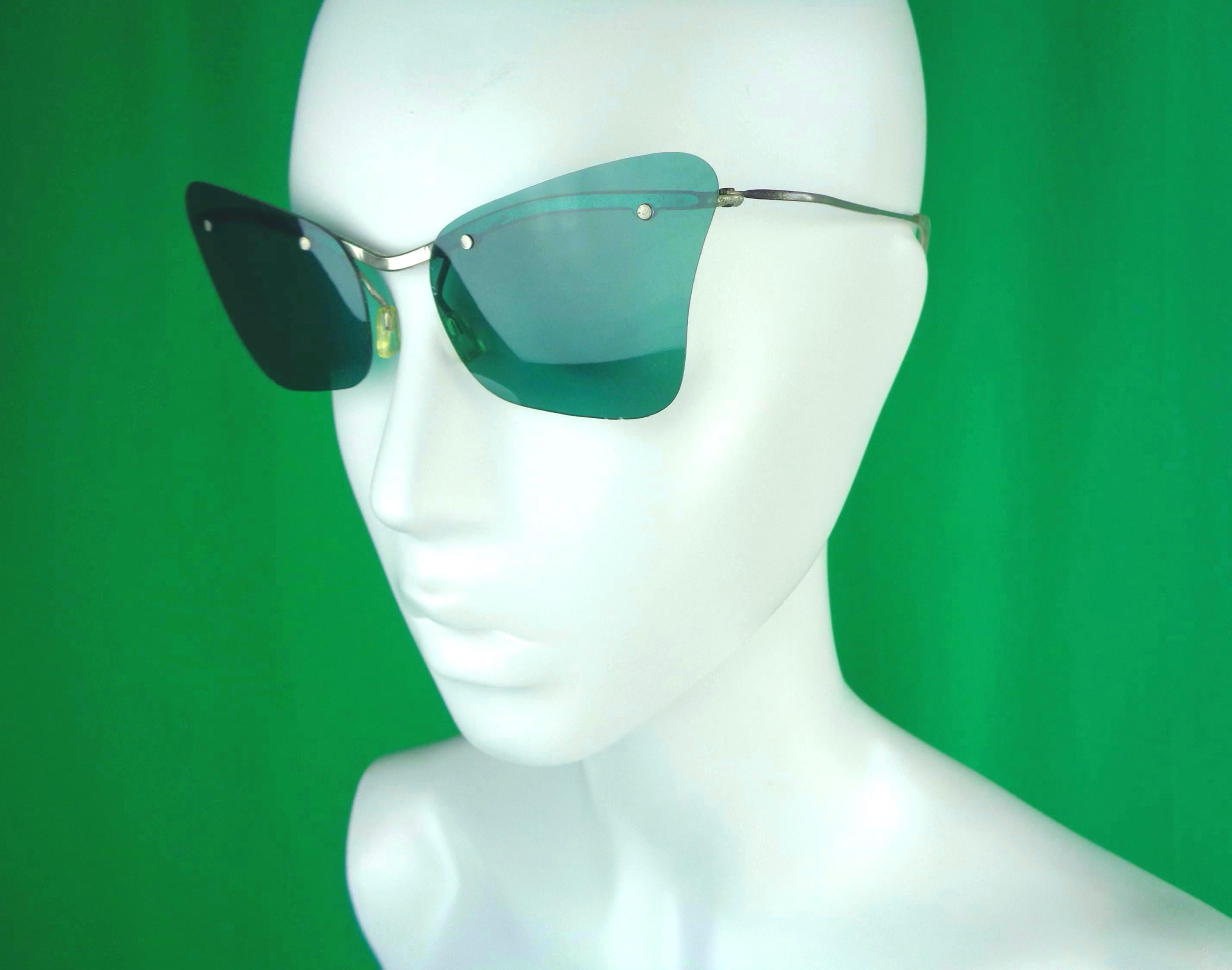 Features a curvy, shape lenses, with a deep green tinted lenses, open frame, ear pads, with nose pads, silver tone frames! Great compliment piece!