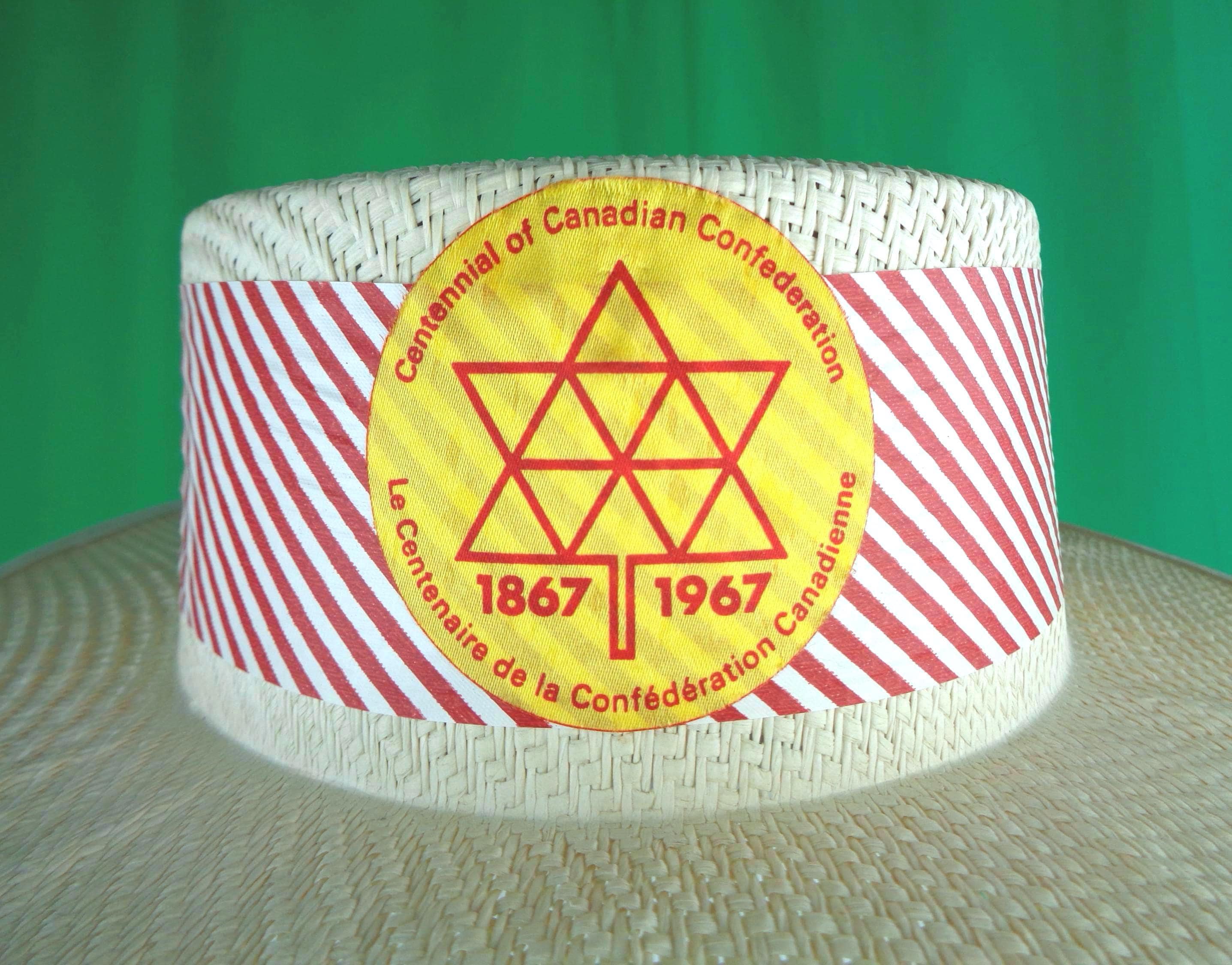 This lovely rare 1967 retro Canadian Centennial Confederation World Expo 67 souvenir woven straw skimmer boater hat.