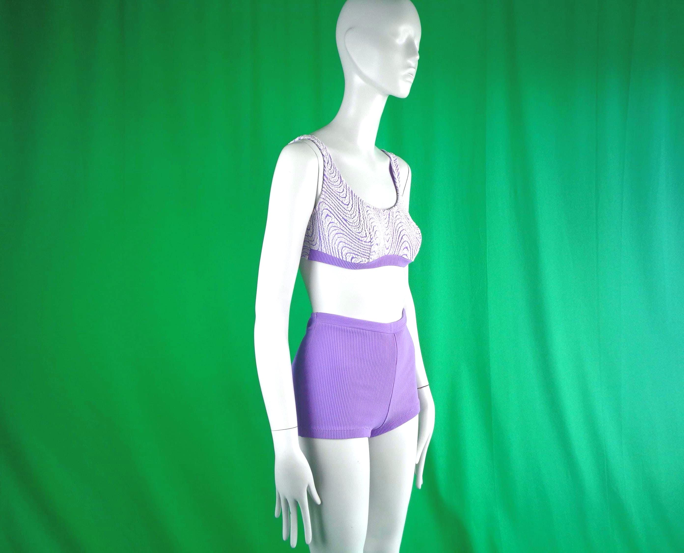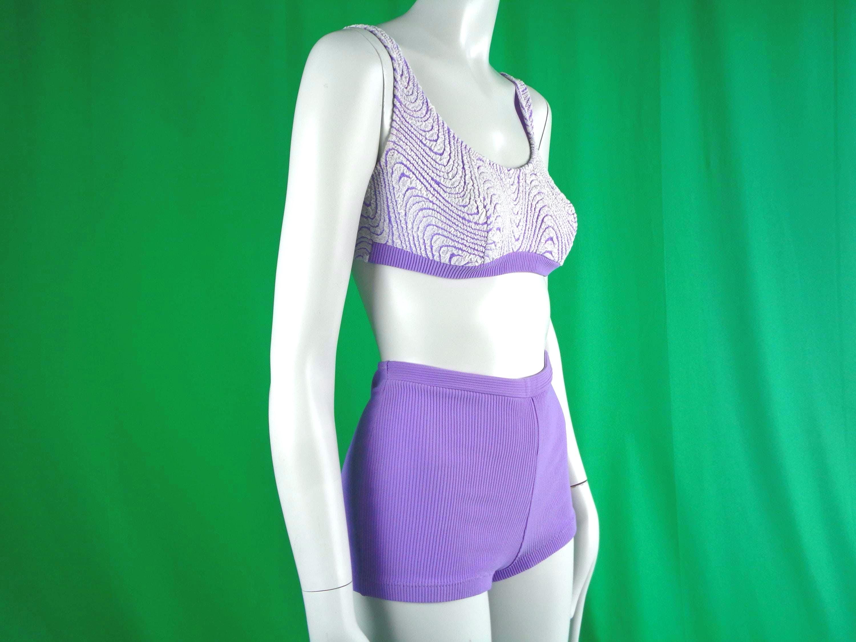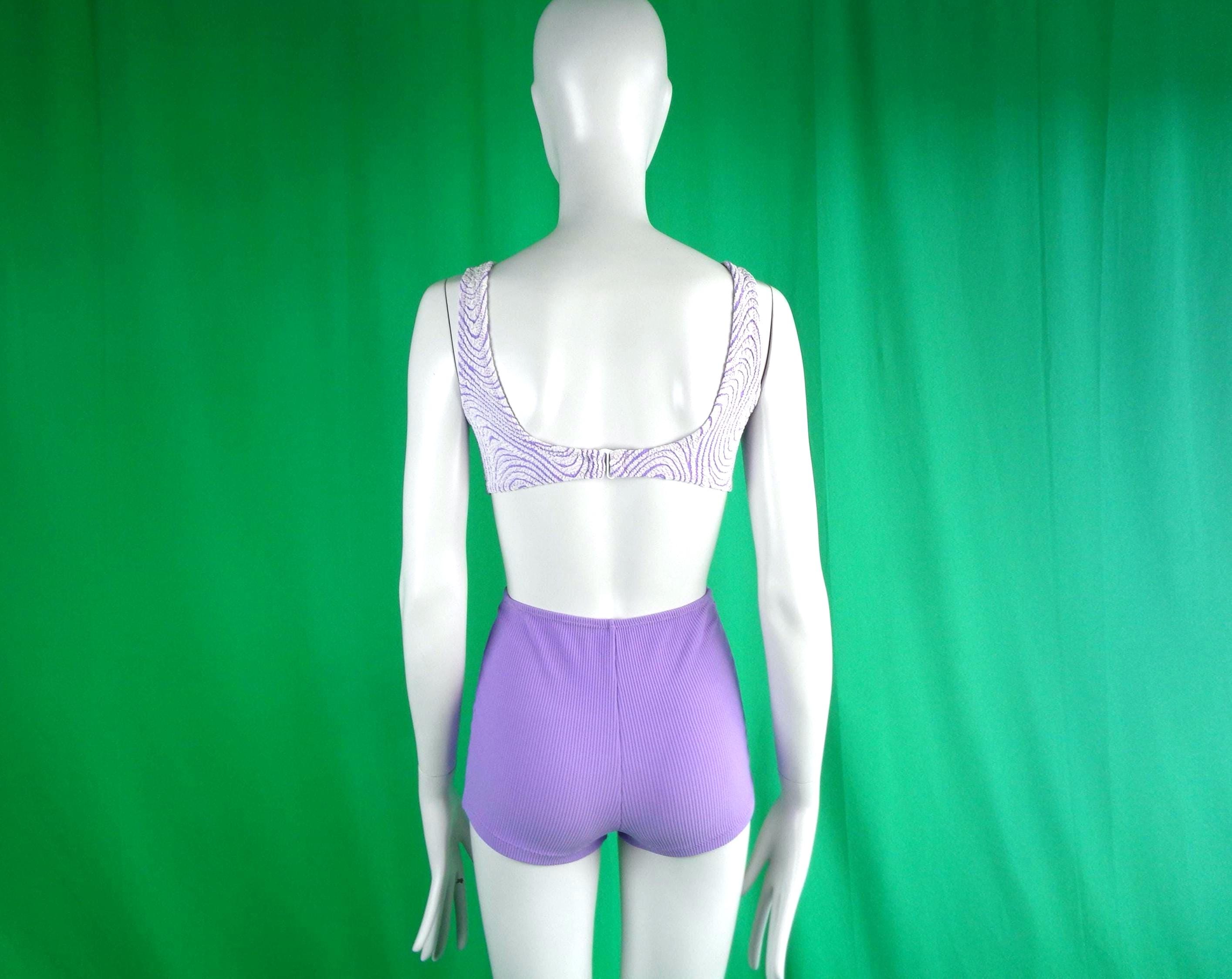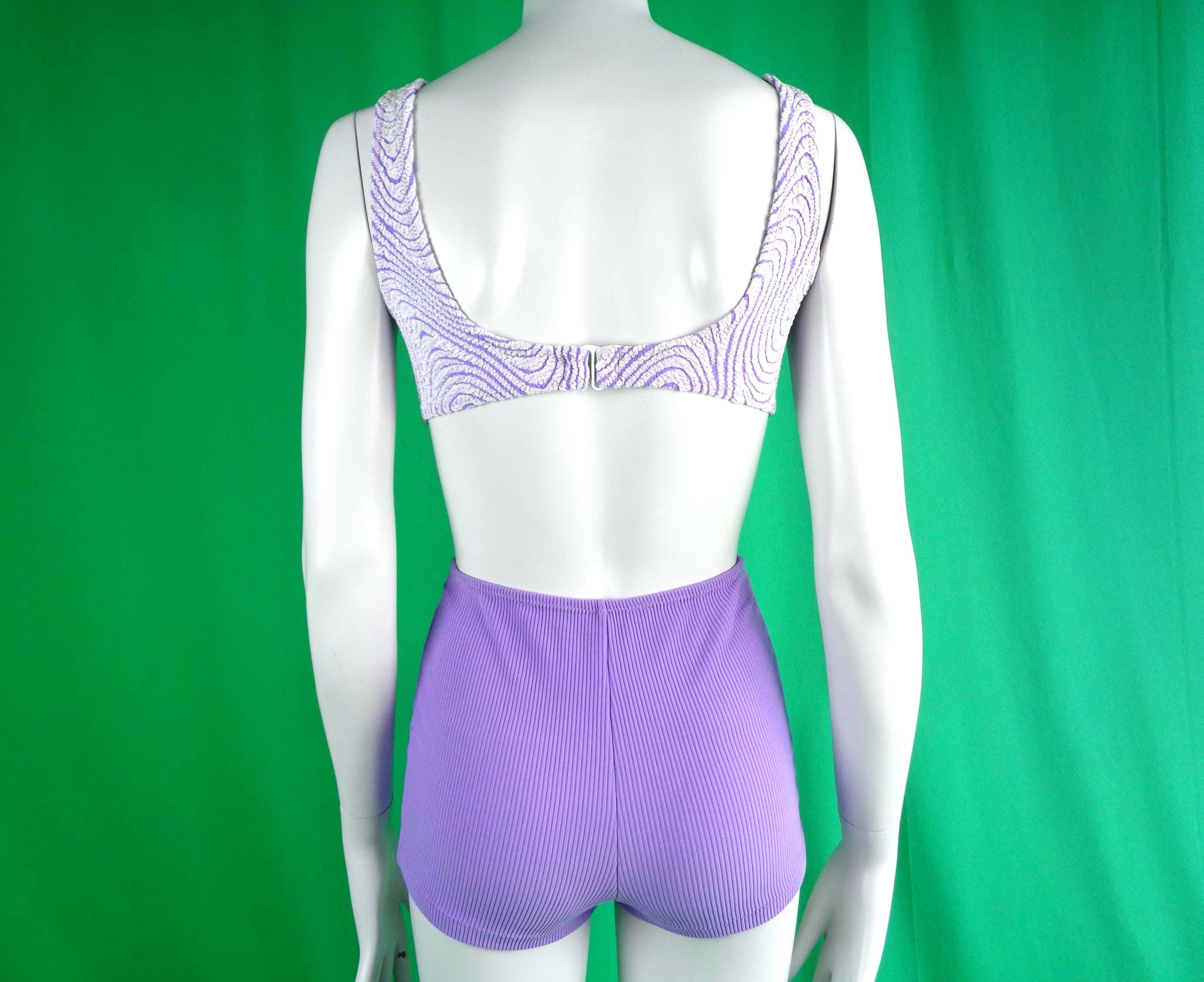 This lovely unique stylish 1960s retro Bikini, Bathing Swimsuit Wear, Bra Top, Booty Short Pants. Features a two tone pattern, design, high waist with rib bottoms, swirl design, pattern top, elastic stretch in the the top and bottoms, back hook closure, textured fabric, material throughout! Great compliment piece!