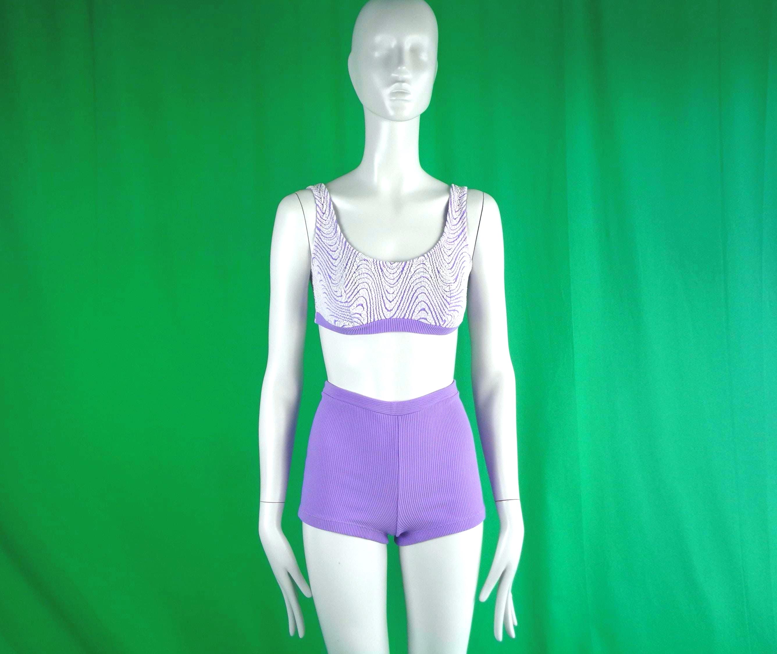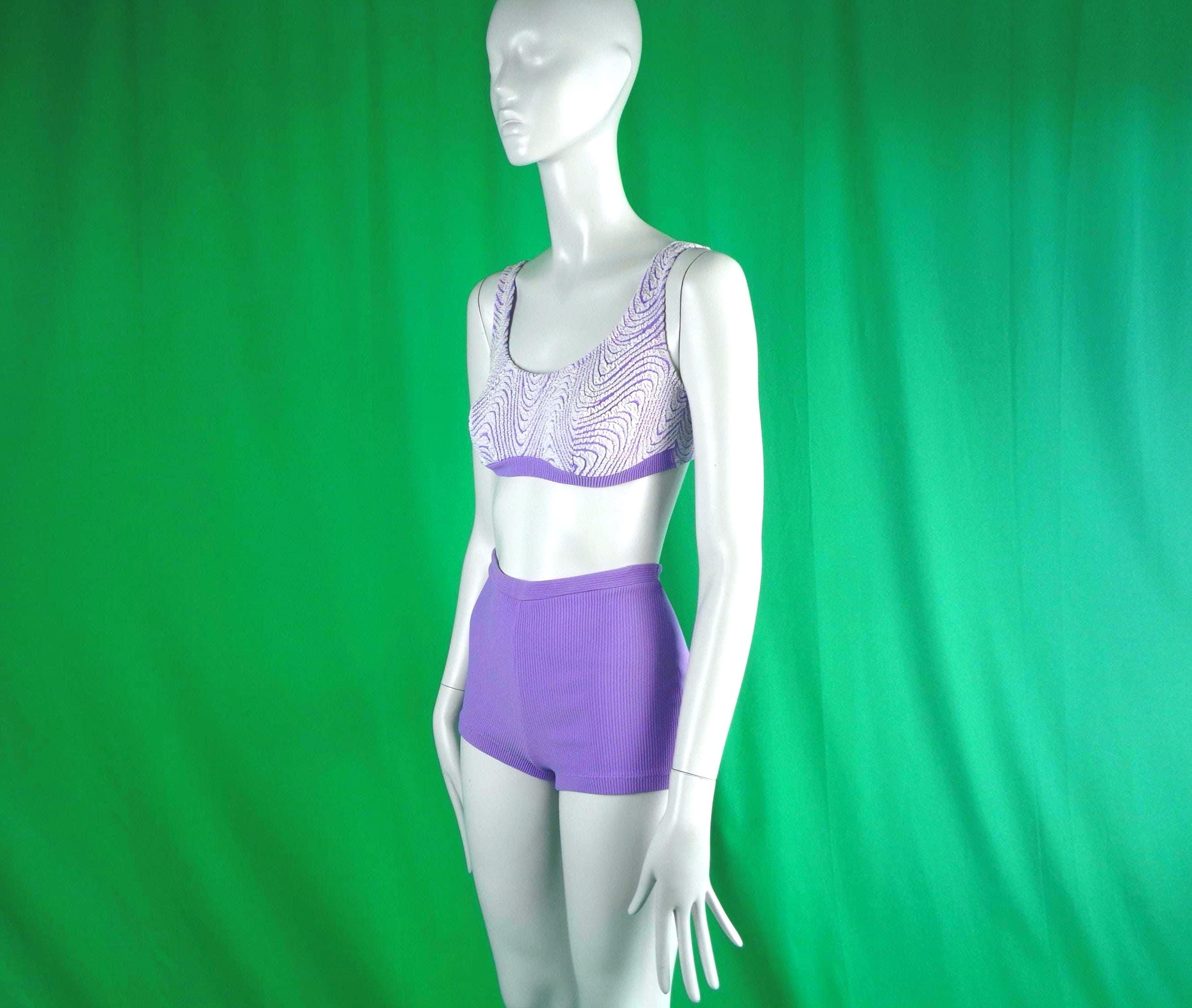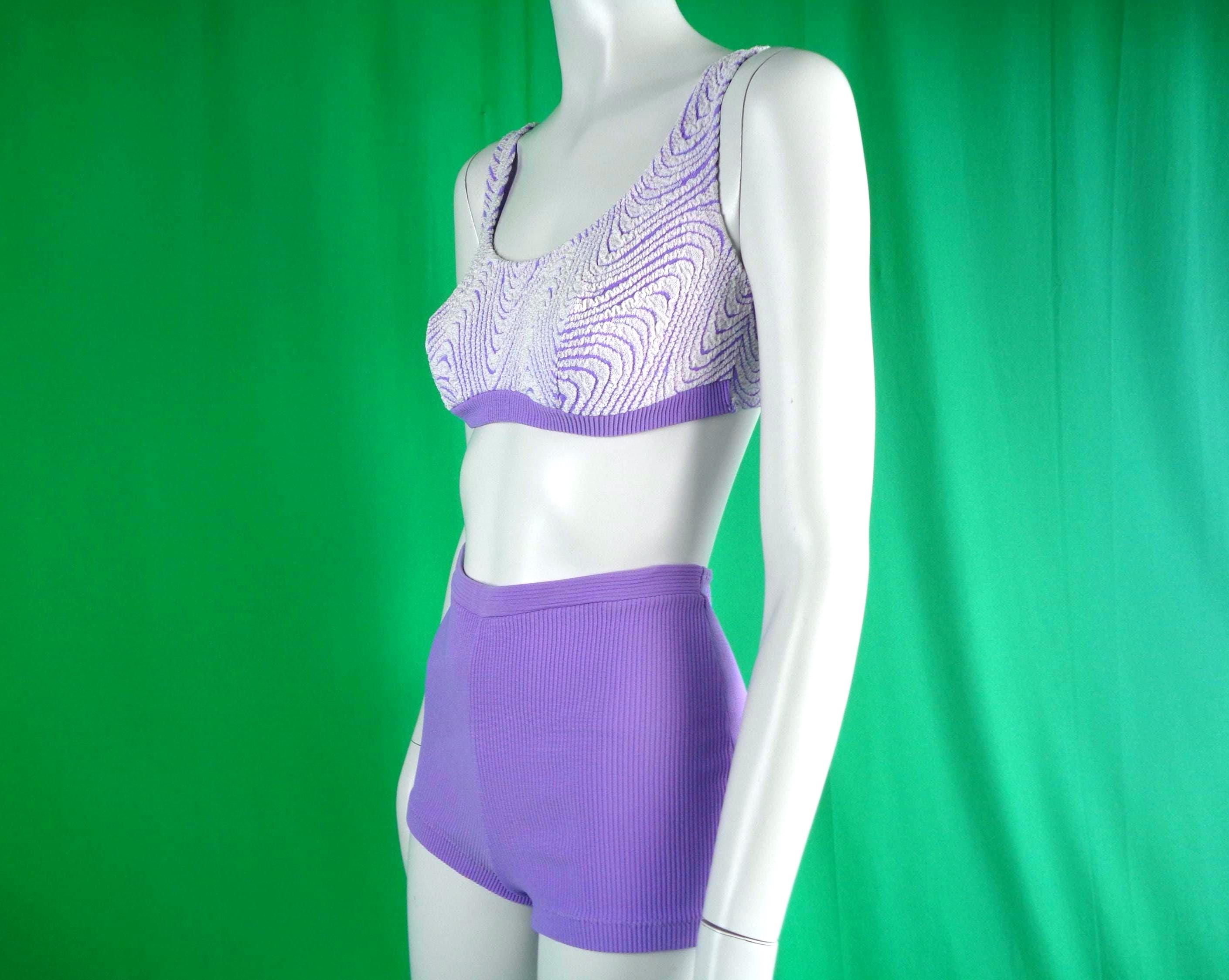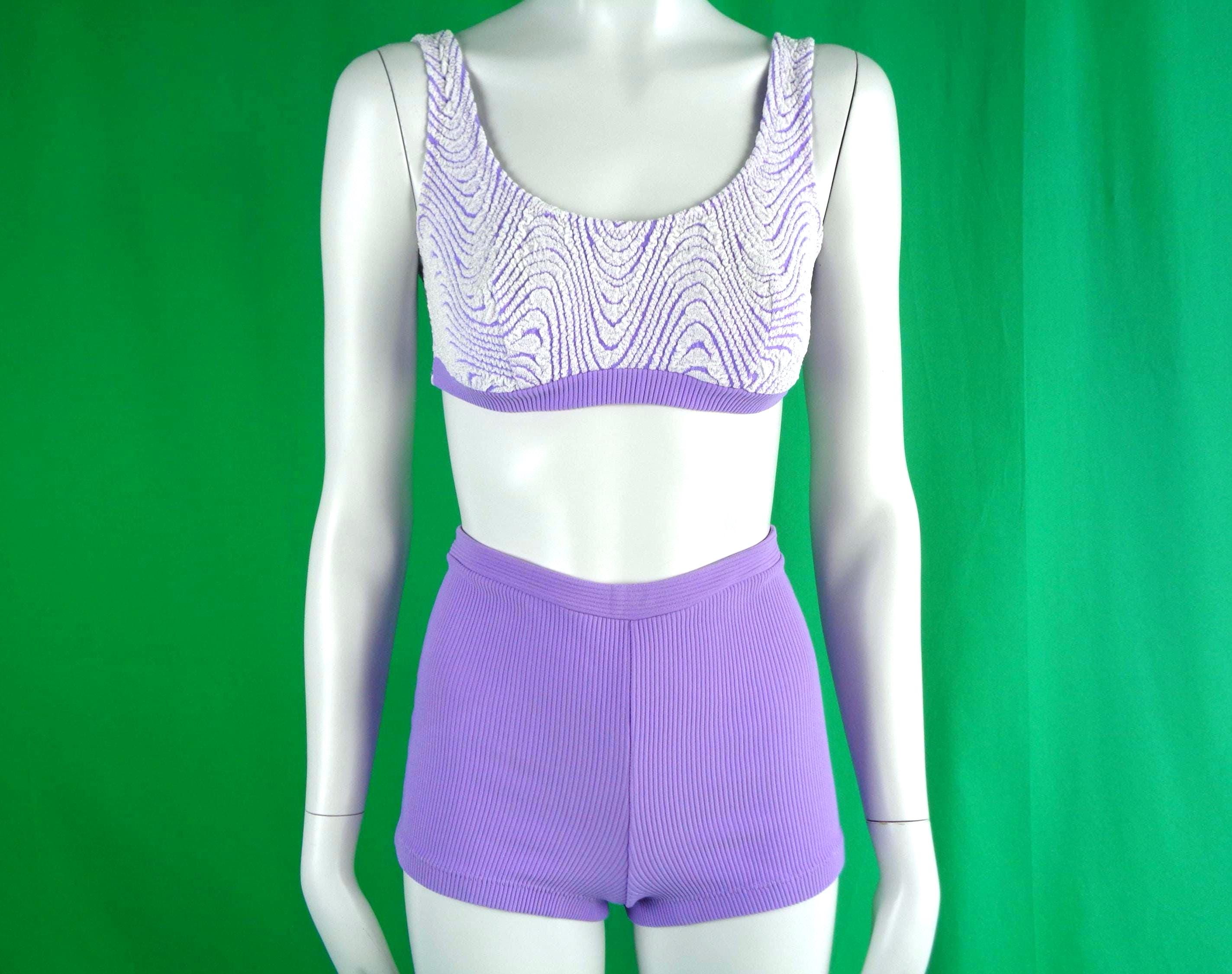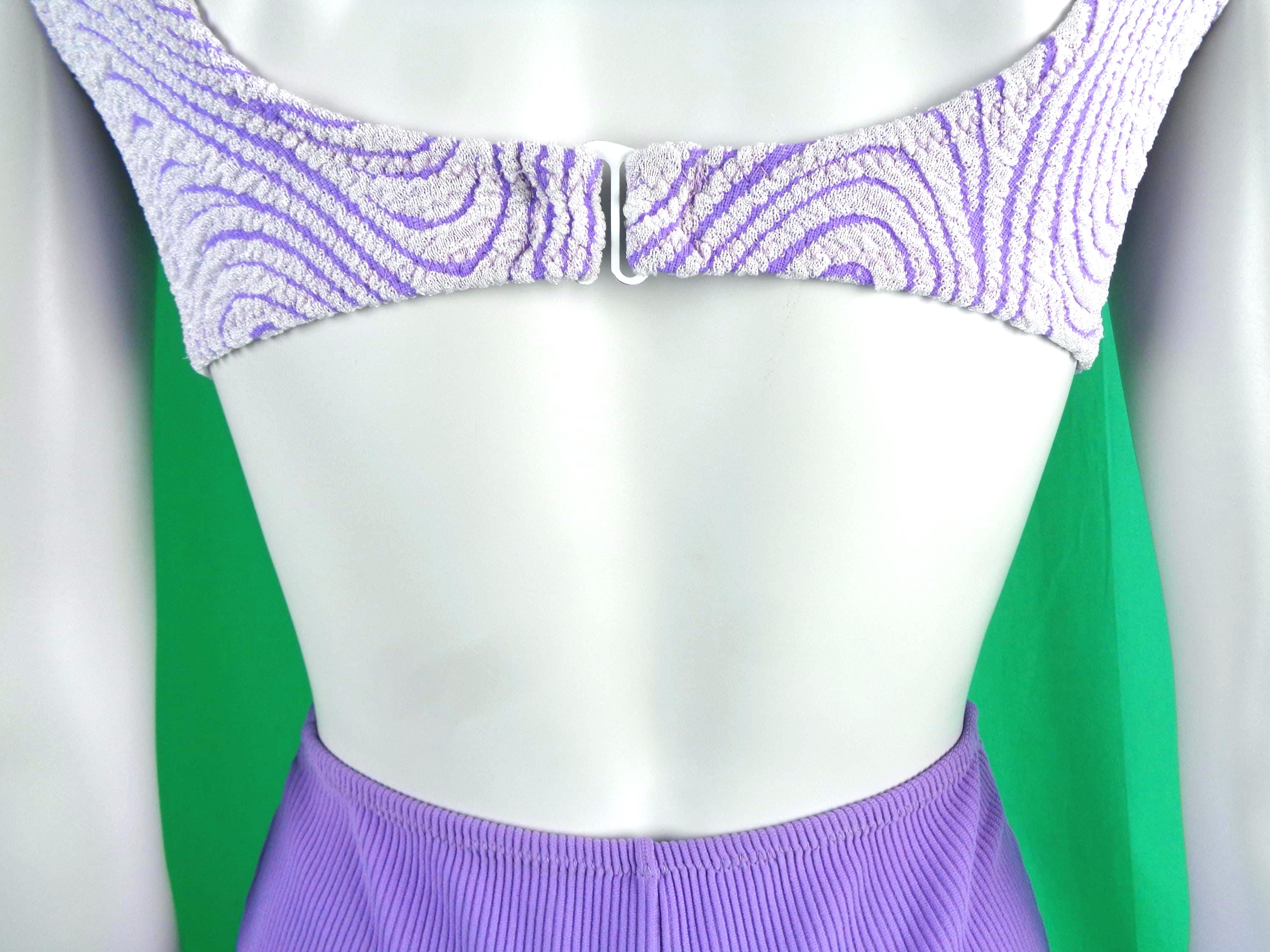 This lovely unique stylish 1960s retro Bikini, Bathing Swimsuit Wear, Bra Top, Booty Short Pants. Features a two tone pattern, design, high waist with rib bottoms, swirl design, pattern top, elastic stretch in the the top and bottoms, back hook closure, textured fabric, material throughout! Great compliment piece!