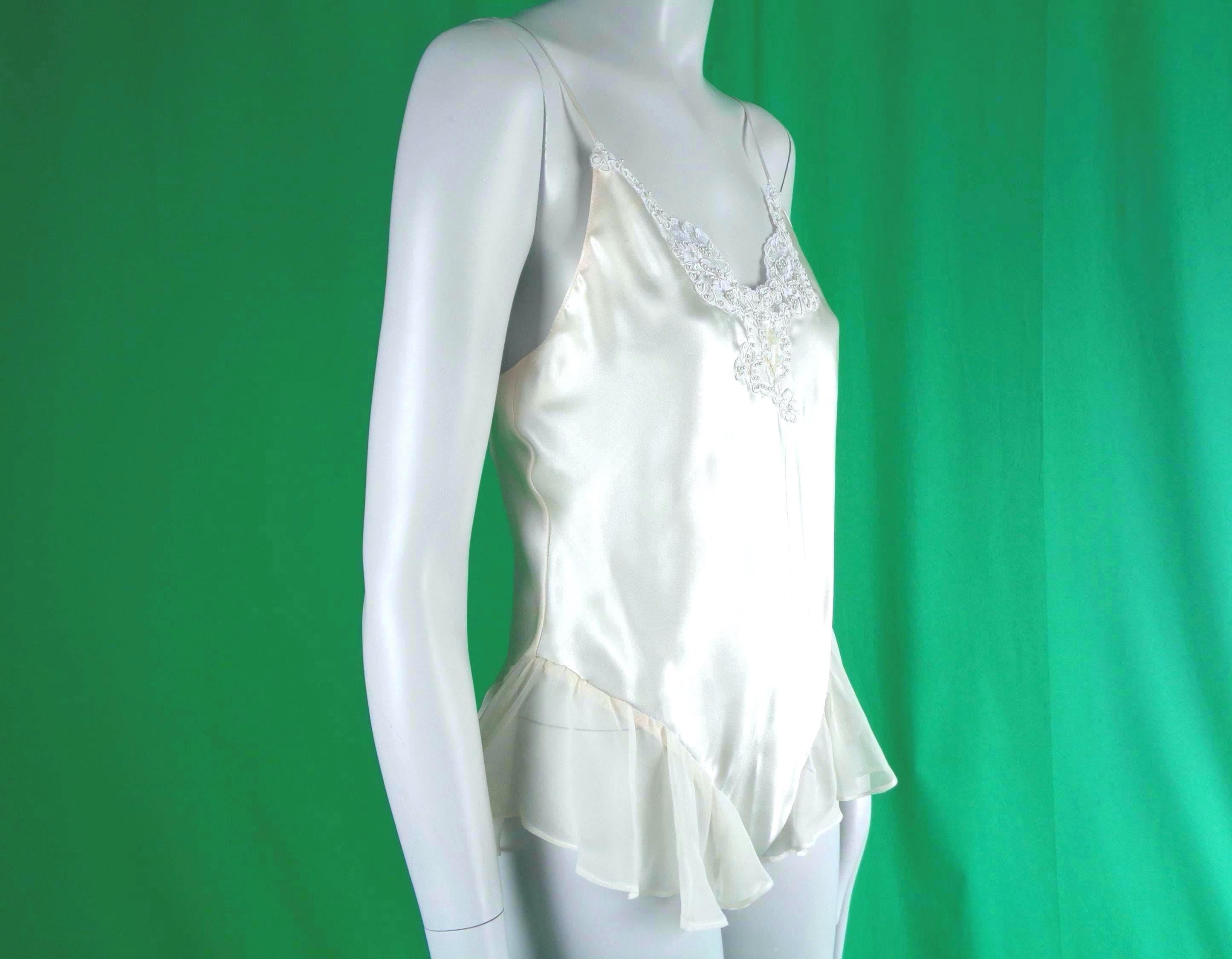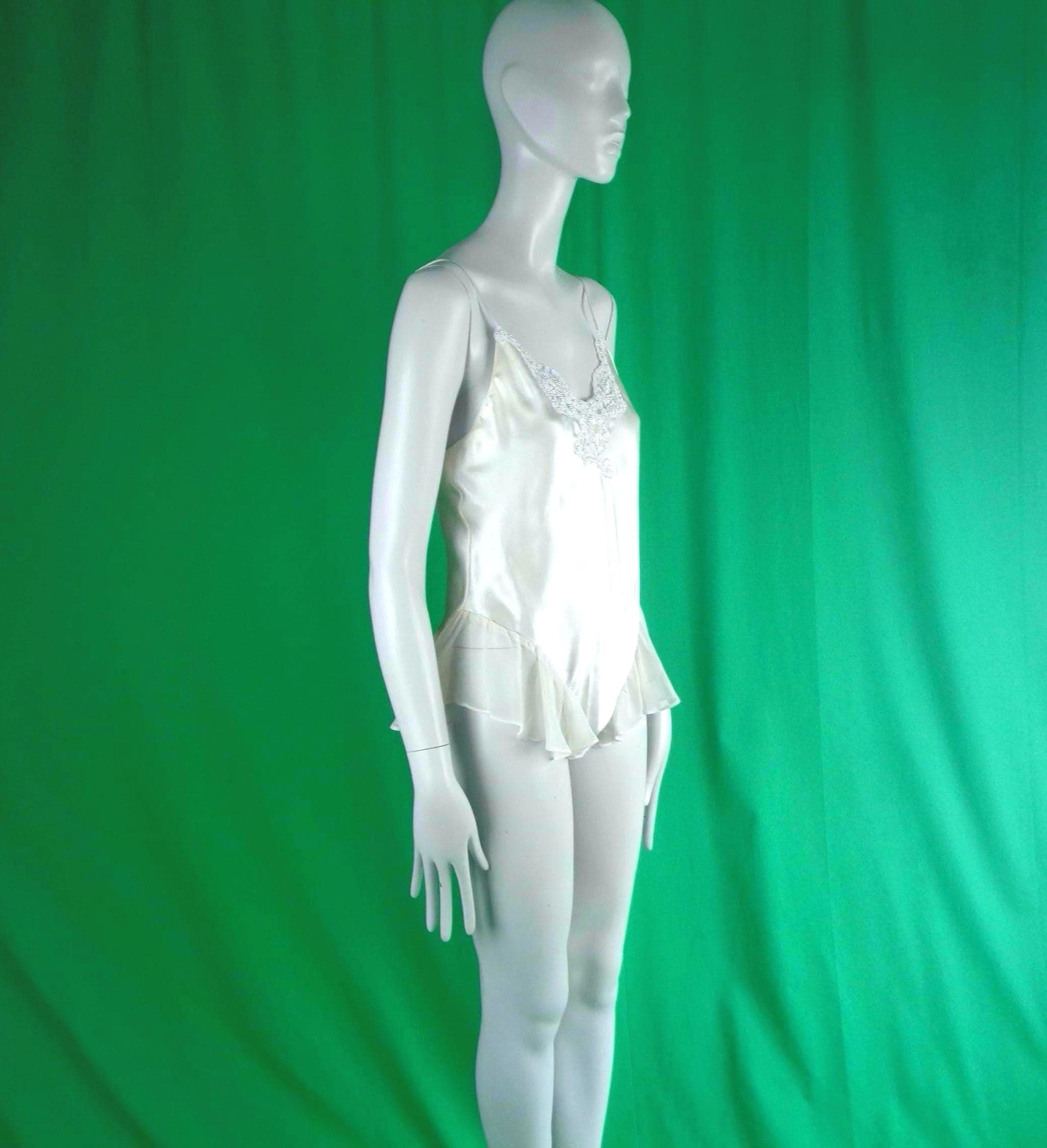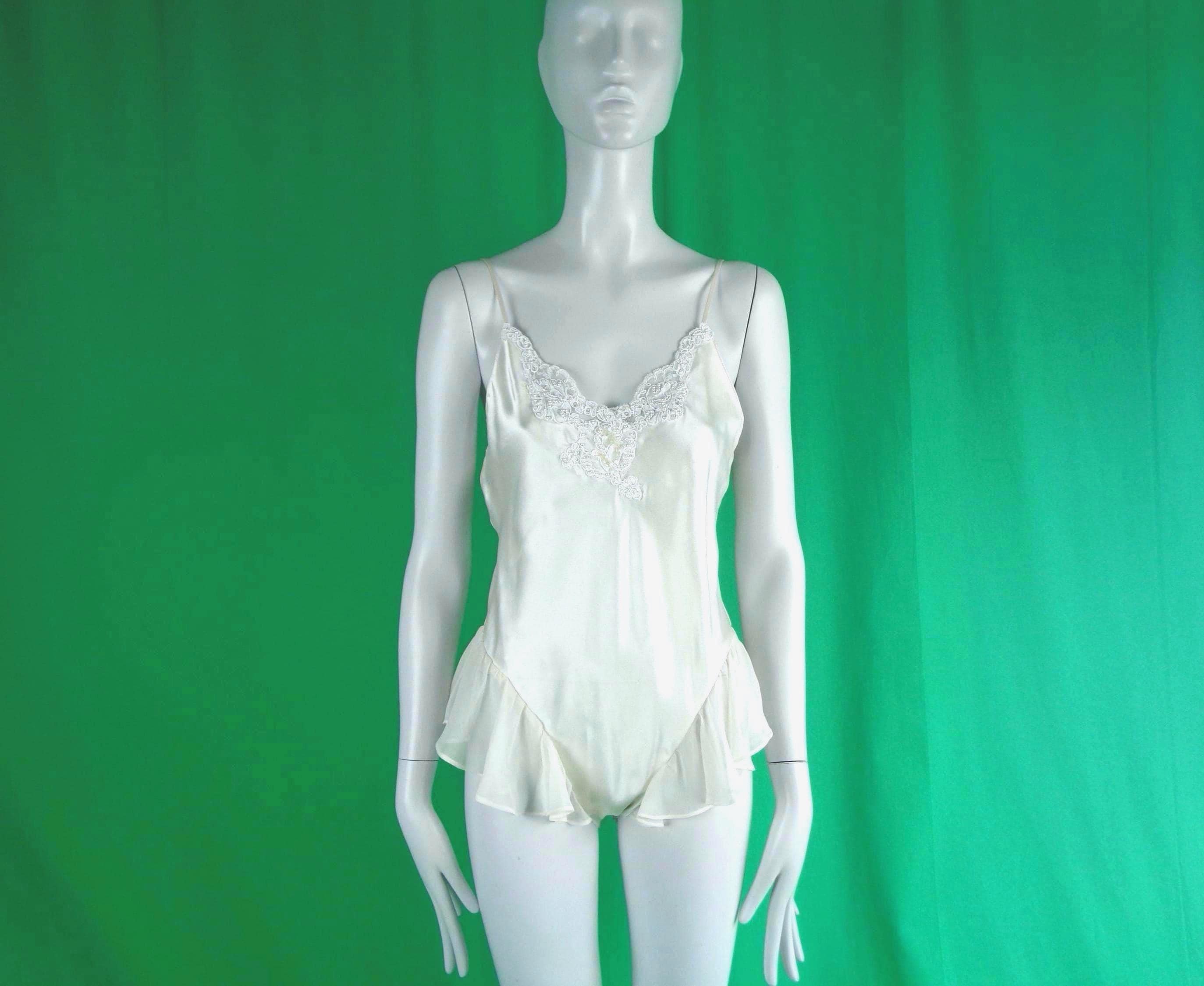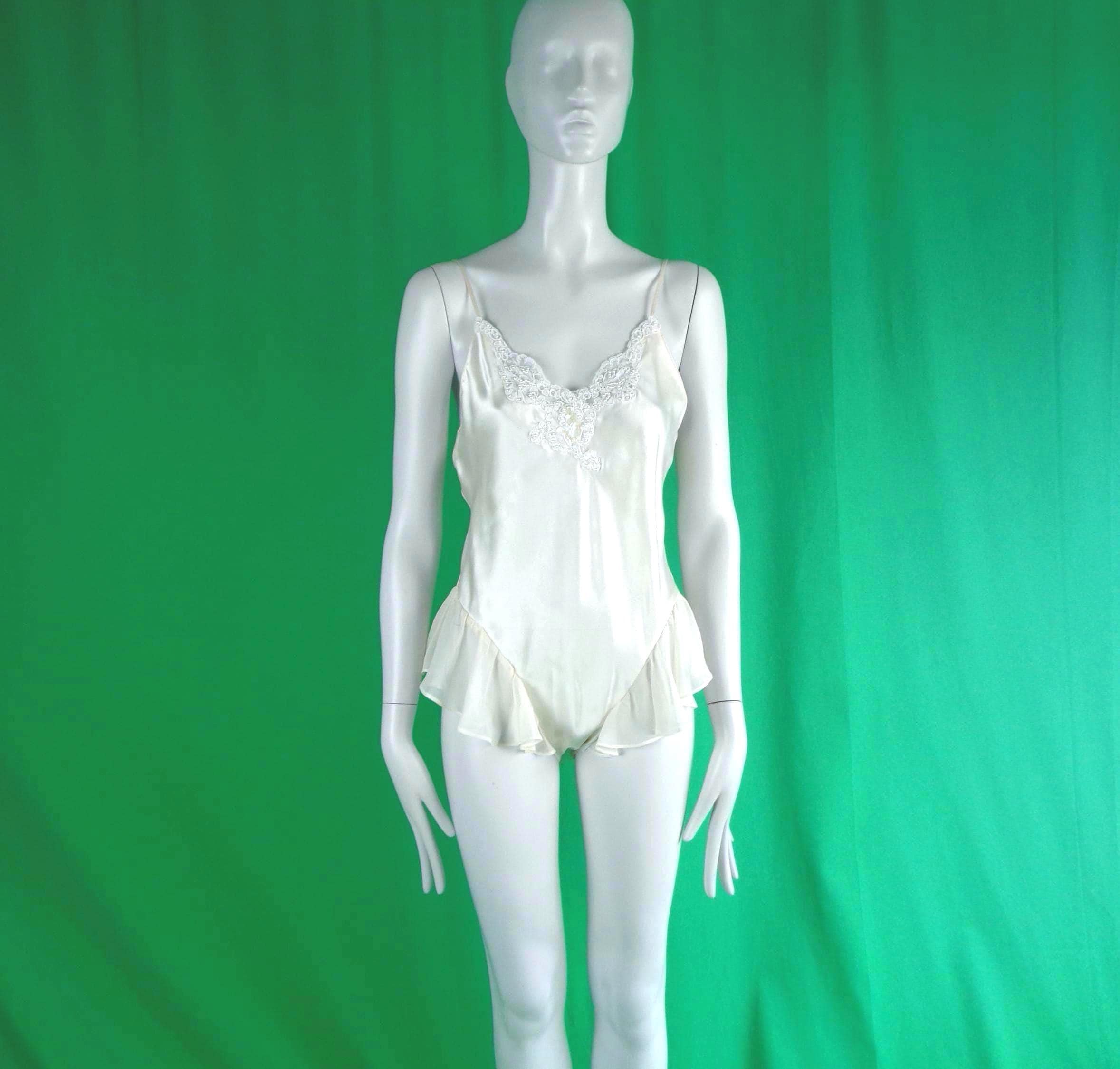 This lovely unique 1970s 1980s retro Teddy Lingerie Features spaghetti adjustable straps, beading detailing neckline, flare hips, snaps closure crotch, very soft silky fabric, material throughout! Great piece!