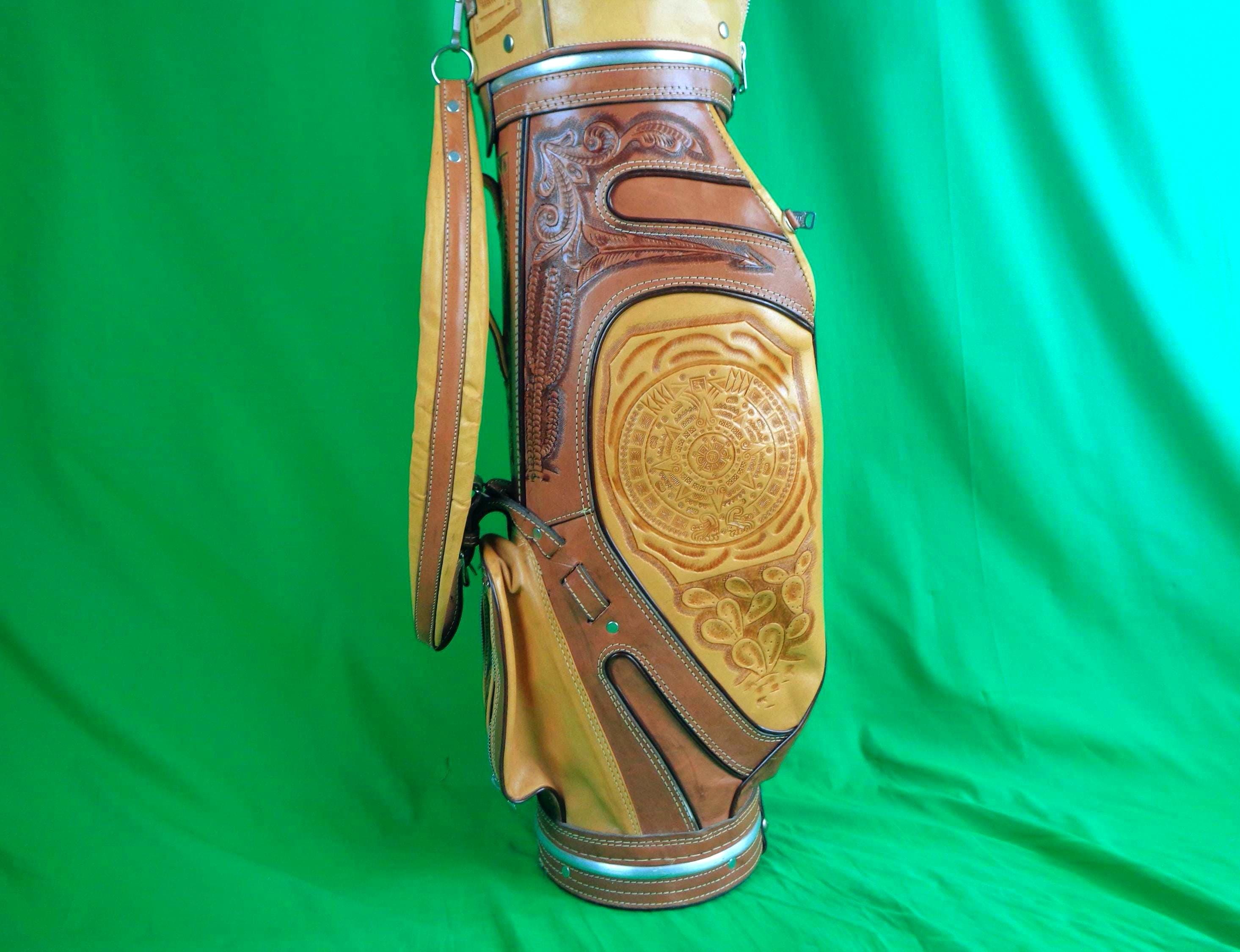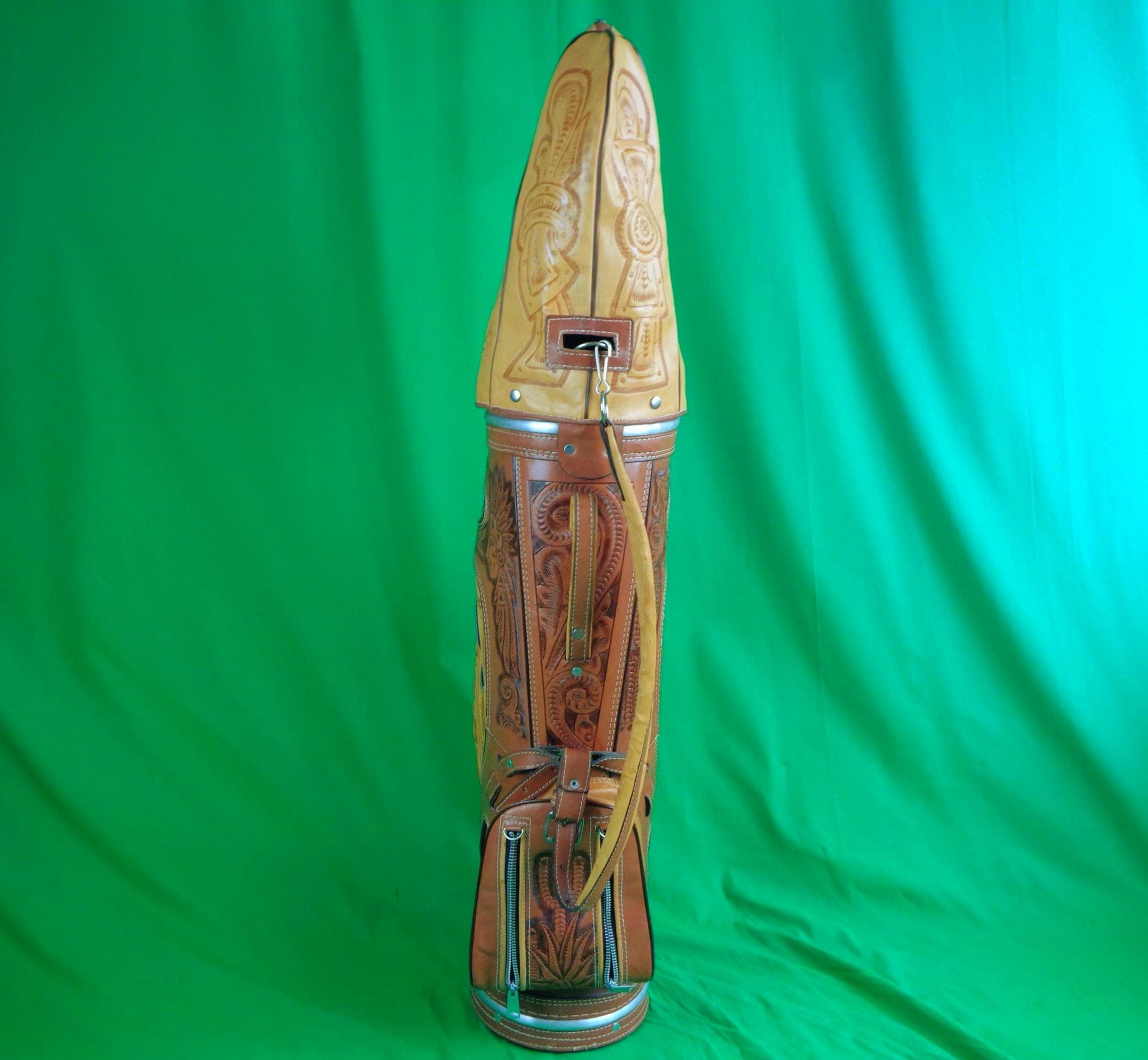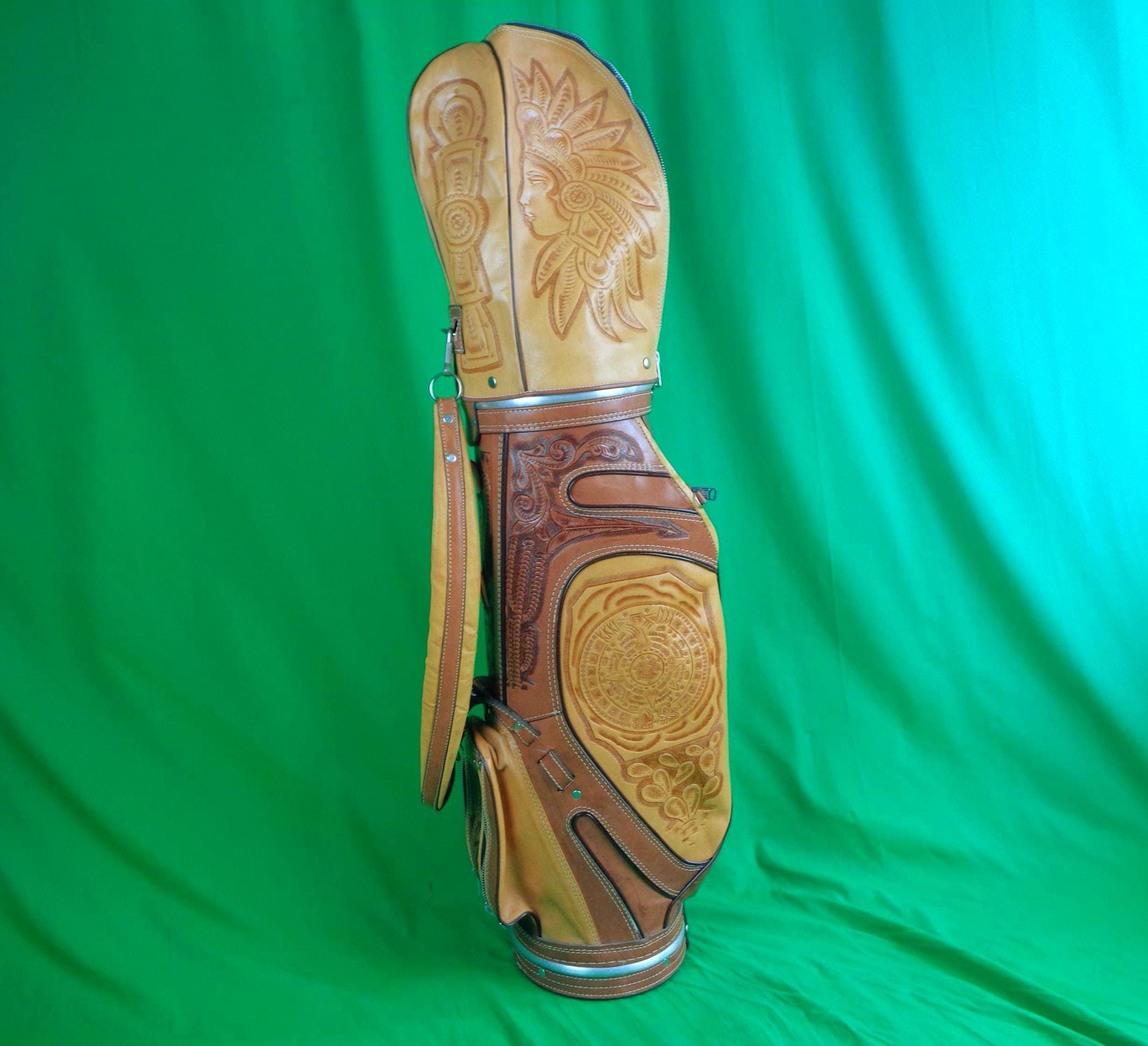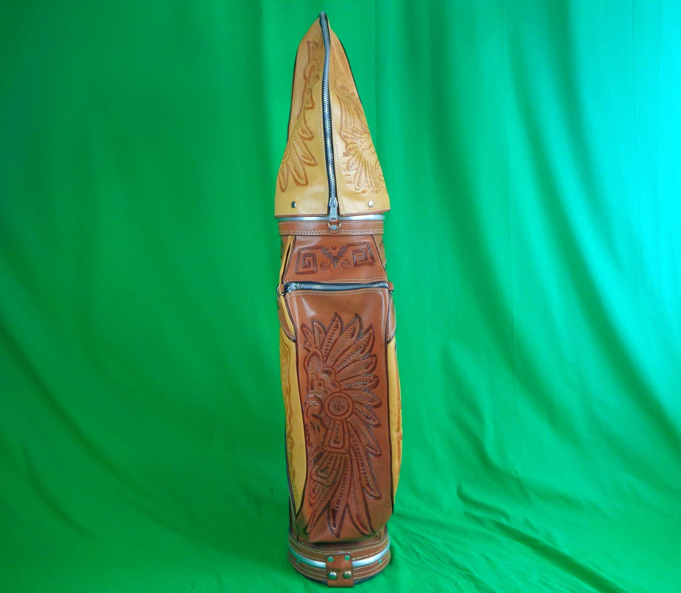 This lovely 1970s 1980s wonderfully hand crafted two-tone Figueroa leather tooled Aztec design Mexican golf bag.